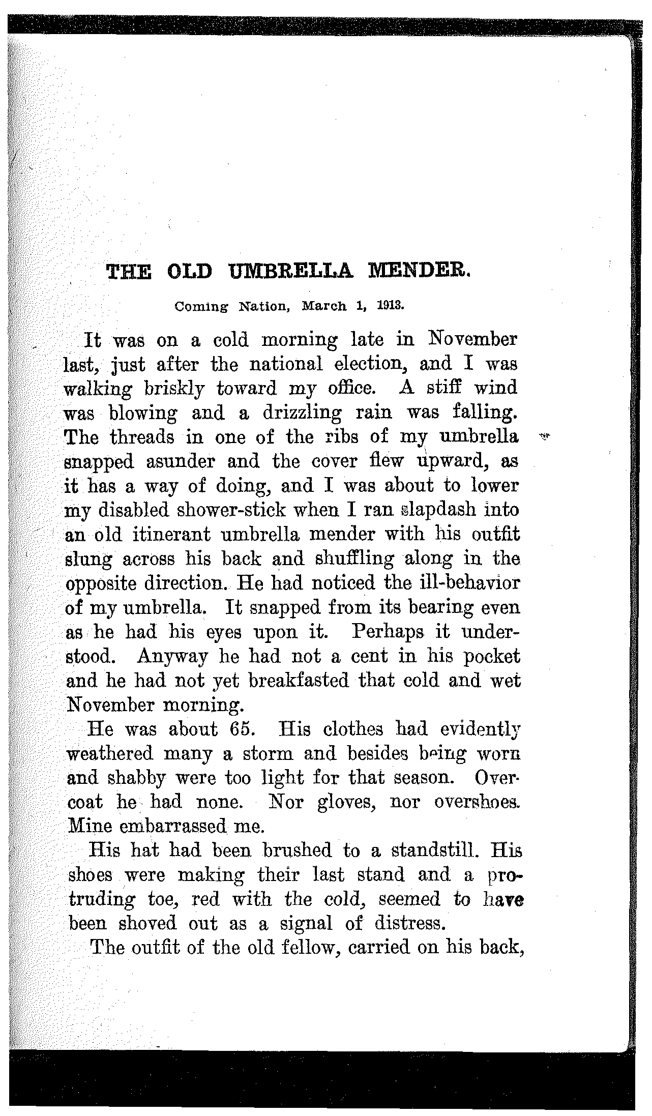It was on a cold morning late in November last, just after the national election, and I was walking briskly toward my office. A stiff wind was blowing and a drizzling rain was falling. The threads in one of the ribs of my umbrella snapped asunder and the cover flew upward, as it has a way of doing, and I was about to lower my disabled shower-stick when I ran slapdash into an old itinerant umbrella mender with his outfit slung across his back and shuffling along in the opposite direction. He had noticed the ill-behavior of my umbrella. It snapped from its bearing even as he had his eyes upon it. Perhaps it understood. Anyway he had not a cent in his pocket and he had not yet breakfasted that cold and wet November morning.