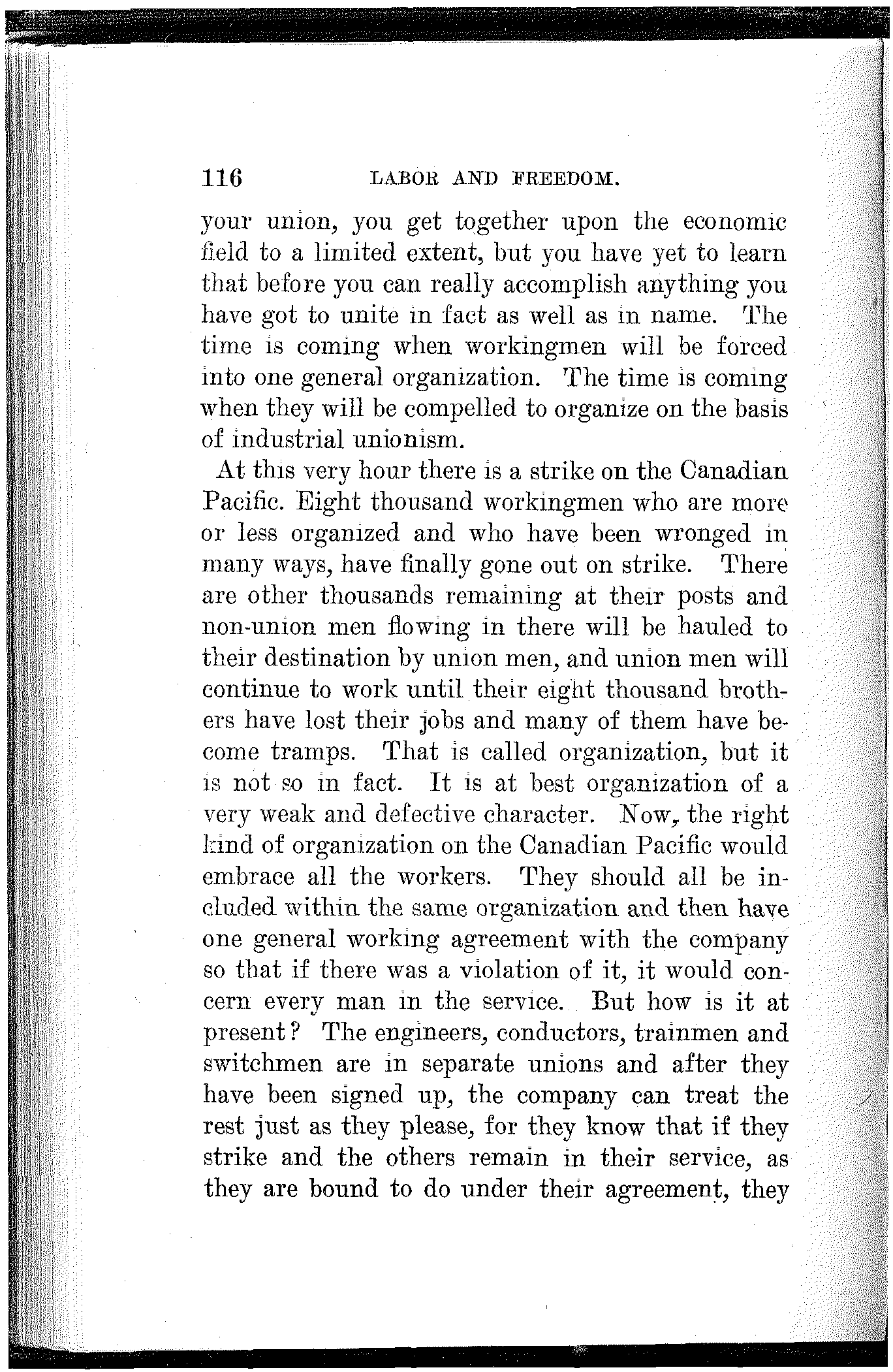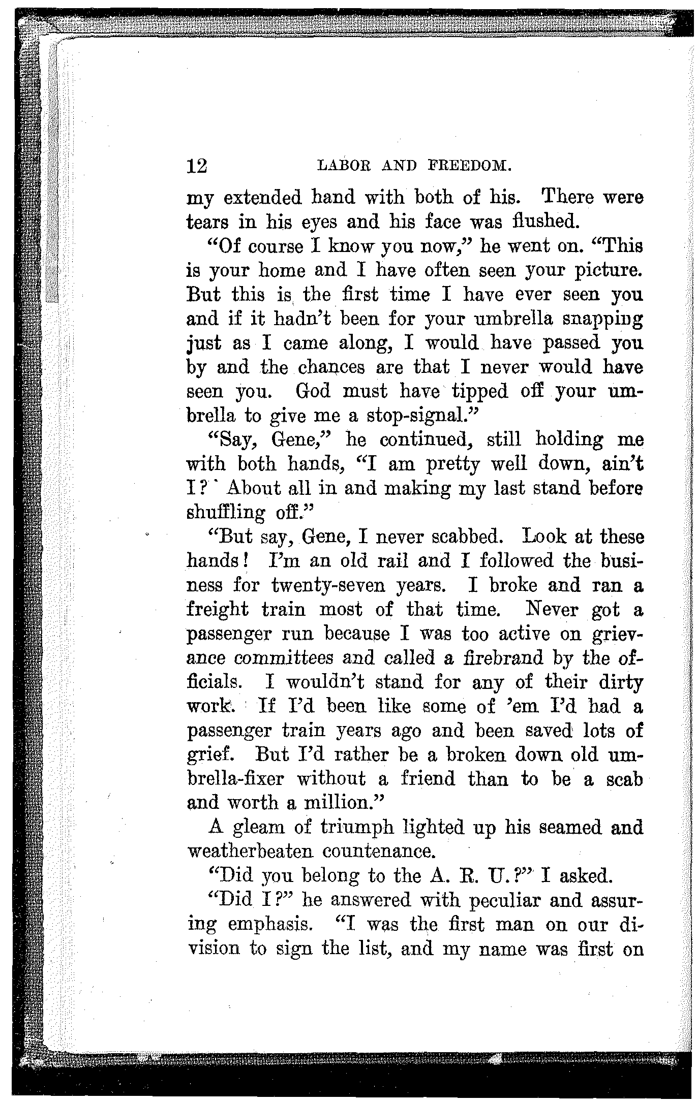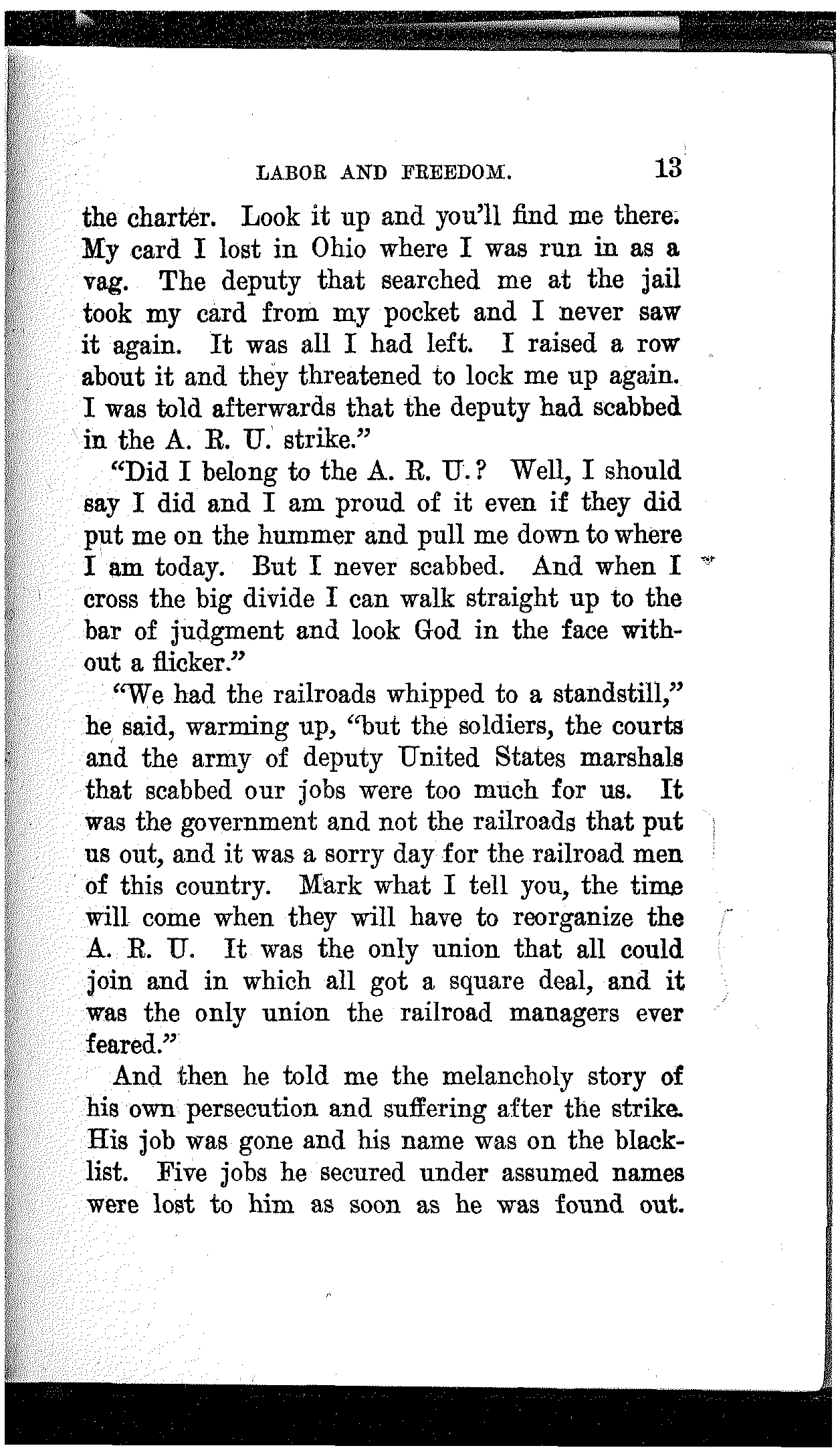 "Did I belong to the A. R. U.? Well, I should say I did and I am proud of it even if they did put me on the hummer and pull me down to where I am today. But I never scabbed. And when I cross the big divide I can walk straight up to the bar of judgment and look God in the face without a flicker."