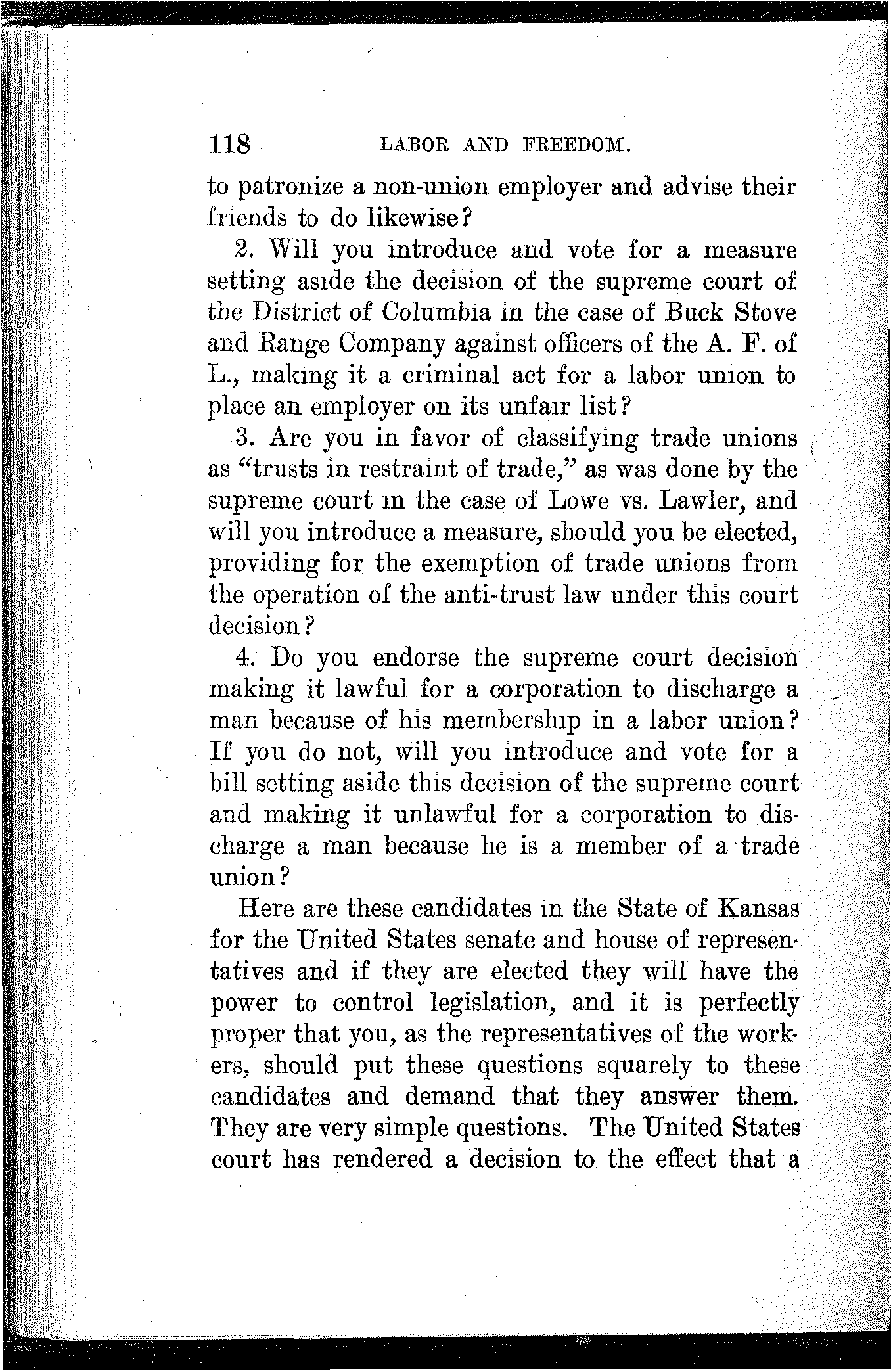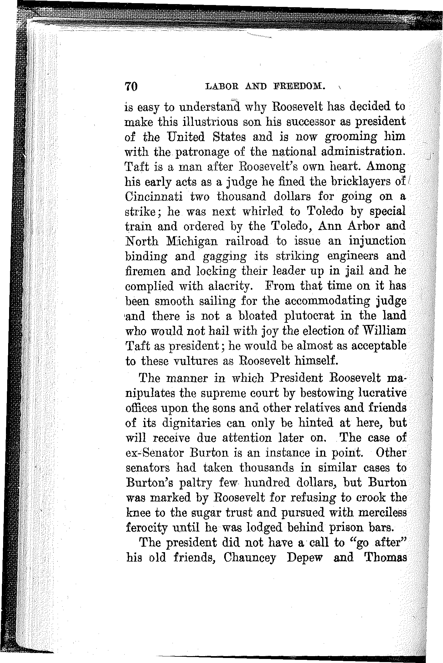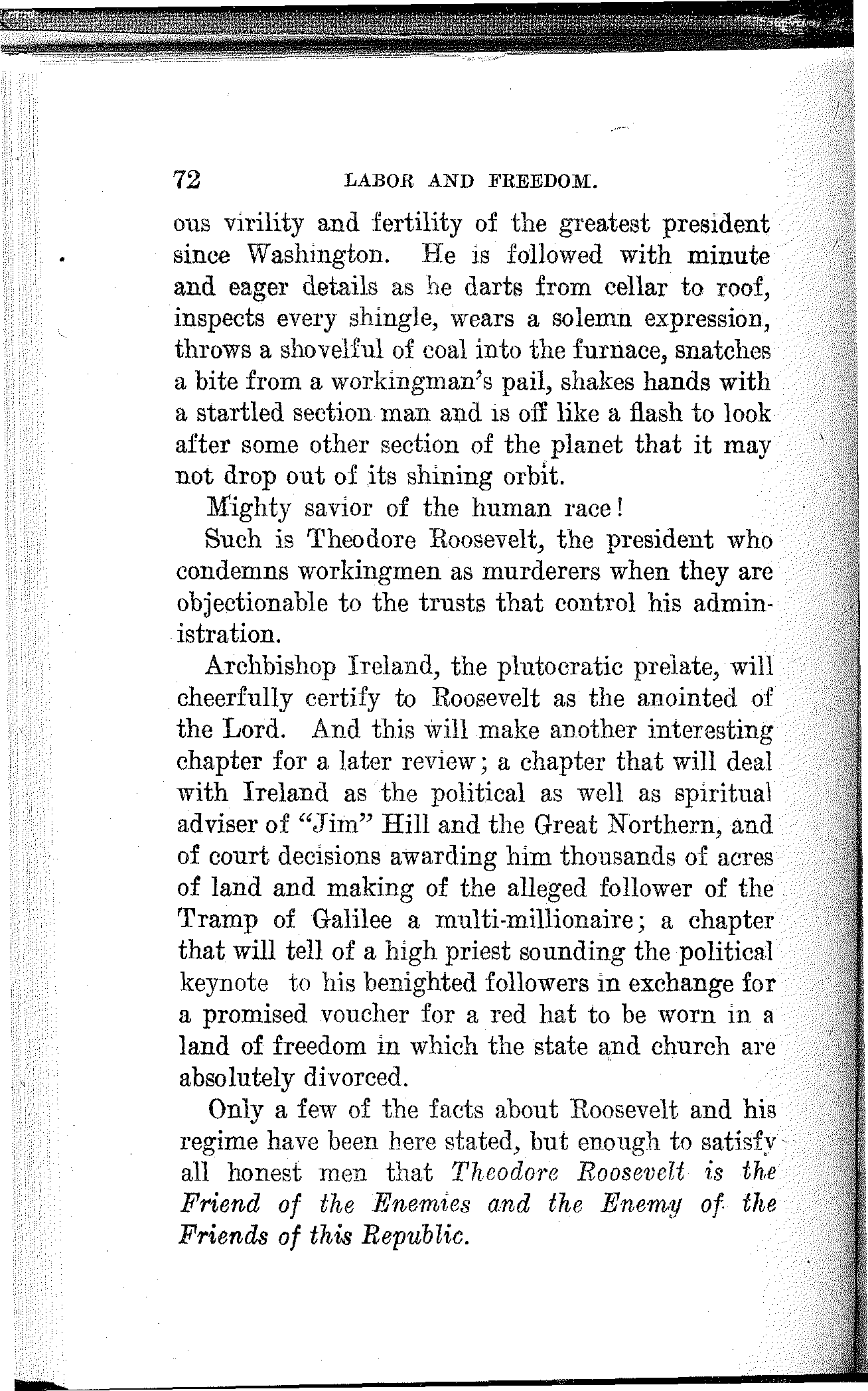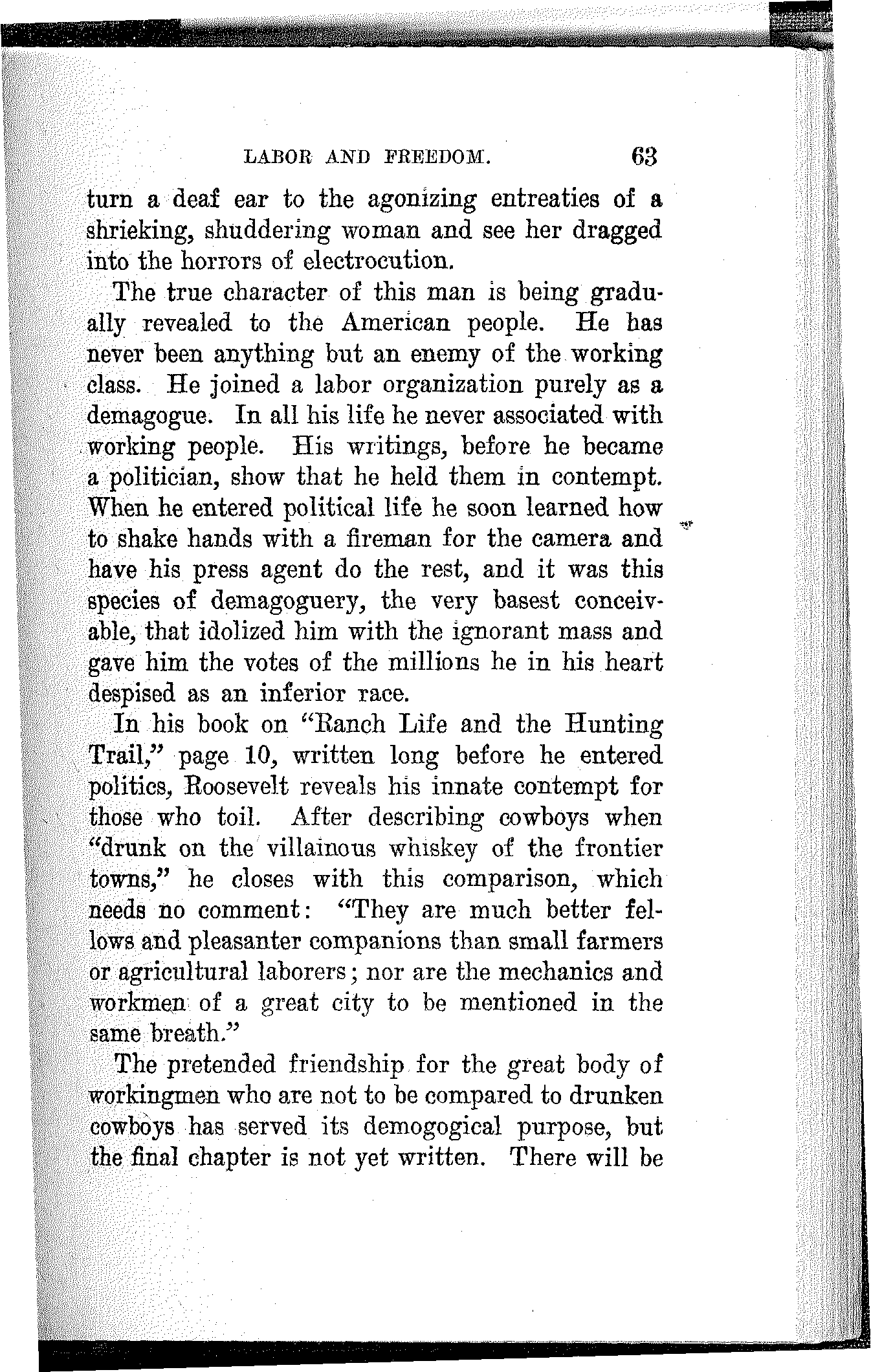 "Did I belong to the A. R. U.? Well, I should say I did and I am proud of it even if they did put me on the hummer and pull me down to where I am today. But I never scabbed. And when I cross the big divide I can walk straight up to the bar of judgment and look God in the face without a flicker."