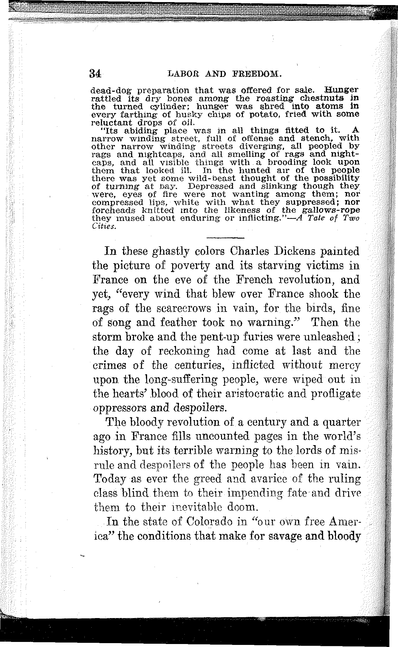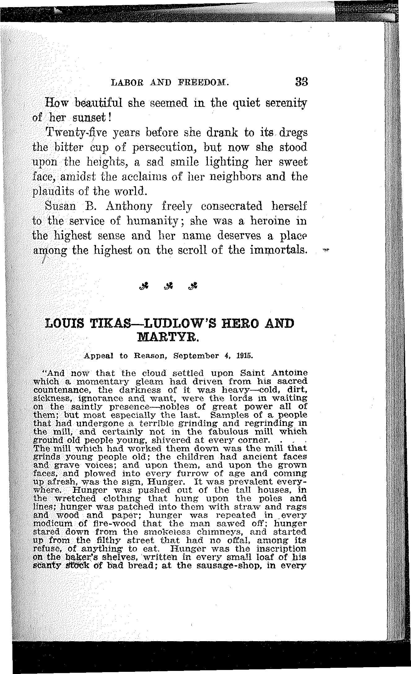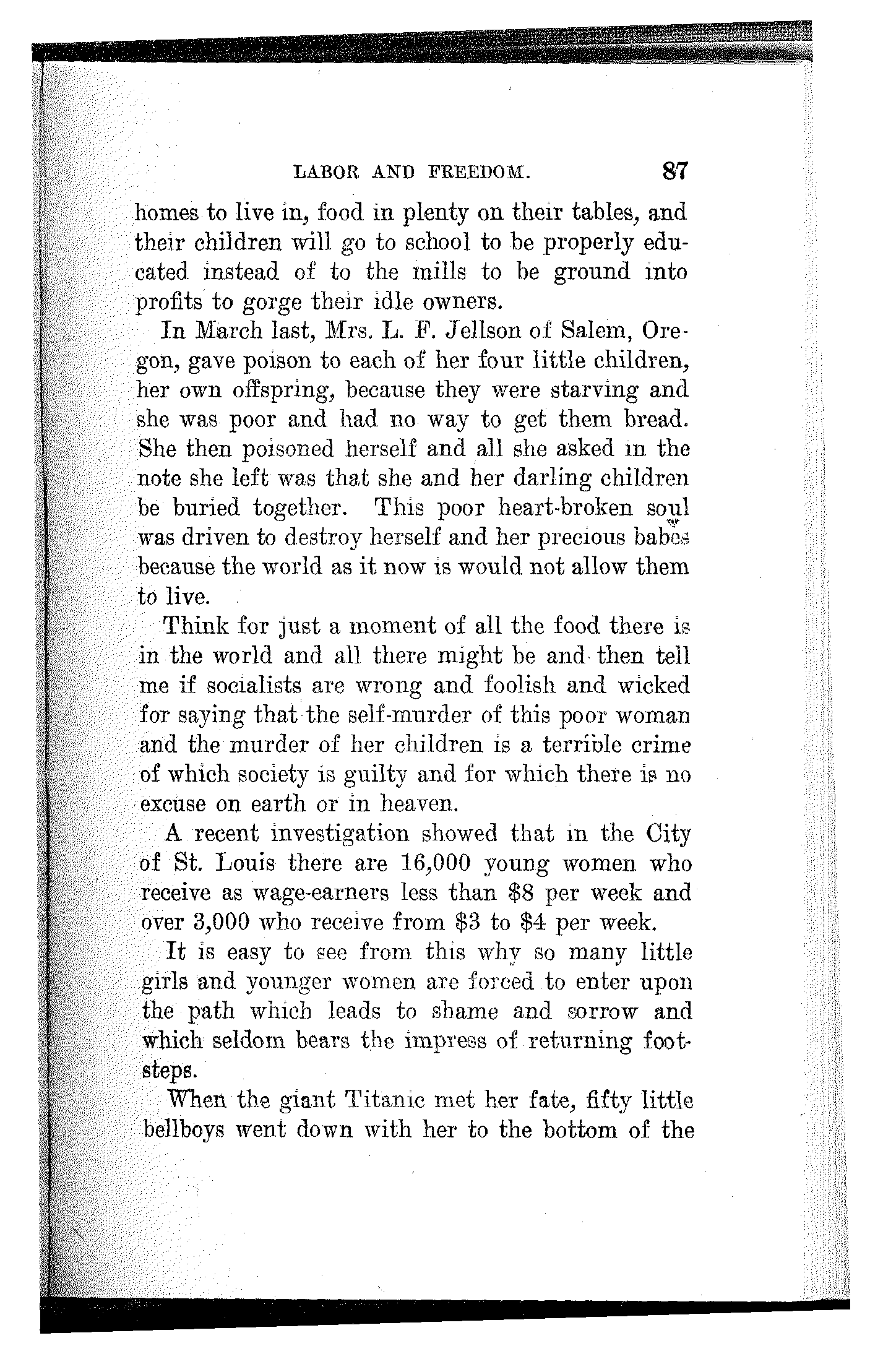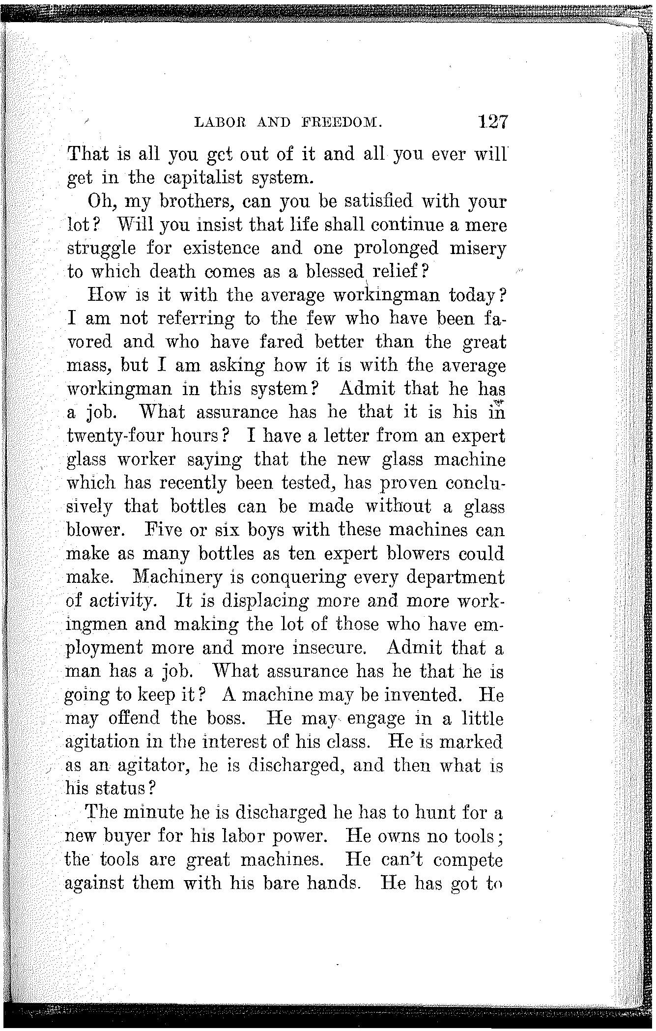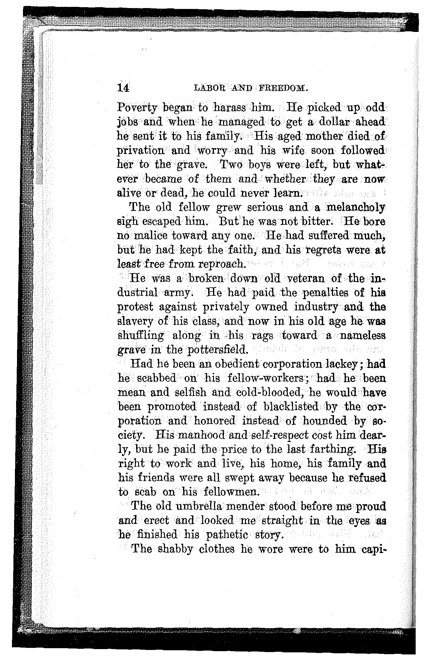 And then he told me the melancholy story of his own persecution and suffering after the strike. His job was gone and his name was on the blacklist. Five jobs he secured under assumed names were lost to him as soon as he was found out.[14] Poverty began to harass him. He picked up odd jobs and when he managed to get a dollar ahead he sent it to his family. His aged mother died of privation and worry and his wife soon followed her to the grave. Two boys were left, but whatever became of them and whether they are now alive or dead, he could never learn.