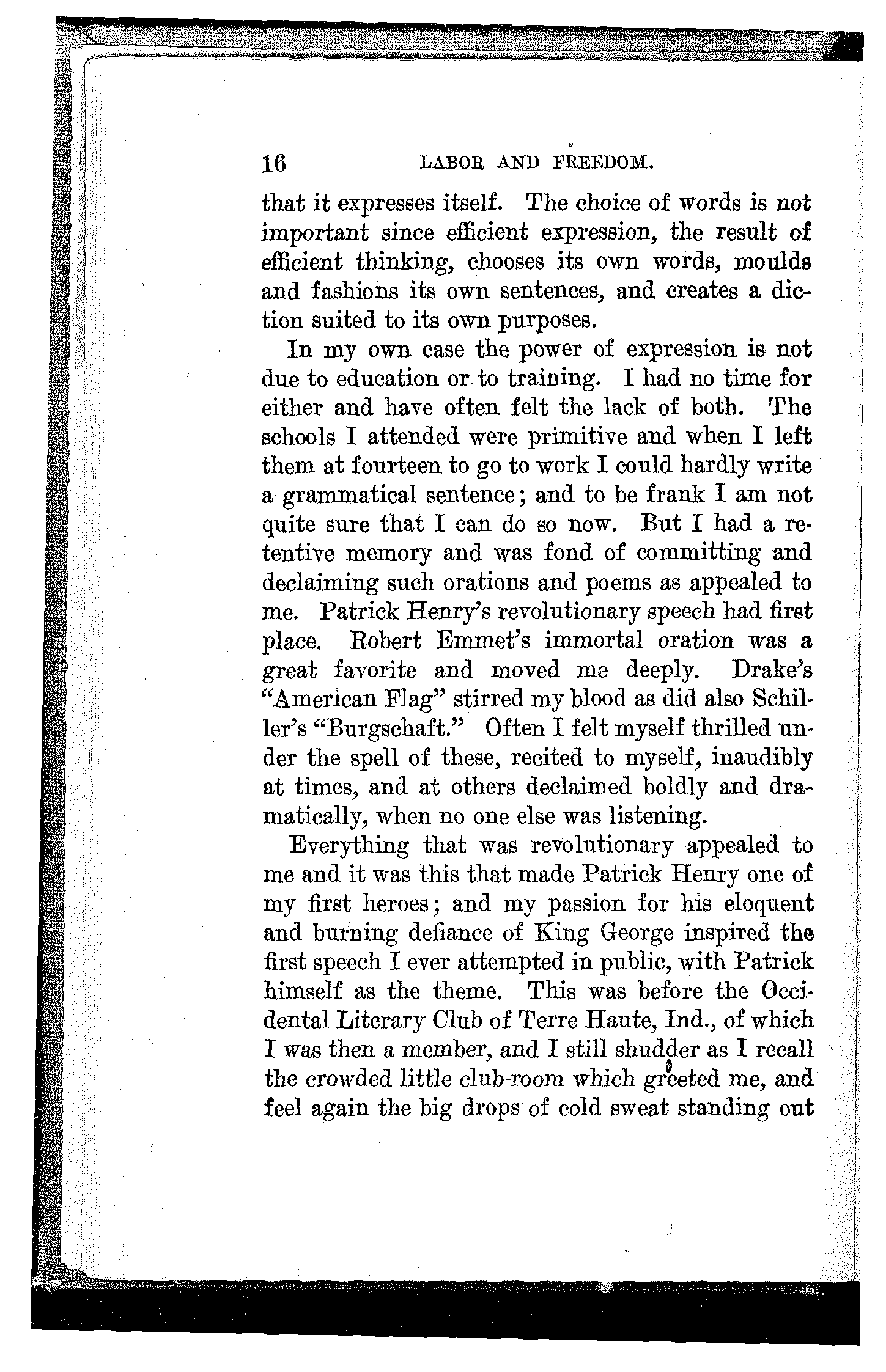 Everything that was revolutionary appealed to me and it was this that made Patrick Henry one of my first heroes; and my passion for his eloquent and burning defiance of King George inspired the first speech I ever attempted in public, with Patrick himself as the theme. This was before the Occidental Literary Club of Terre Haute, Ind., of which I was then a member, and I still shudder as I recall the crowded little club-room which greeted me, and feel again the big drops of cold sweat standing out[17] all over me as I realized the plight I was in and the utter hopelessness of escape.