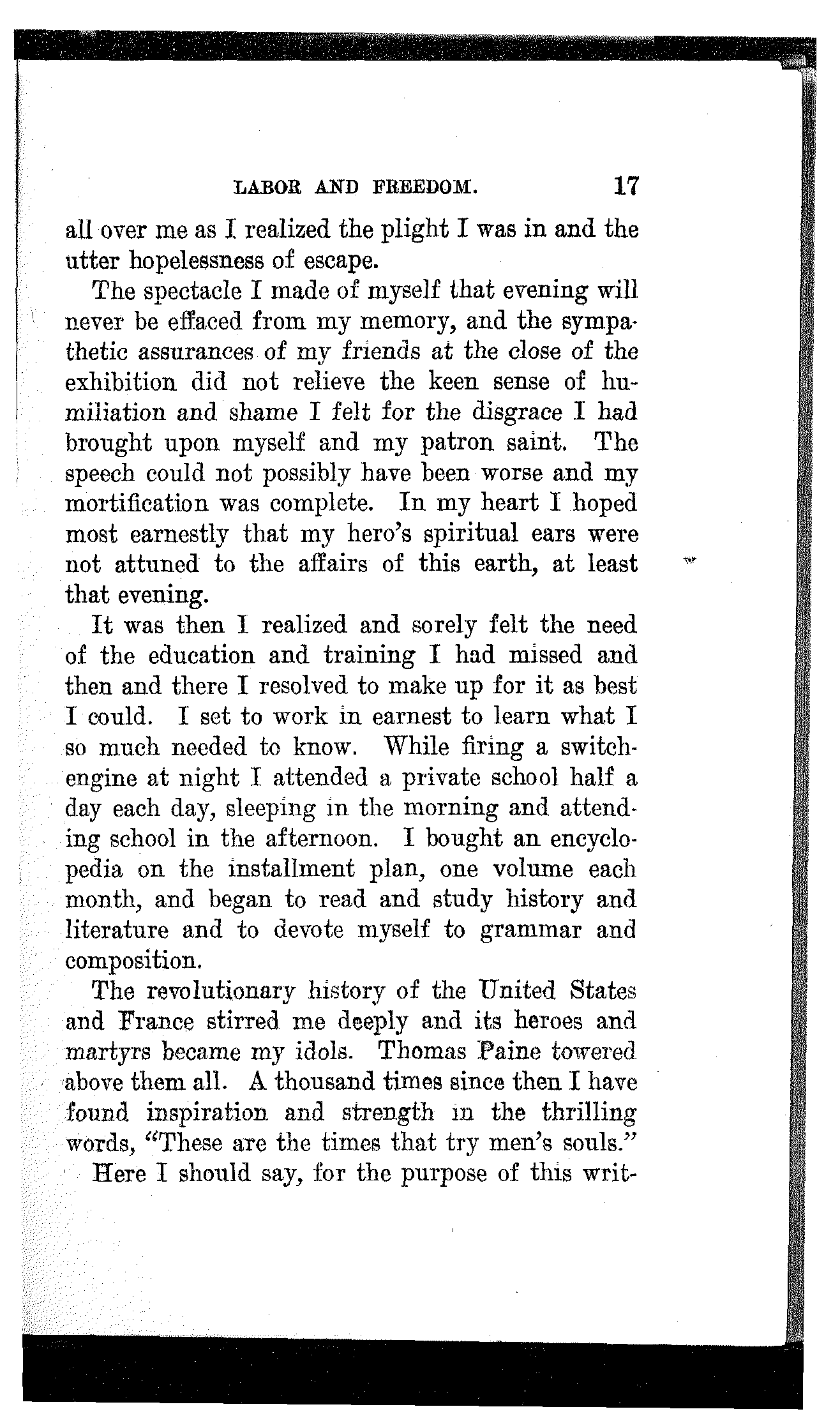 It was then I realized and sorely felt the need of the education and training I had missed and then and there I resolved to make up for it as best I could. I set to work in earnest to learn what I so much needed to know. While firing a switch-engine at night I attended a private school half a day each day, sleeping in the morning and attending school in the afternoon. I bought an encyclopedia on the installment plan, one volume each month, and began to read and study history and literature and to devote myself to grammar and composition.