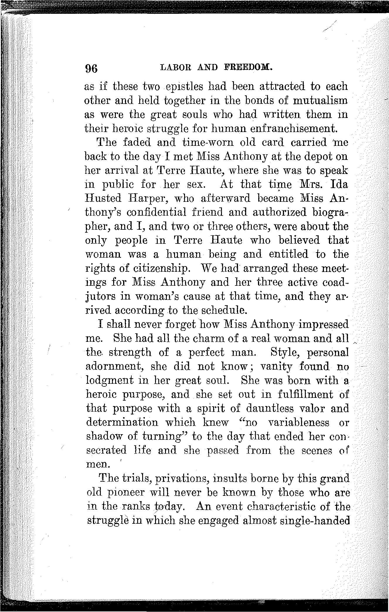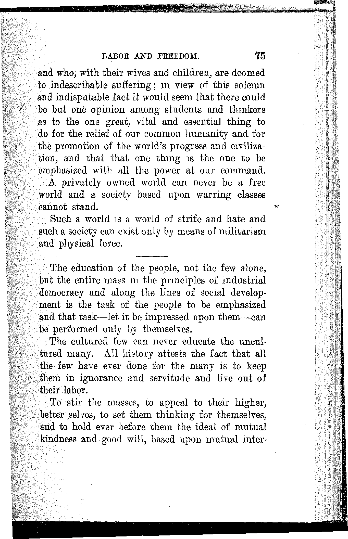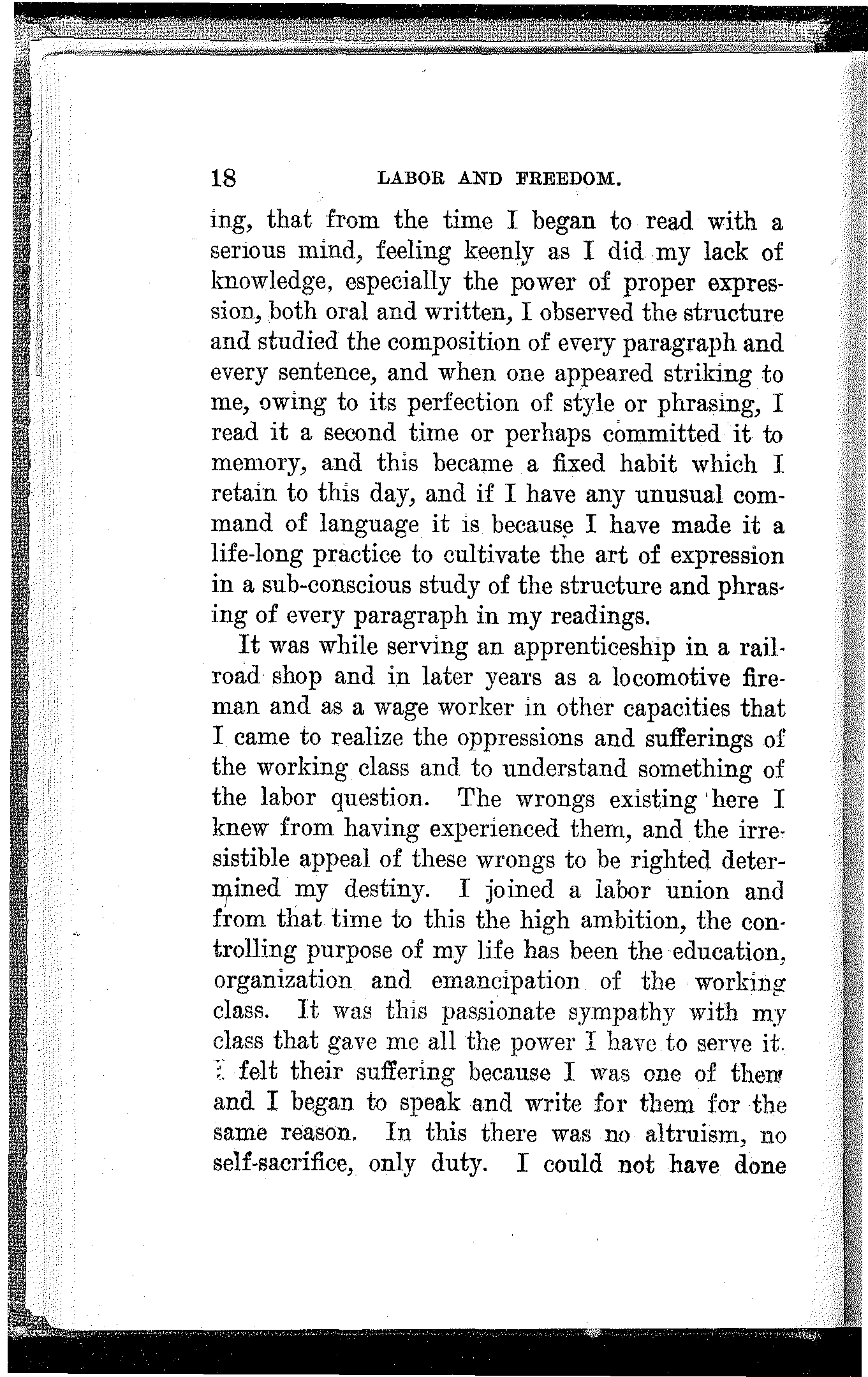 It was while serving an apprenticeship in a railroad shop and in later years as a locomotive fireman and as a wage worker in other capacities that I came to realize the oppressions and sufferings of the working class and to understand something of the labor question. The wrongs existing here I knew from having experienced them, and the irresistible appeal of these wrongs to be righted determined my destiny. I joined a labor union and from that time to this the high ambition, the controlling purpose of my life has been the education, organization and emancipation of the working class. It was this passionate sympathy with my class that gave me all the power I have to serve it. I felt their suffering because I was one of them and I began to speak and write for them for the same reason. In this there was no altruism, no self-sacrifice, only duty. I could not have done[19] otherwise. Had I attempted it I should have failed. Such as I have been and am, I had to be.