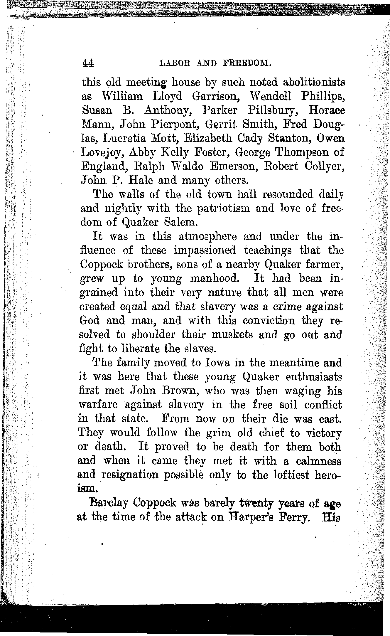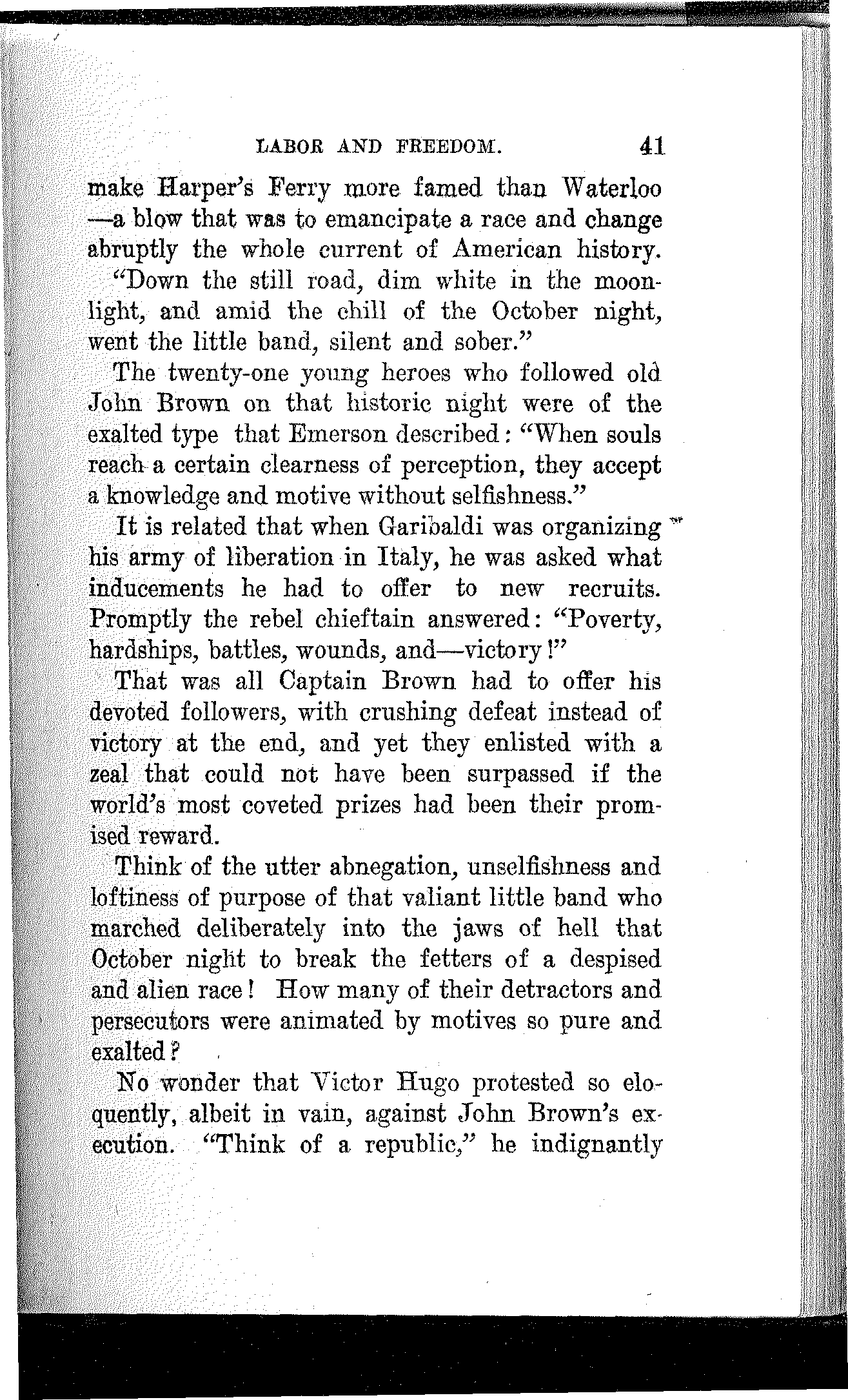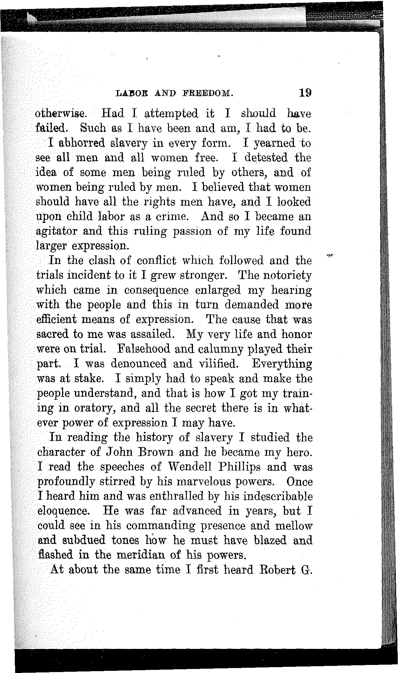In reading the history of slavery I studied the character of John Brown and he became my hero. I read the speeches of Wendell Phillips and was profoundly stirred by his marvelous powers. Once I heard him and was enthralled by his indescribable eloquence. He was far advanced in years, but I could see in his commanding presence and mellow and subdued tones how he must have blazed and flashed in the meridian of his powers.
