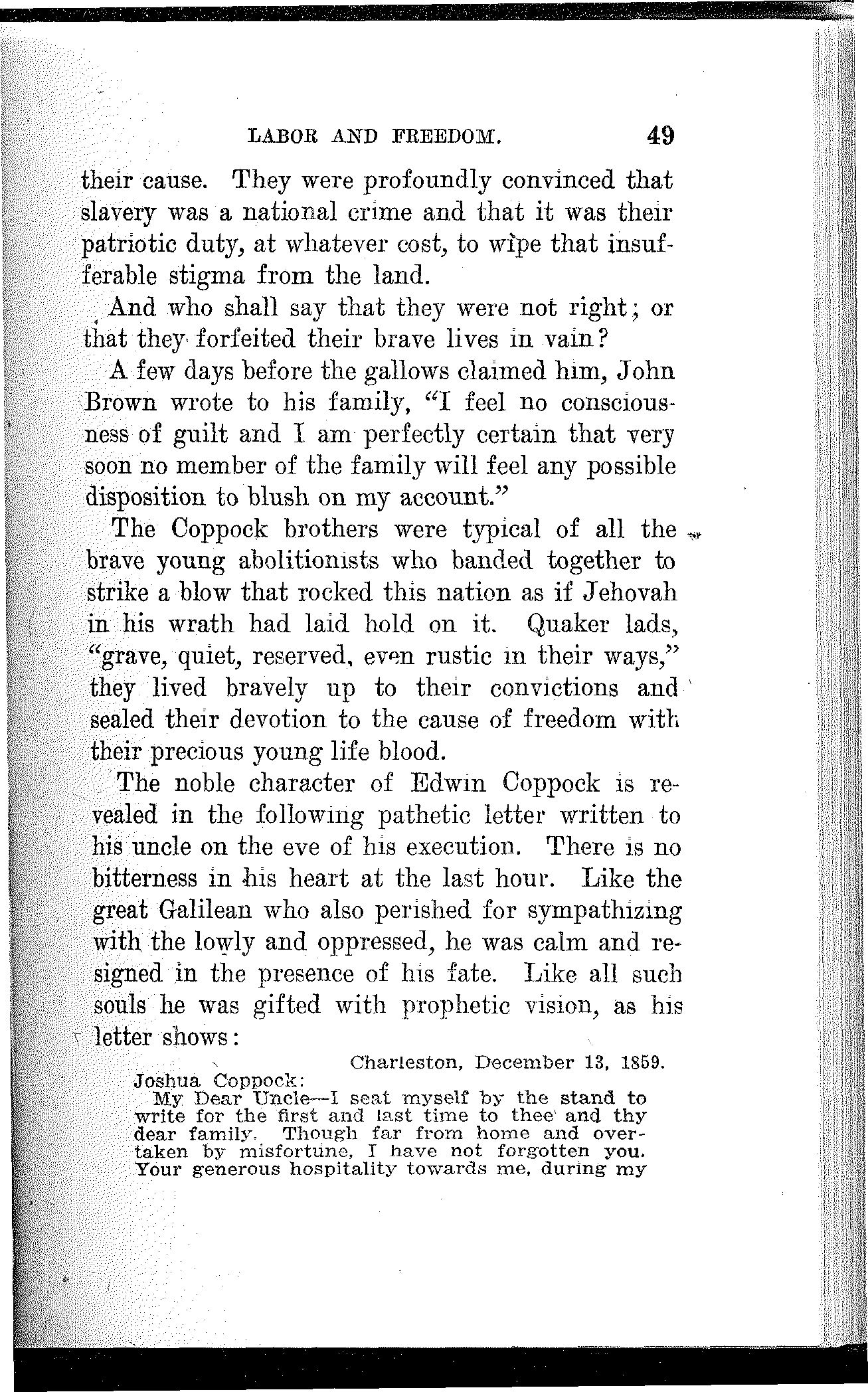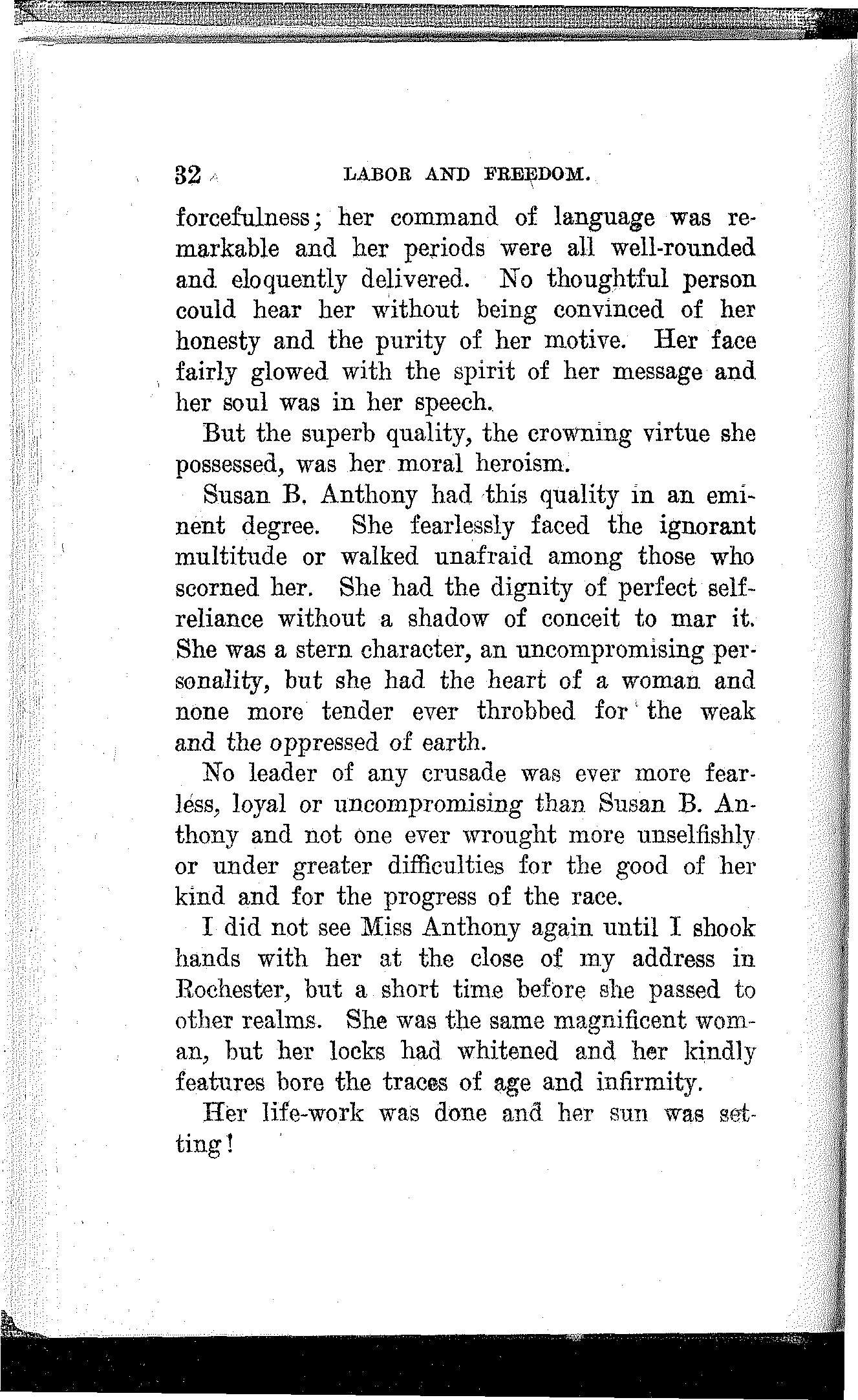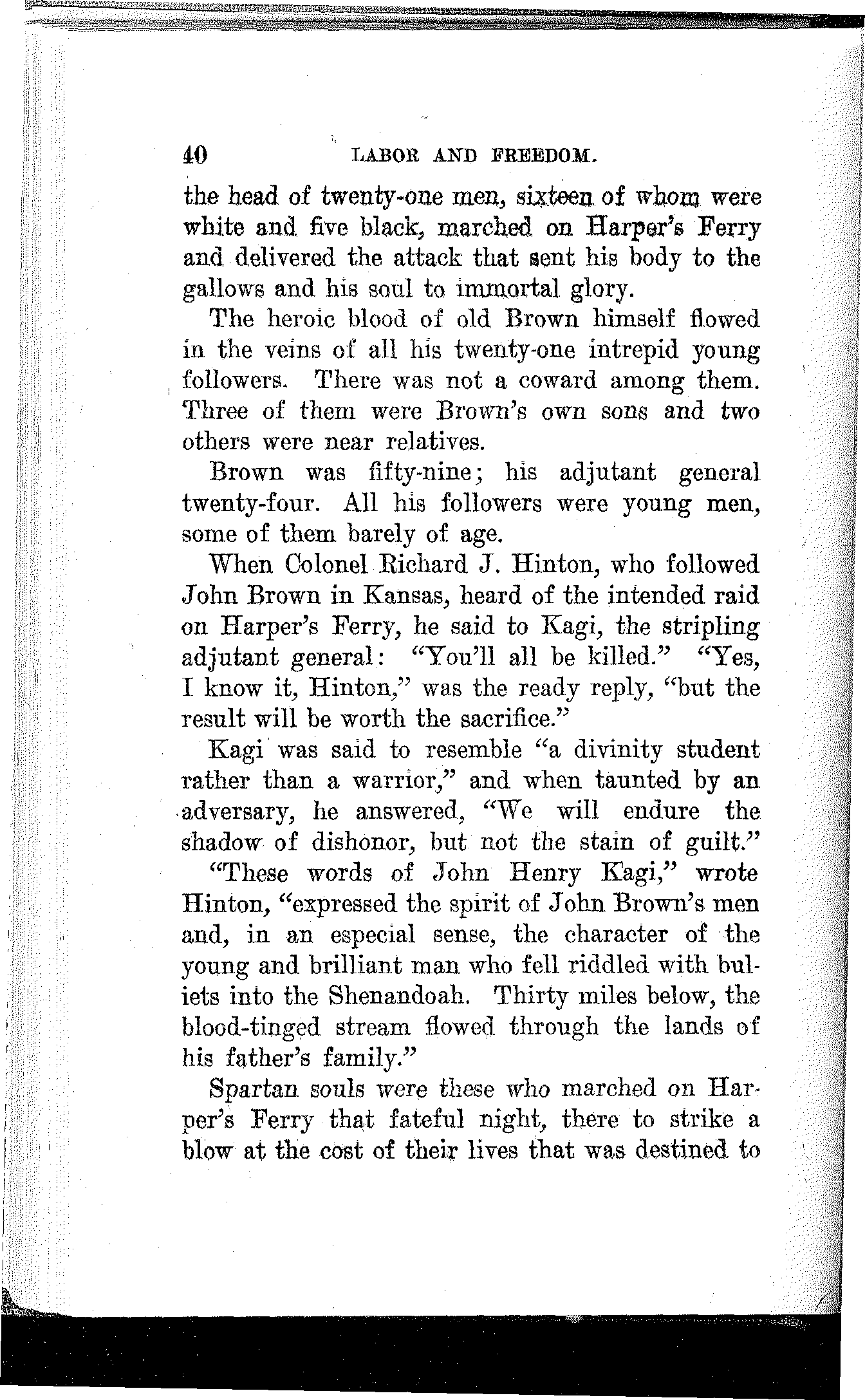 In reading the history of slavery I studied the character of John Brown and he became my hero. I read the speeches of Wendell Phillips and was profoundly stirred by his marvelous powers. Once I heard him and was enthralled by his indescribable eloquence. He was far advanced in years, but I could see in his commanding presence and mellow and subdued tones how he must have blazed and flashed in the meridian of his powers.
