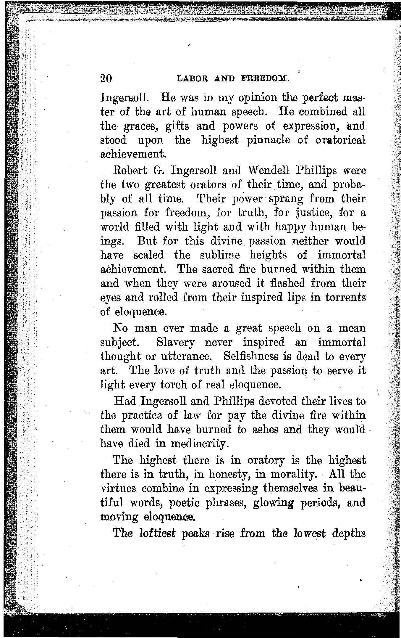 Robert G. Ingersoll and Wendell Phillips were the two greatest orators of their time, and probably of all time. Their power sprang from their passion for freedom, for truth, for justice, for a world filled with light and with happy human beings. But for this divine passion neither would have scaled the sublime heights of immortal achievement. The sacred fire burned within them and when they were aroused it flashed from their eyes and rolled from their inspired lips in torrents of eloquence.