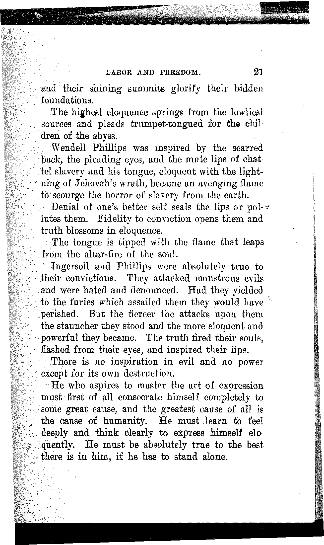 Wendell Phillips was inspired by the scarred back, the pleading eyes, and the mute lips of chattel slavery and his tongue, eloquent with the lightning of Jehovah's wrath, became an avenging flame to scourge the horror of slavery from the earth.
