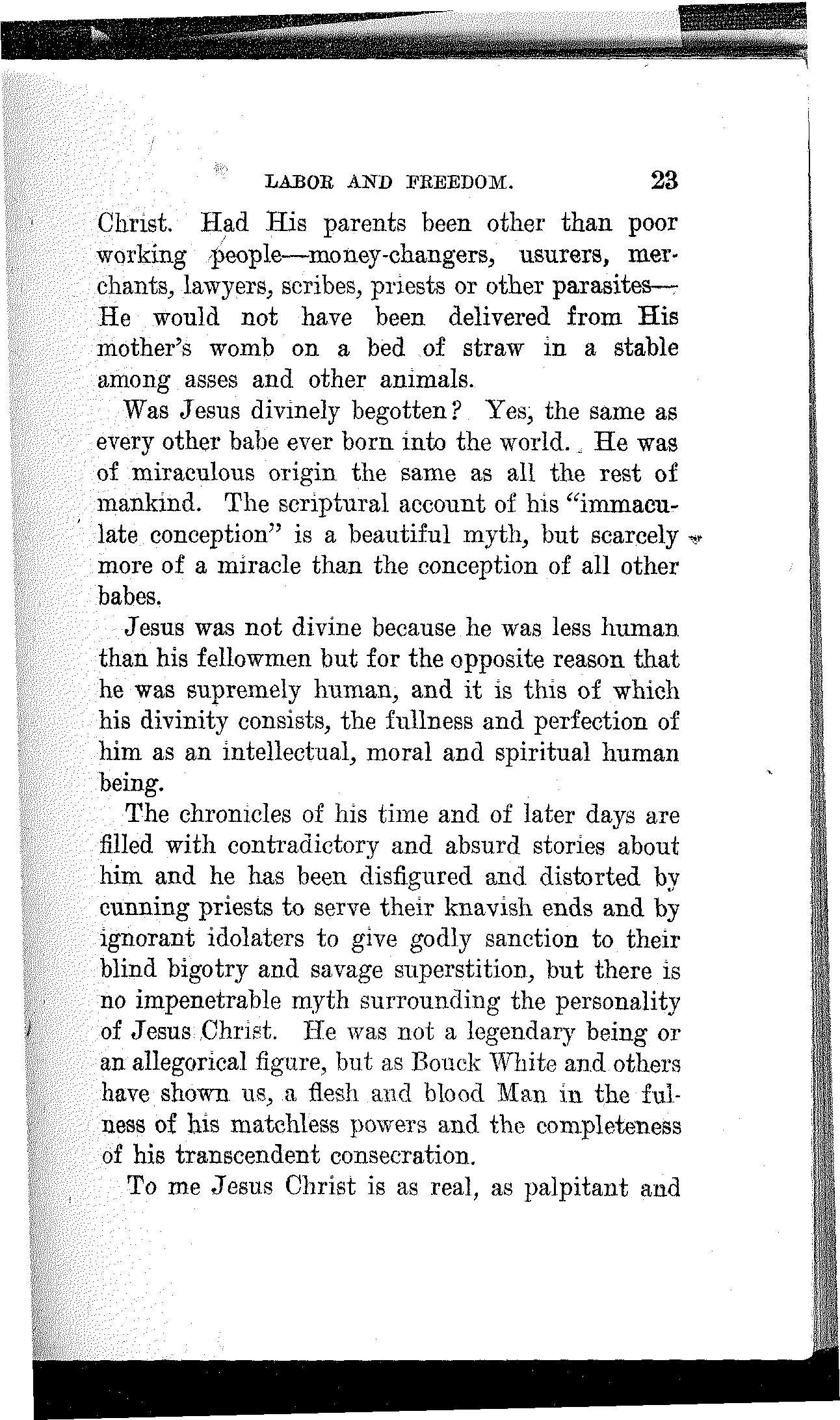 The chronicles of his time and of later days are filled with contradictory and absurd stories about him and he has been disfigured and distorted by cunning priests to serve their knavish ends and by ignorant idolaters to give godly sanction to their blind bigotry and savage superstition, but there is no impenetrable myth surrounding the personality of Jesus Christ. He was not a legendary being or an allegorical figure, but as Bouck White and others have shown us, a flesh and blood Man in the fulness of his matchless powers and the completeness of his transcendent consecration.
