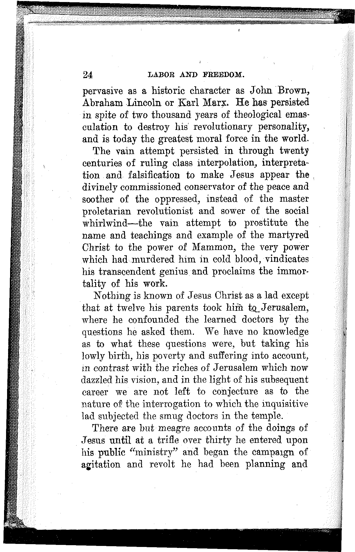 To me Jesus Christ is as real, as palpitant and[24] pervasive as a historic character as John Brown, Abraham Lincoln or Karl Marx. He has persisted in spite of two thousand years of theological emasculation to destroy his revolutionary personality, and is today the greatest moral force in the world.