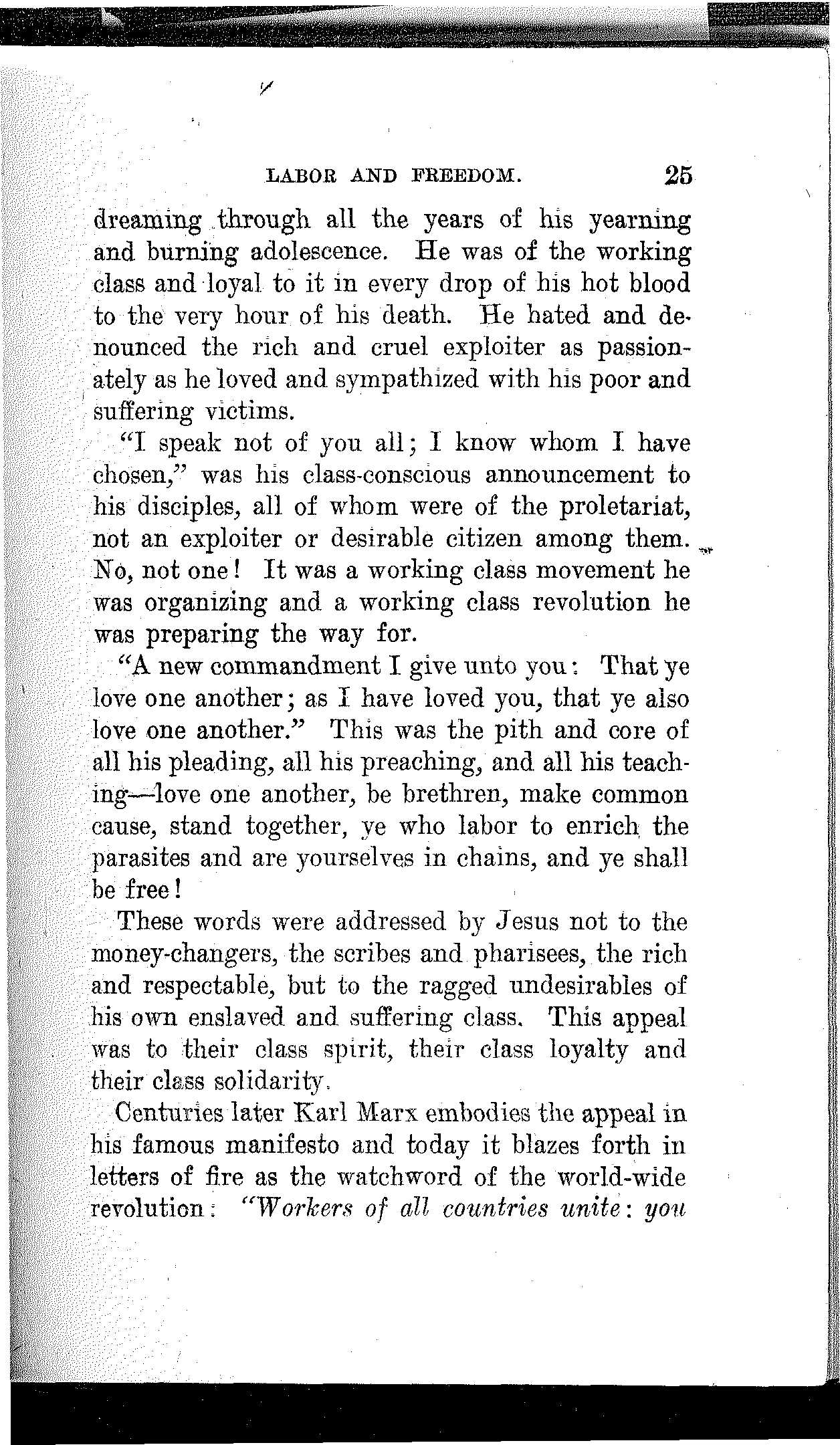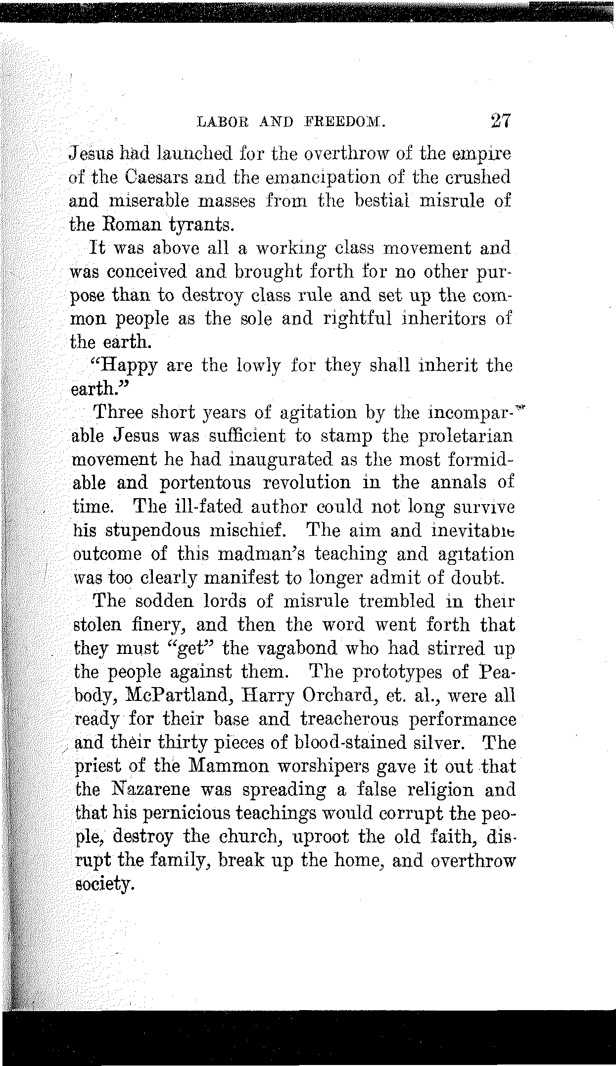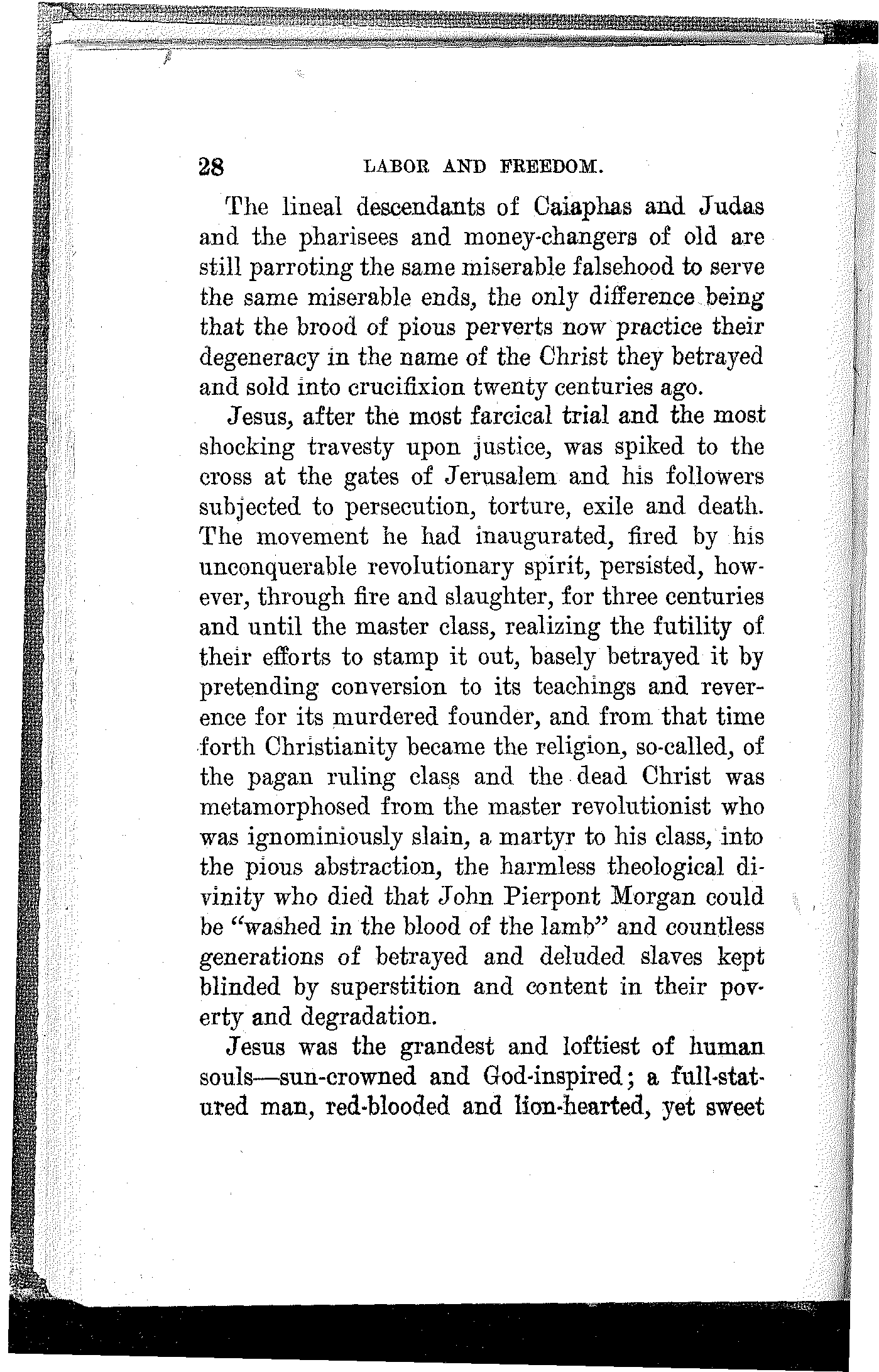 It is of consequence, however, that He was born in a stable and cradled in a manger. This fact of itself, about which there is no question, certifies conclusively the proletarian character of Jesus[23] Christ. Had His parents been other than poor working people—money-changers, usurers, merchants, lawyers, scribes, priests or other parasites—He would not have been delivered from His mother's womb on a bed of straw in a stable among asses and other animals.