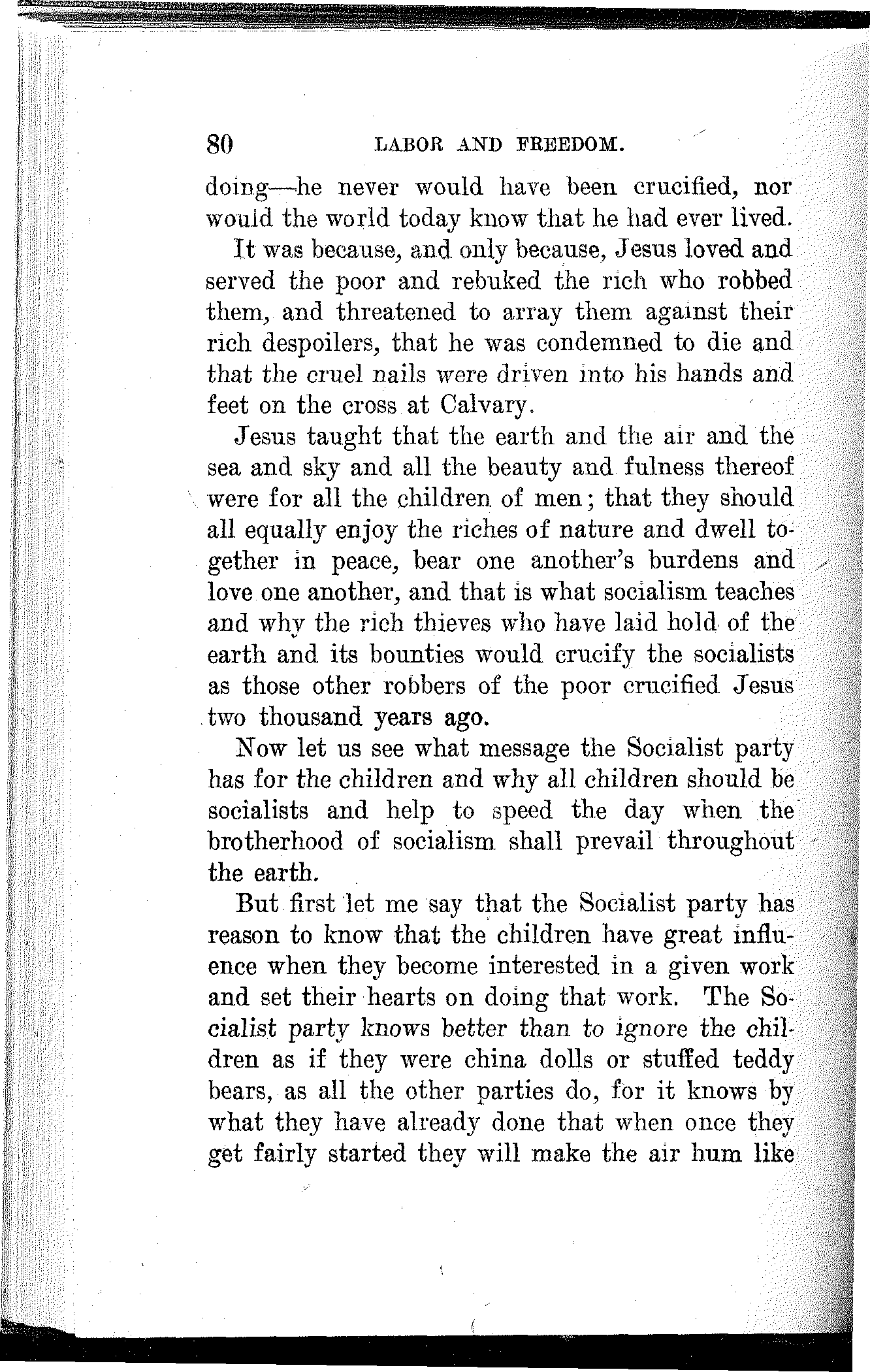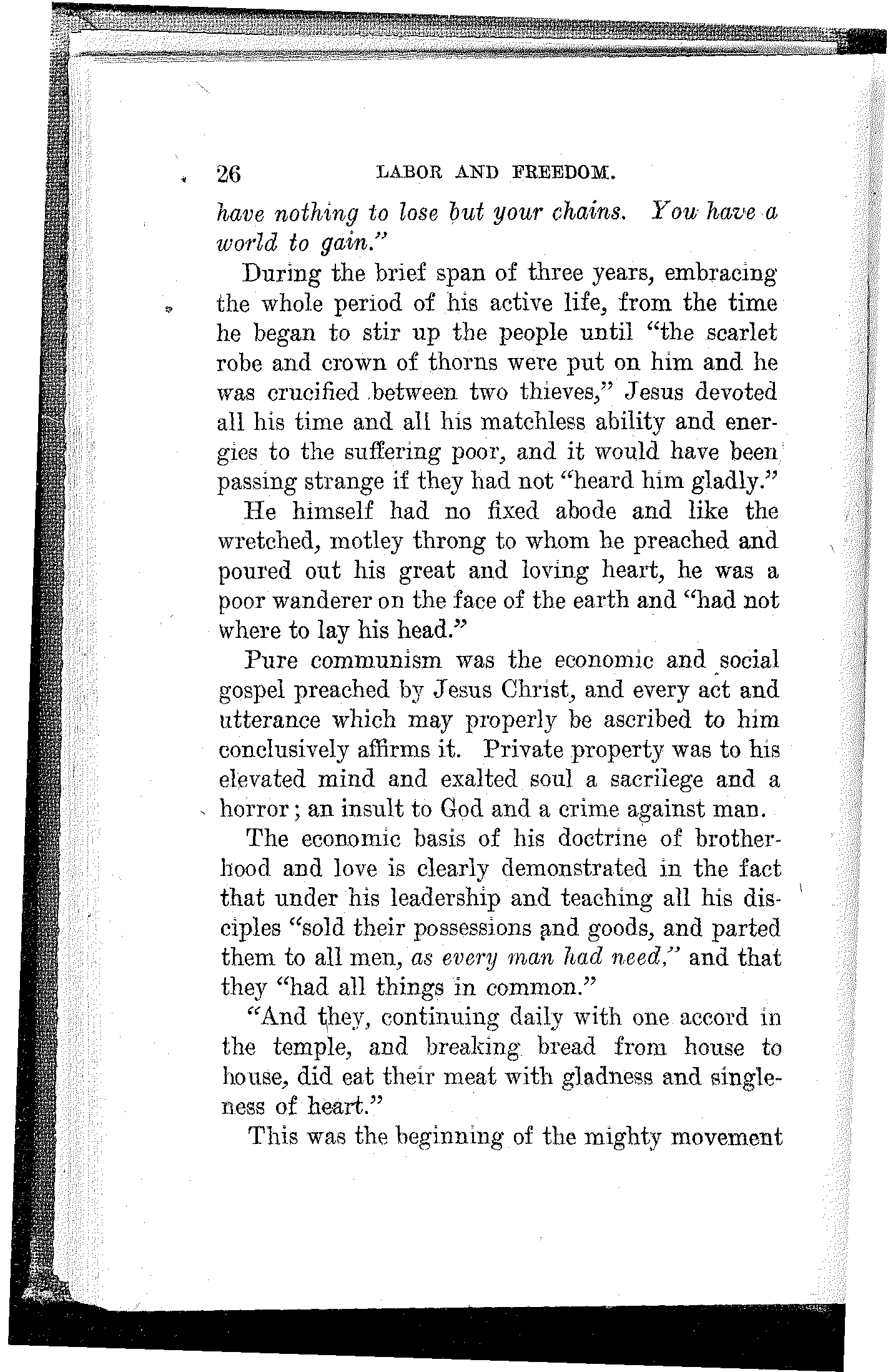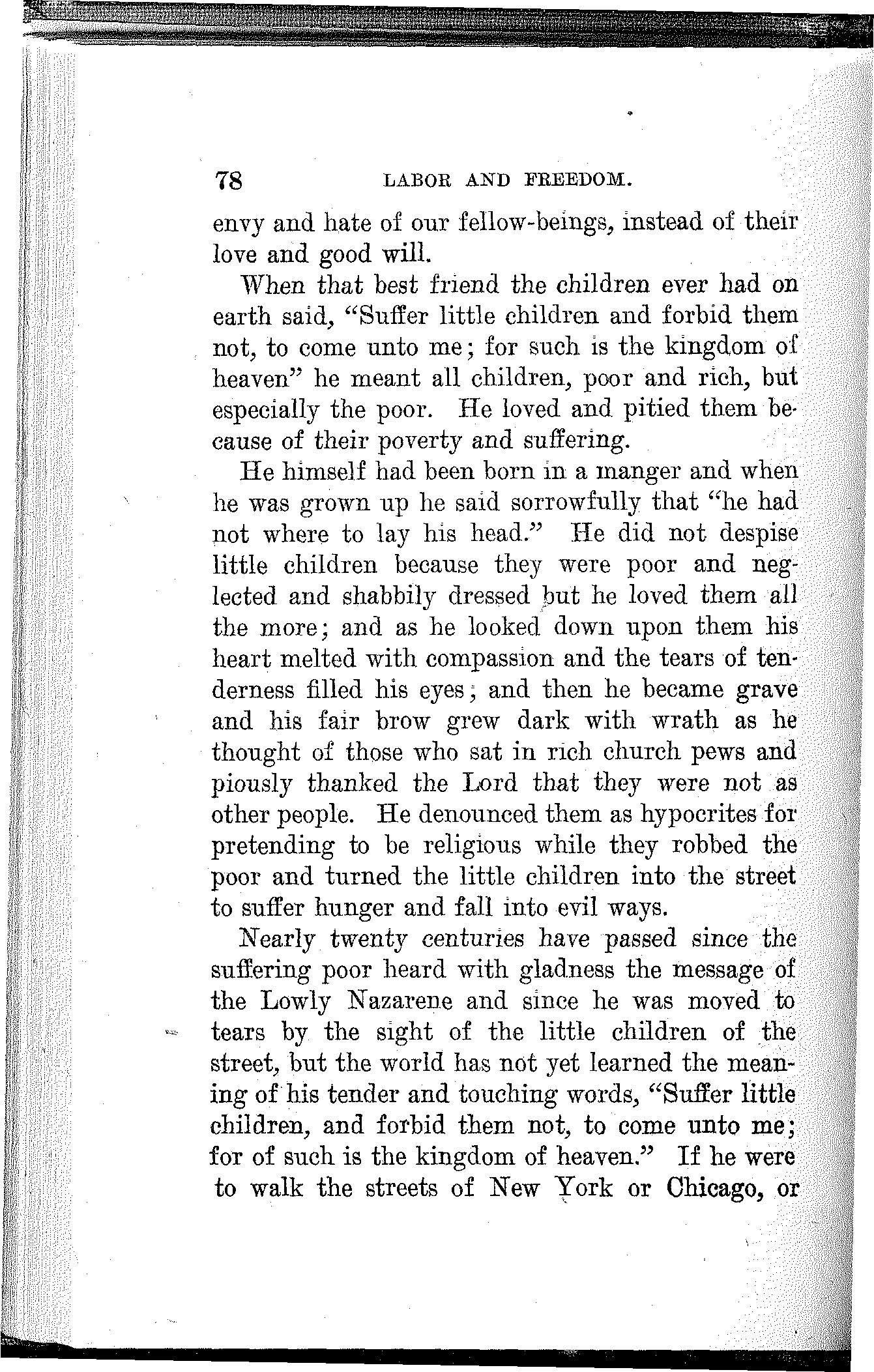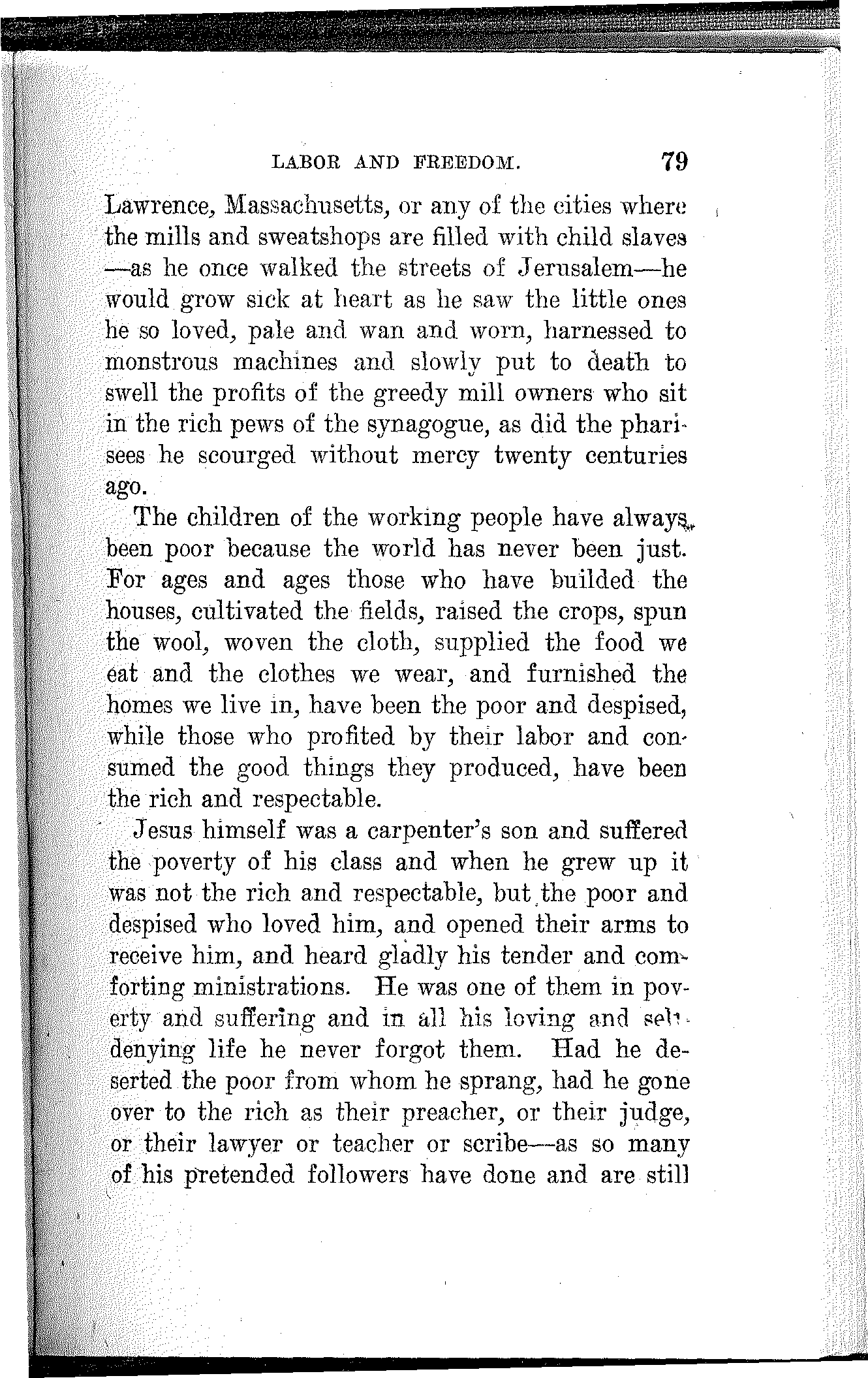 It is of consequence, however, that He was born in a stable and cradled in a manger. This fact of itself, about which there is no question, certifies conclusively the proletarian character of Jesus[23] Christ. Had His parents been other than poor working people—money-changers, usurers, merchants, lawyers, scribes, priests or other parasites—He would not have been delivered from His mother's womb on a bed of straw in a stable among asses and other animals.