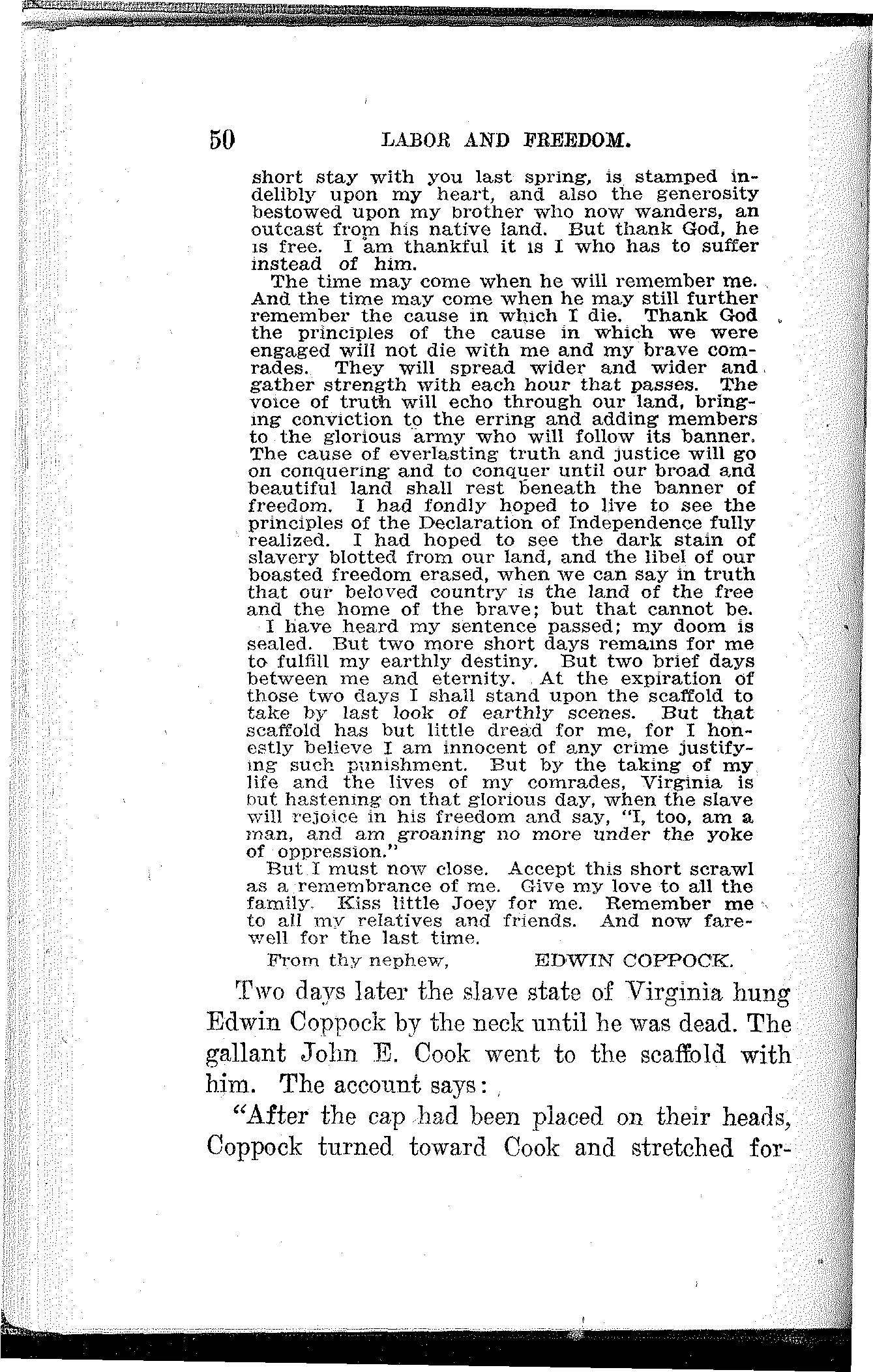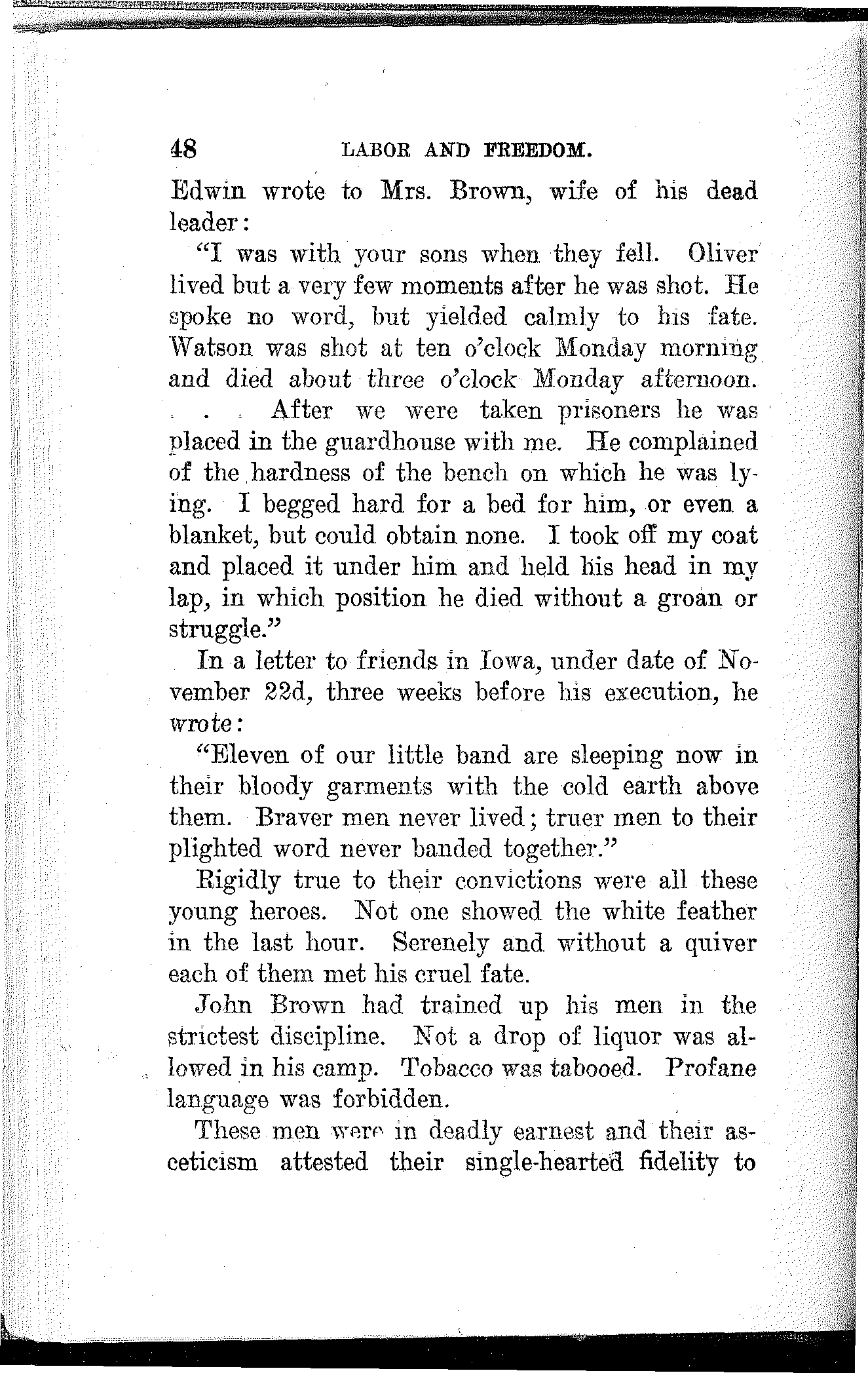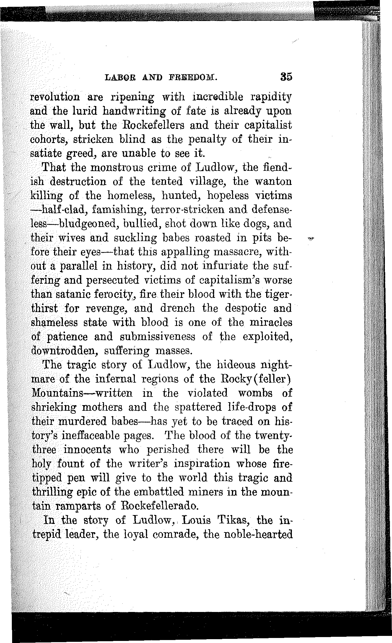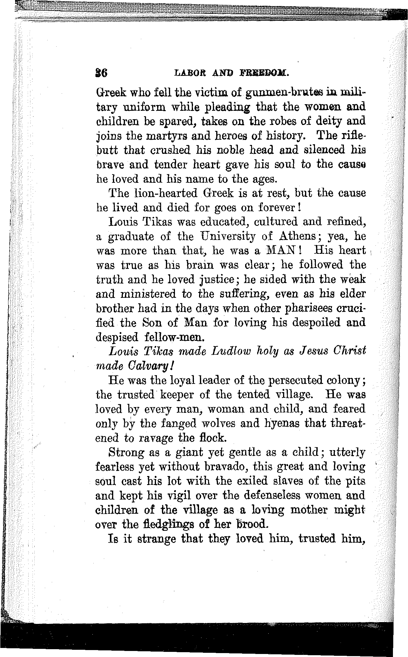 Had he been an obedient corporation lackey; had he scabbed on his fellow-workers; had he been mean and selfish and cold-blooded, he would have been promoted instead of blacklisted by the corporation and honored instead of hounded by society. His manhood and self-respect cost him dearly, but he paid the price to the last farthing. His right to work and live, his home, his family and his friends were all swept away because he refused to scab on his fellowmen.
