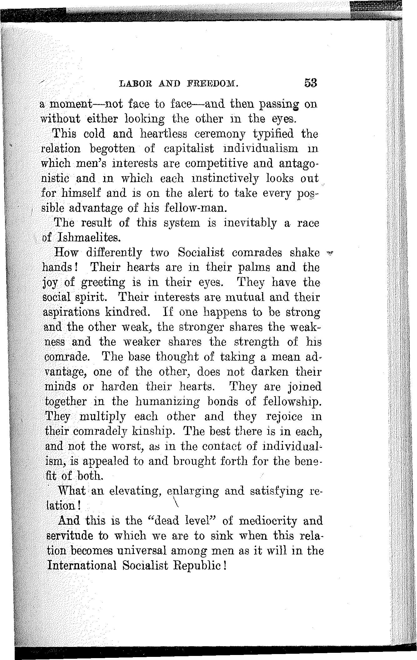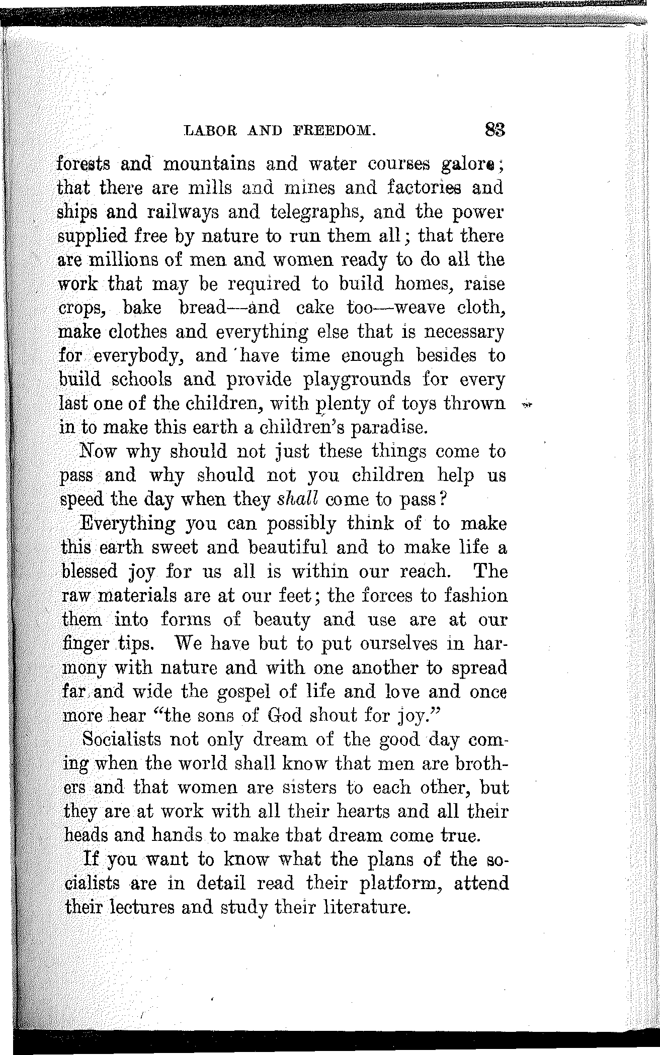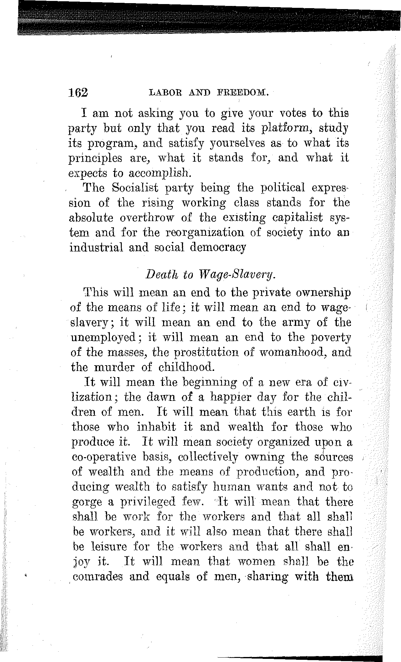 It will mean the beginning of a new era of civilization; the dawn of a happier day for the children of men. It will mean that this earth is for those who inhabit it and wealth for those who produce it. If will mean society organized upon a co-operative basis, collectively owning the sources of wealth and the means of production, and producing wealth to satisfy human wants and not to gorge a privileged few. It will mean that there shall be work for the workers and that all shall be workers, and it will also mean that there shall be leisure for the workers and that all shall enjoy it. It will mean that women shall be the comrades and equals of men, sharing with them[163] on equal terms the opportunities as well as the responsibilities, the benefits as well as the burdens of civilized life.