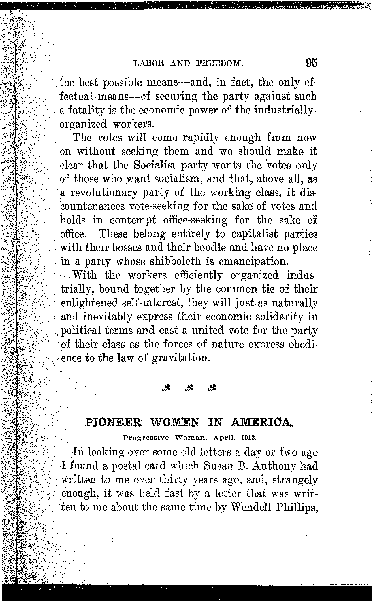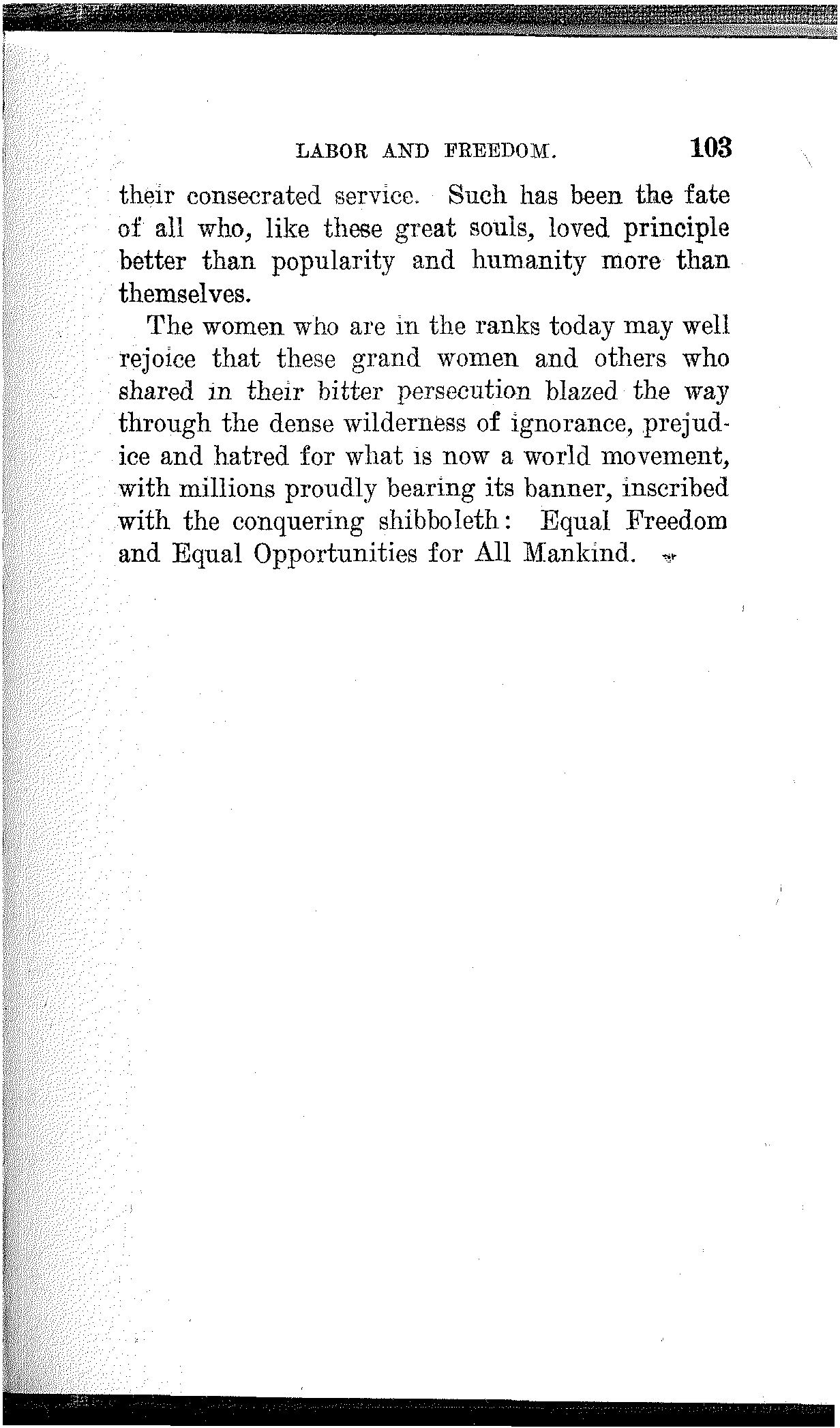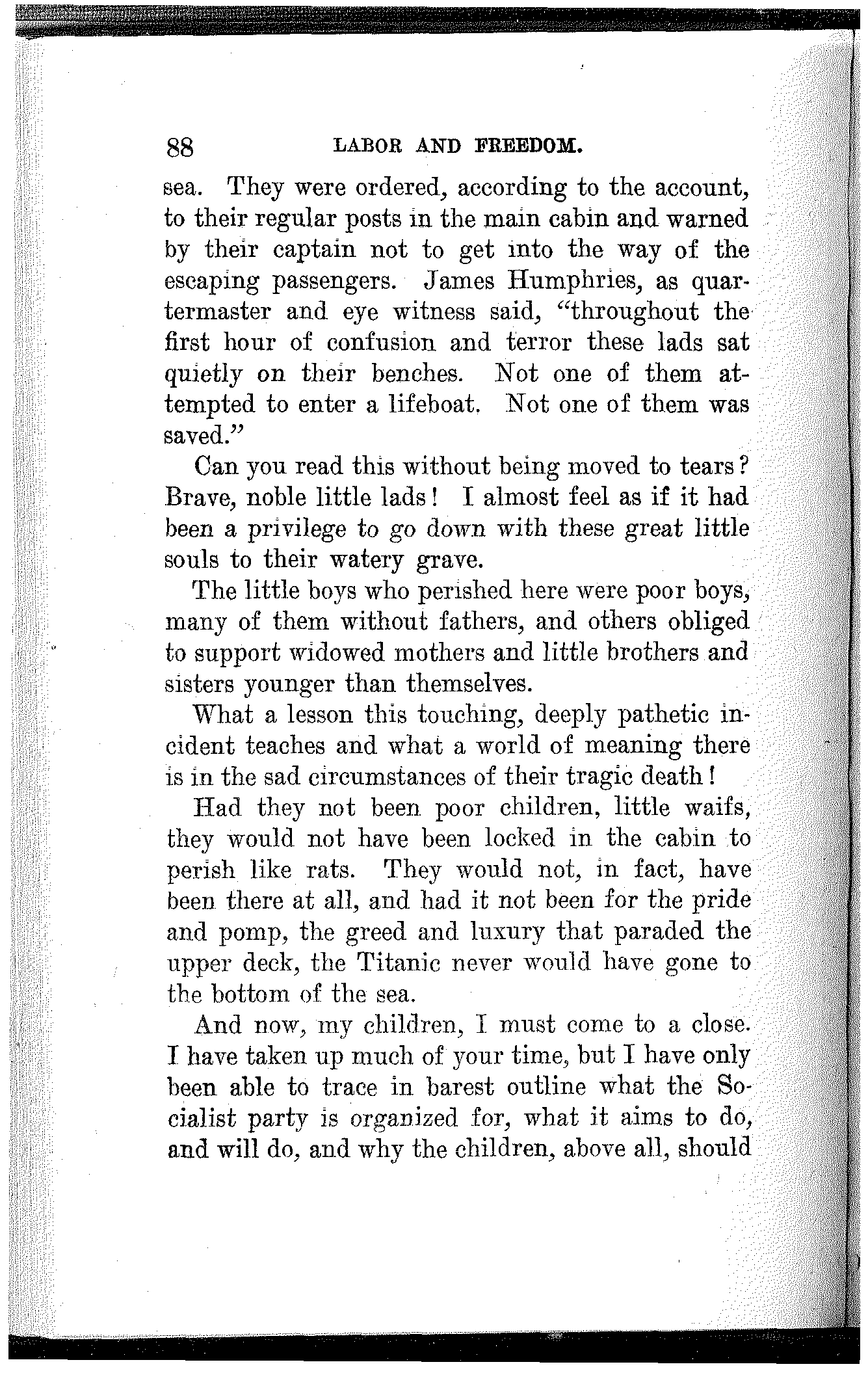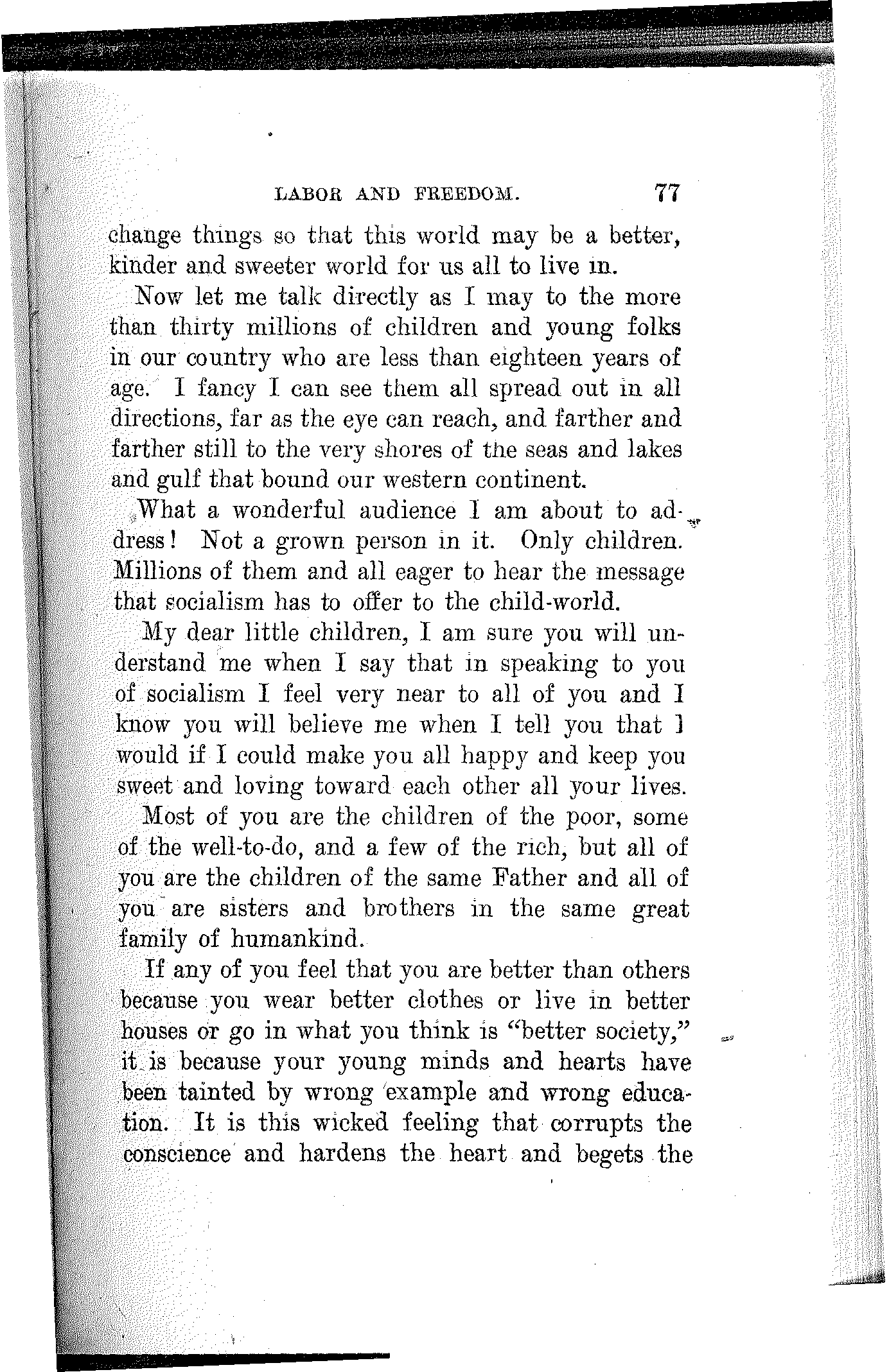 It will mean the beginning of a new era of civilization; the dawn of a happier day for the children of men. It will mean that this earth is for those who inhabit it and wealth for those who produce it. If will mean society organized upon a co-operative basis, collectively owning the sources of wealth and the means of production, and producing wealth to satisfy human wants and not to gorge a privileged few. It will mean that there shall be work for the workers and that all shall be workers, and it will also mean that there shall be leisure for the workers and that all shall enjoy it. It will mean that women shall be the comrades and equals of men, sharing with them[163] on equal terms the opportunities as well as the responsibilities, the benefits as well as the burdens of civilized life.