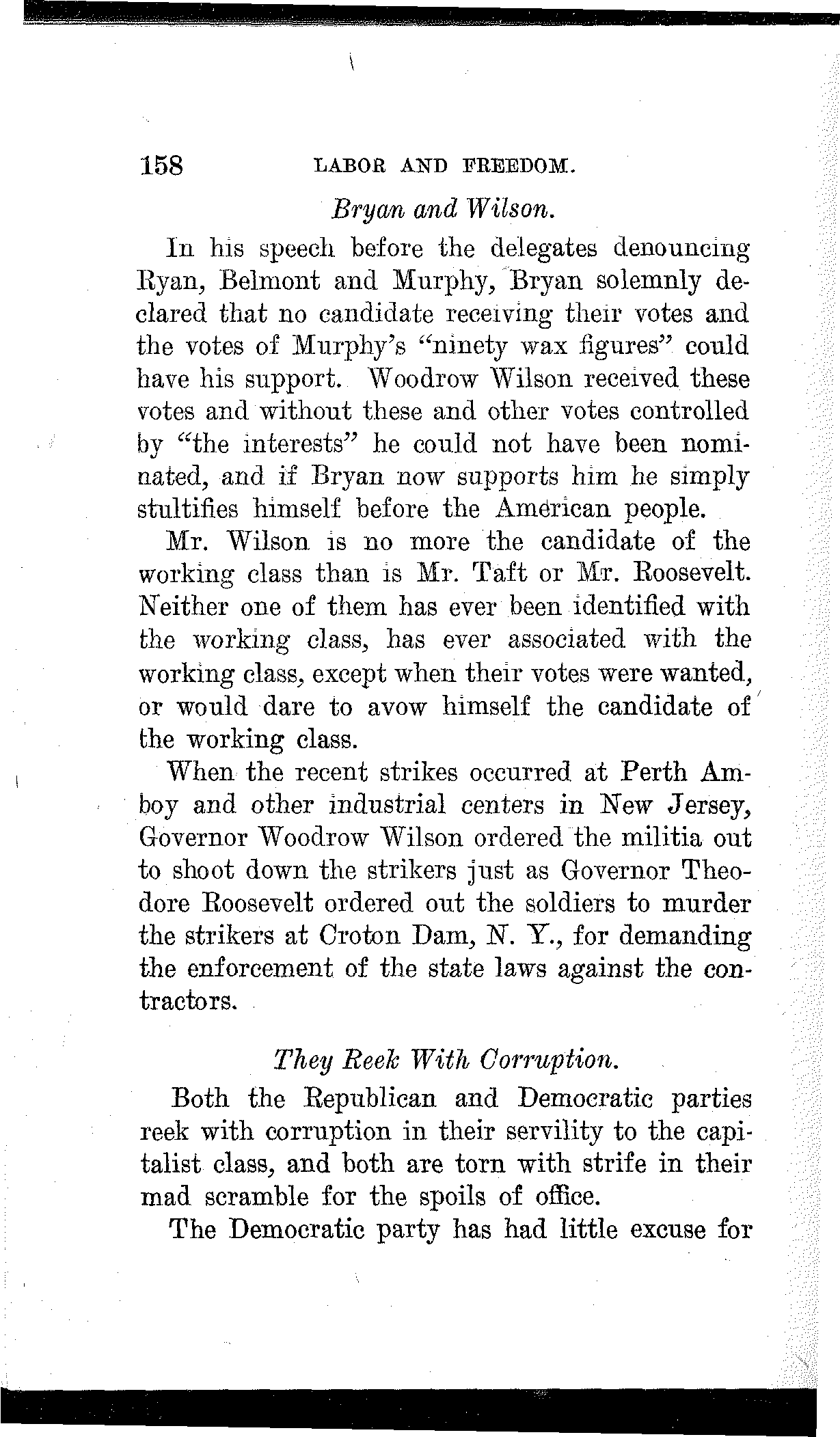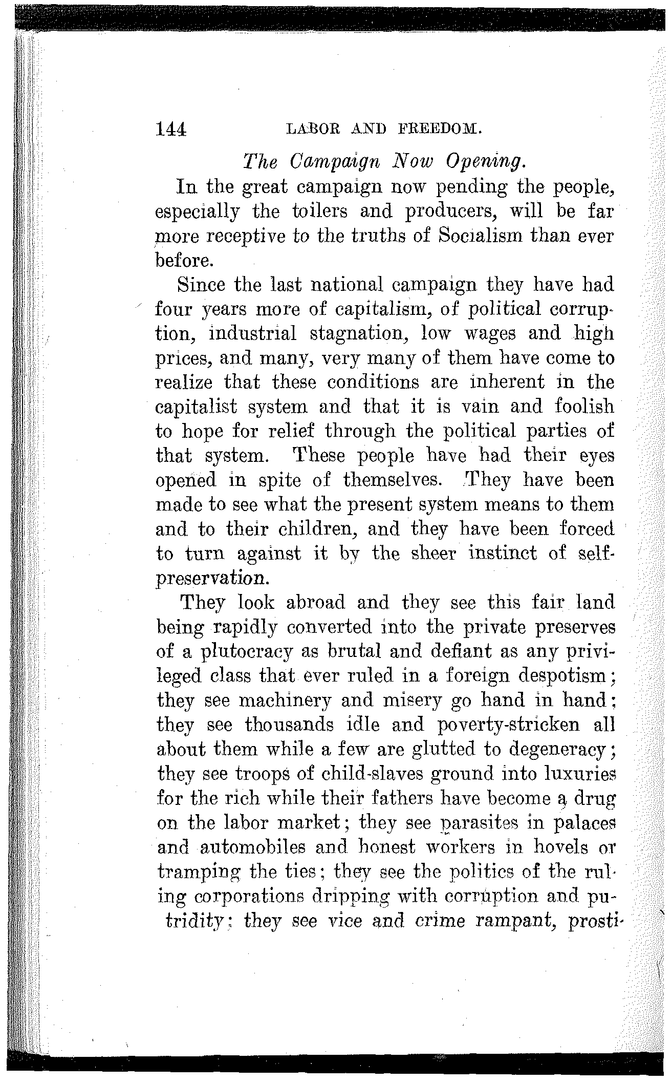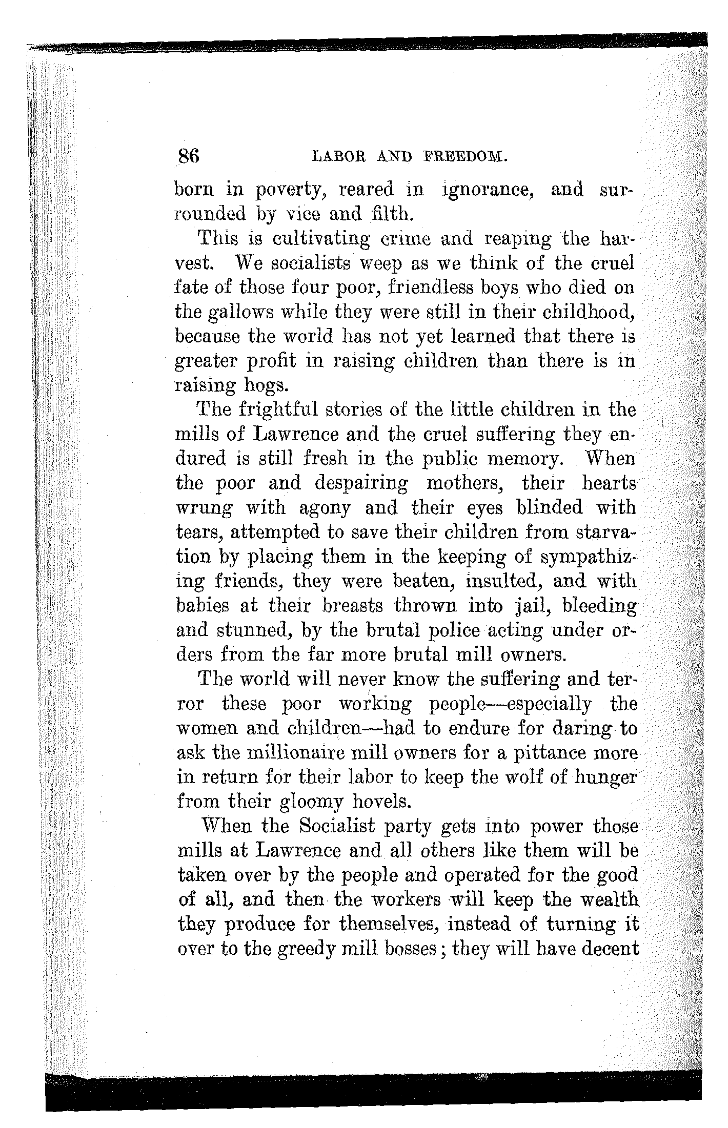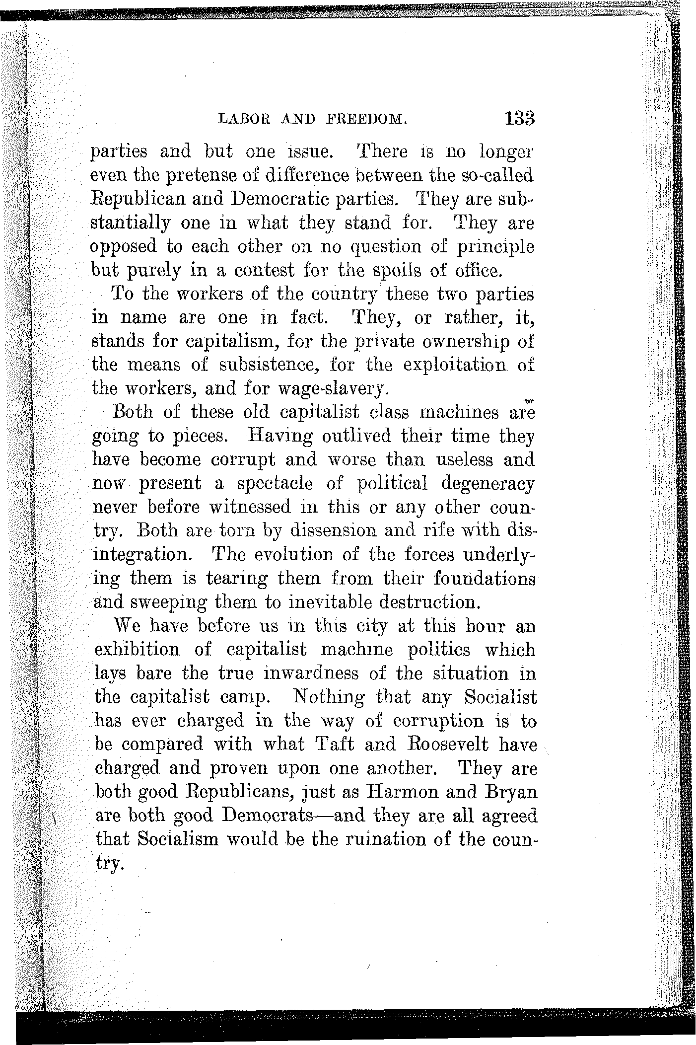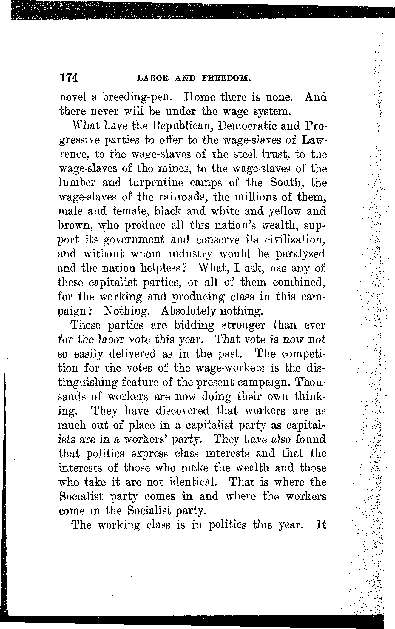 What have the Republican, Democratic and Progressive parties to offer to the wage-slaves of Lawrence, to the wage-slaves of the steel trust, to the wage-slaves of the mines, to the wage-slaves of the lumber and turpentine camps of the South, the wage-slaves of the railroads, the millions of them, male and female, black and white and yellow and brown, who produce all this nation's wealth, support its government and conserve its civilization, and without whom industry would be paralyzed and the nation helpless? What, I ask, has any of these capitalist parties, or all of them combined, for the working and producing class in this campaign? Nothing. Absolutely nothing.