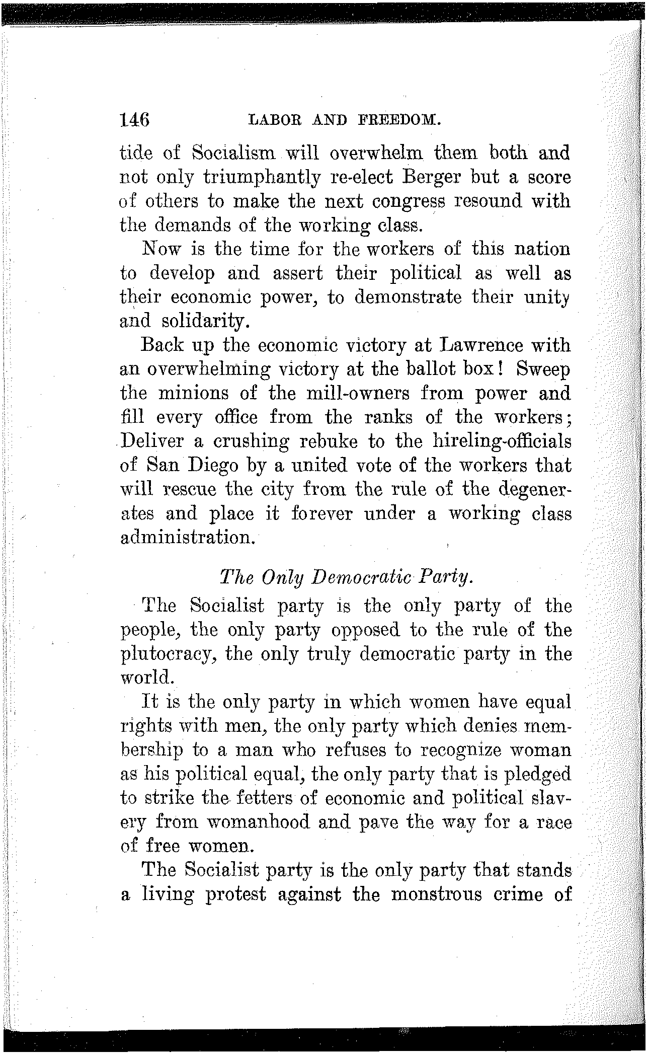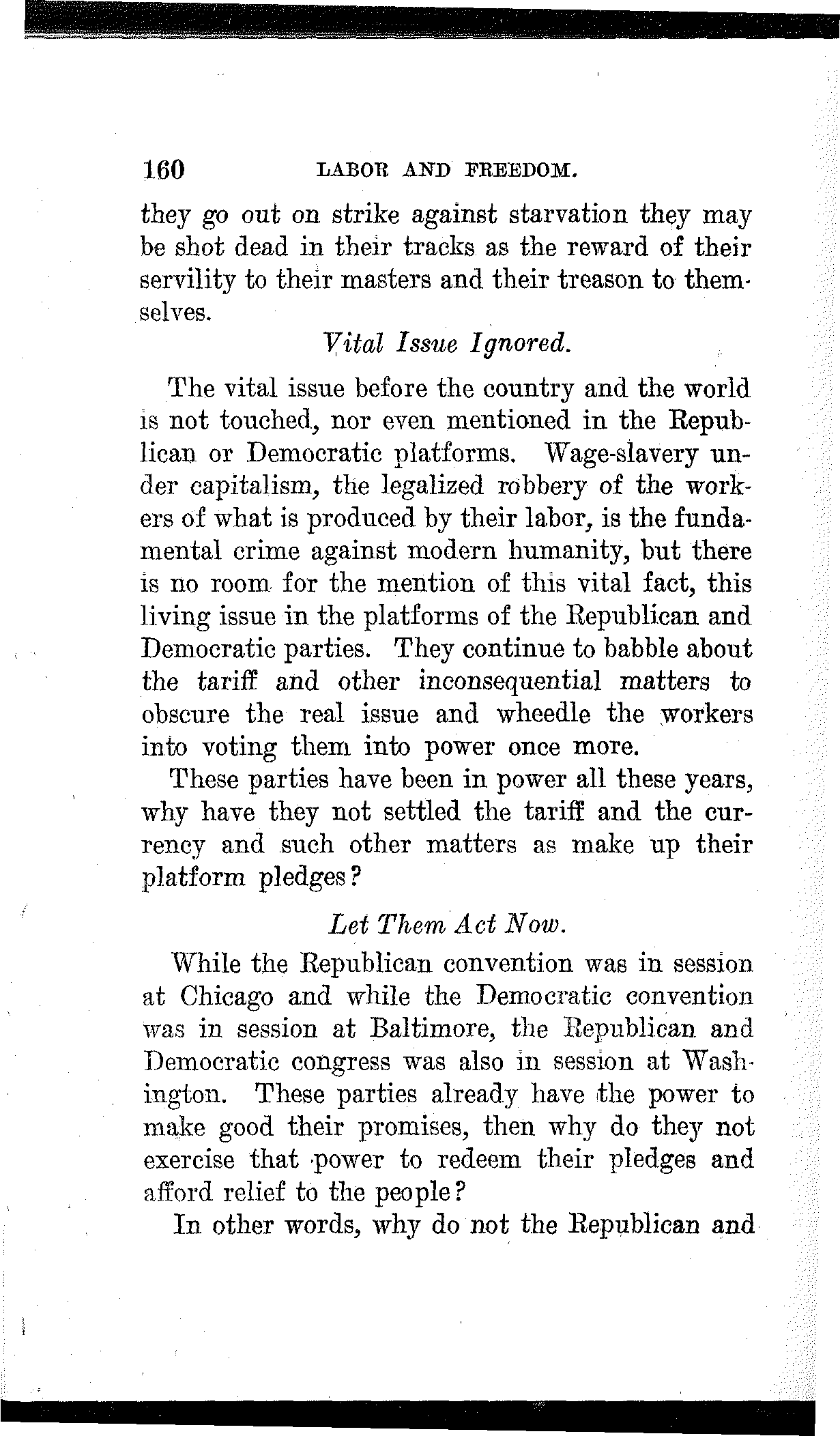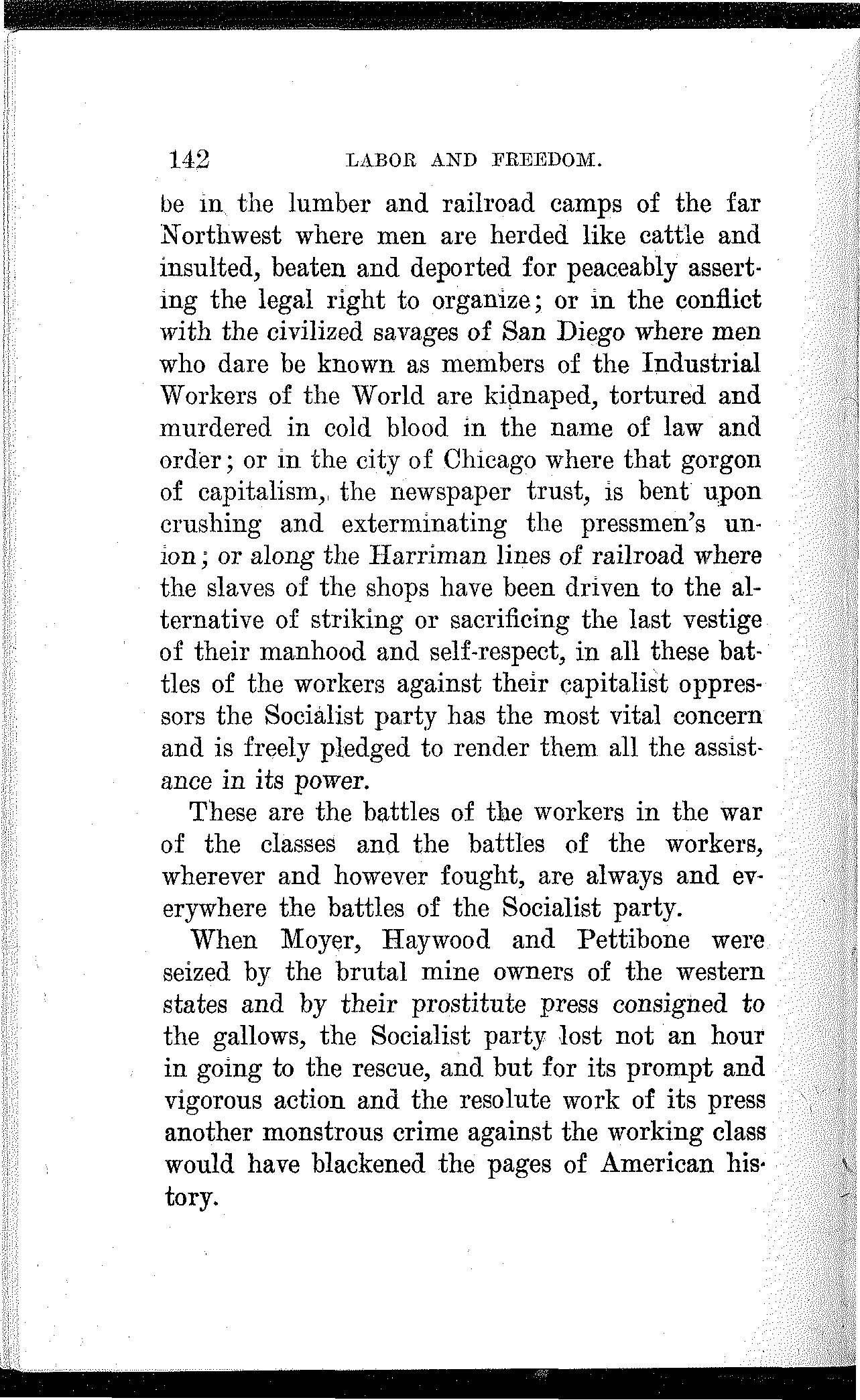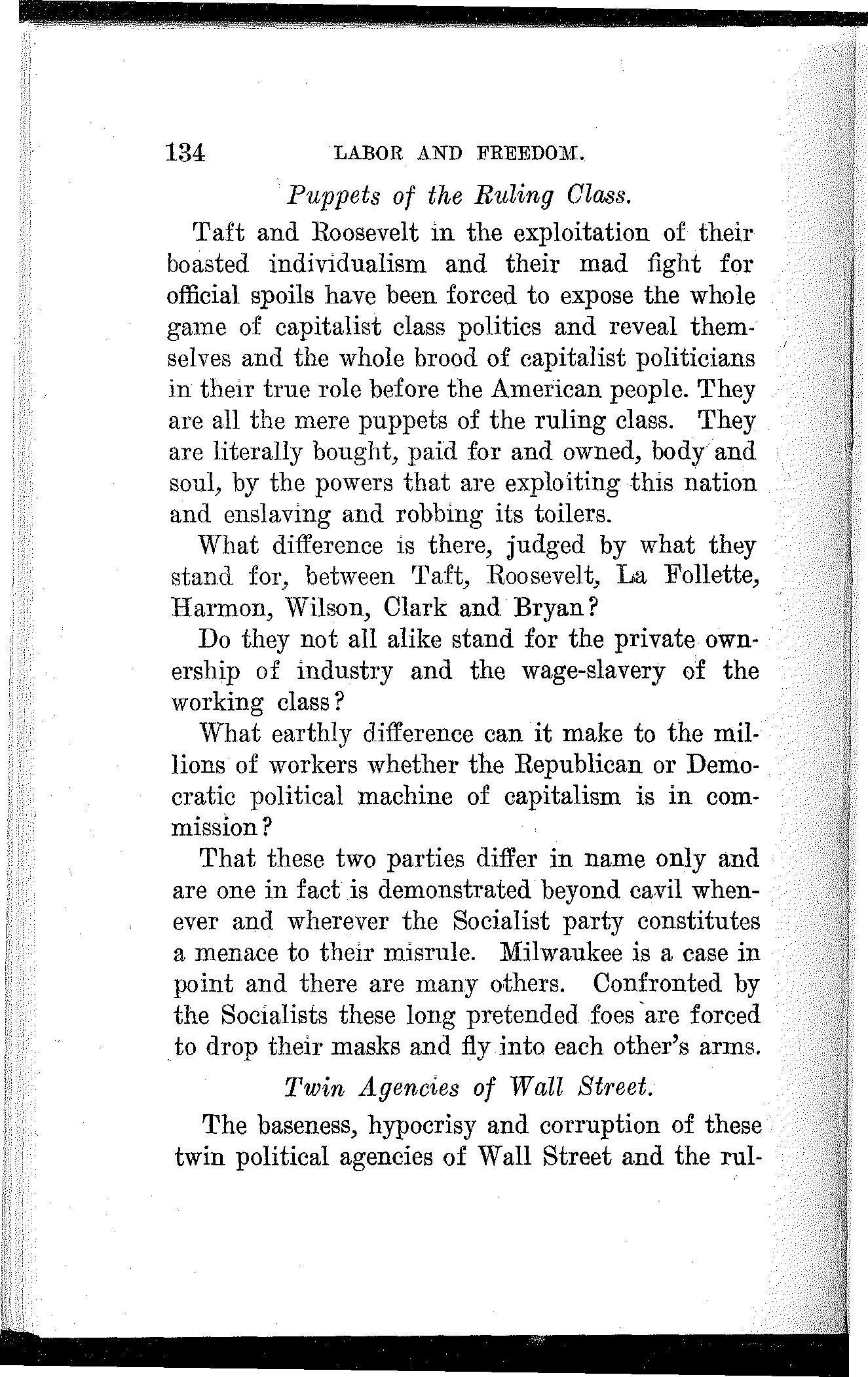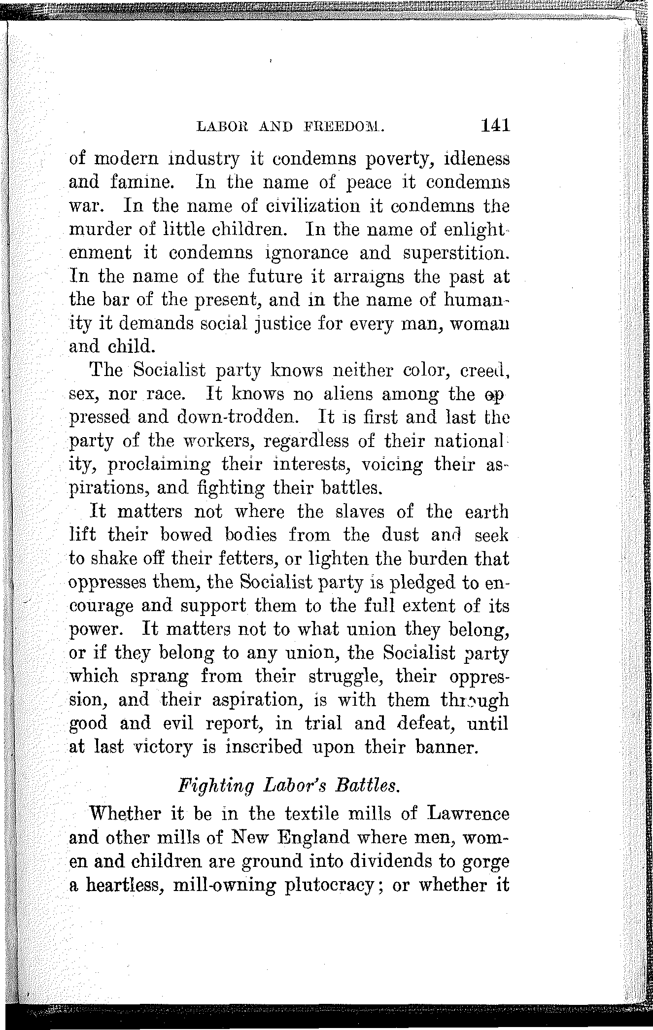 What have the Republican, Democratic and Progressive parties to offer to the wage-slaves of Lawrence, to the wage-slaves of the steel trust, to the wage-slaves of the mines, to the wage-slaves of the lumber and turpentine camps of the South, the wage-slaves of the railroads, the millions of them, male and female, black and white and yellow and brown, who produce all this nation's wealth, support its government and conserve its civilization, and without whom industry would be paralyzed and the nation helpless? What, I ask, has any of these capitalist parties, or all of them combined, for the working and producing class in this campaign? Nothing. Absolutely nothing.