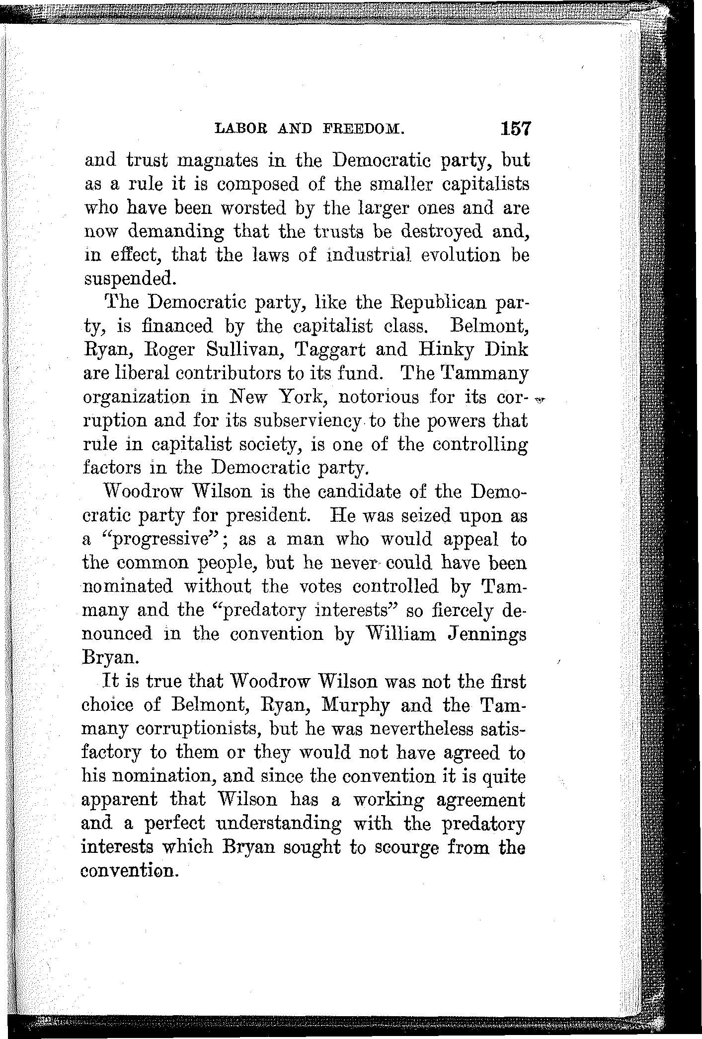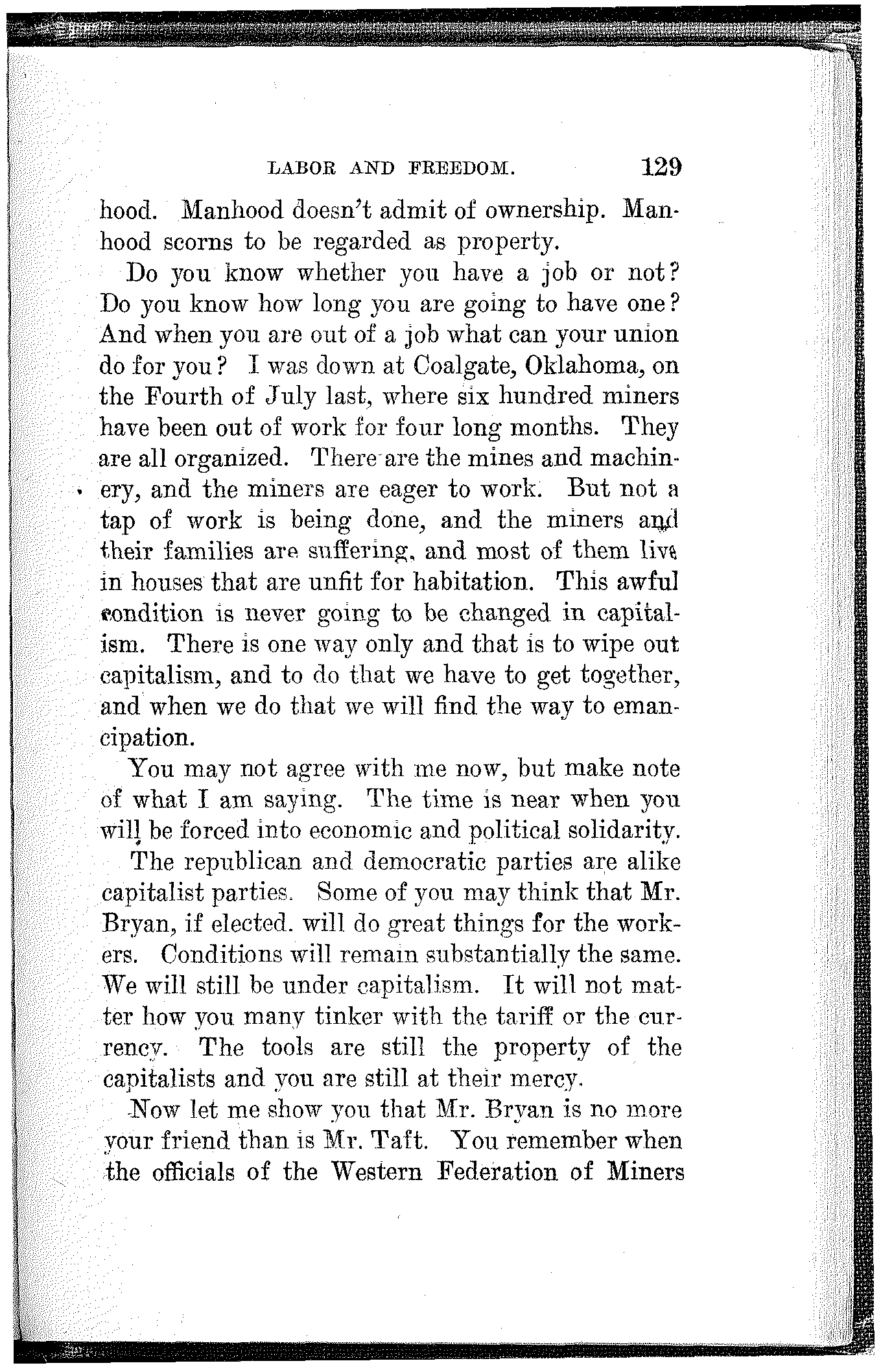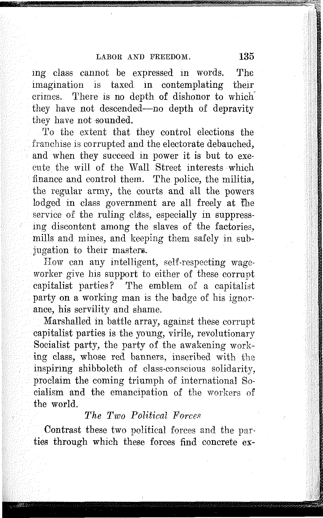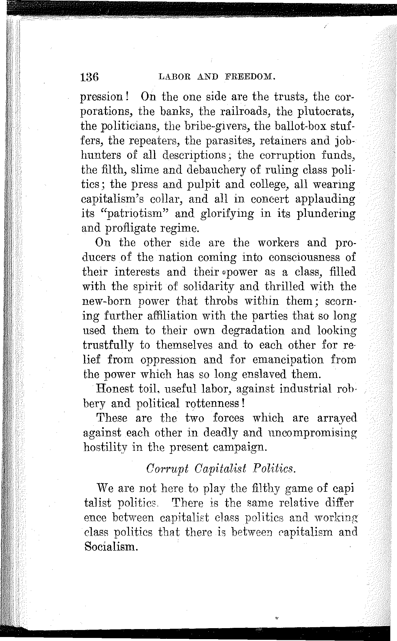 What have the Republican, Democratic and Progressive parties to offer to the wage-slaves of Lawrence, to the wage-slaves of the steel trust, to the wage-slaves of the mines, to the wage-slaves of the lumber and turpentine camps of the South, the wage-slaves of the railroads, the millions of them, male and female, black and white and yellow and brown, who produce all this nation's wealth, support its government and conserve its civilization, and without whom industry would be paralyzed and the nation helpless? What, I ask, has any of these capitalist parties, or all of them combined, for the working and producing class in this campaign? Nothing. Absolutely nothing.