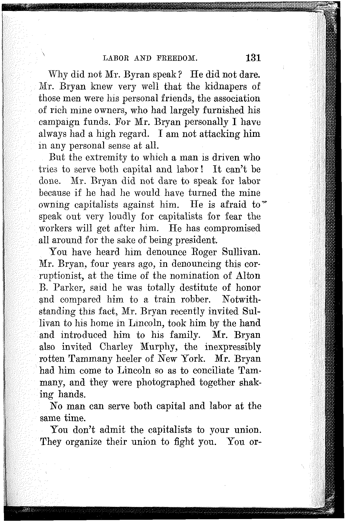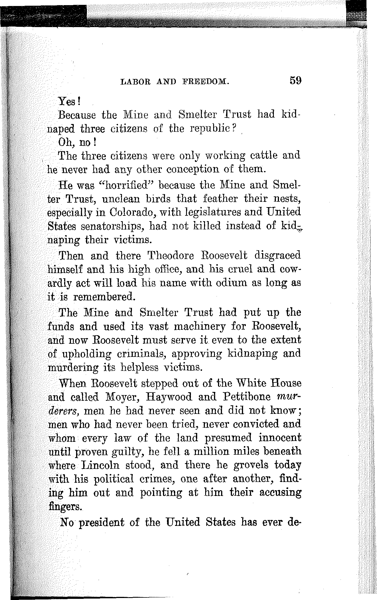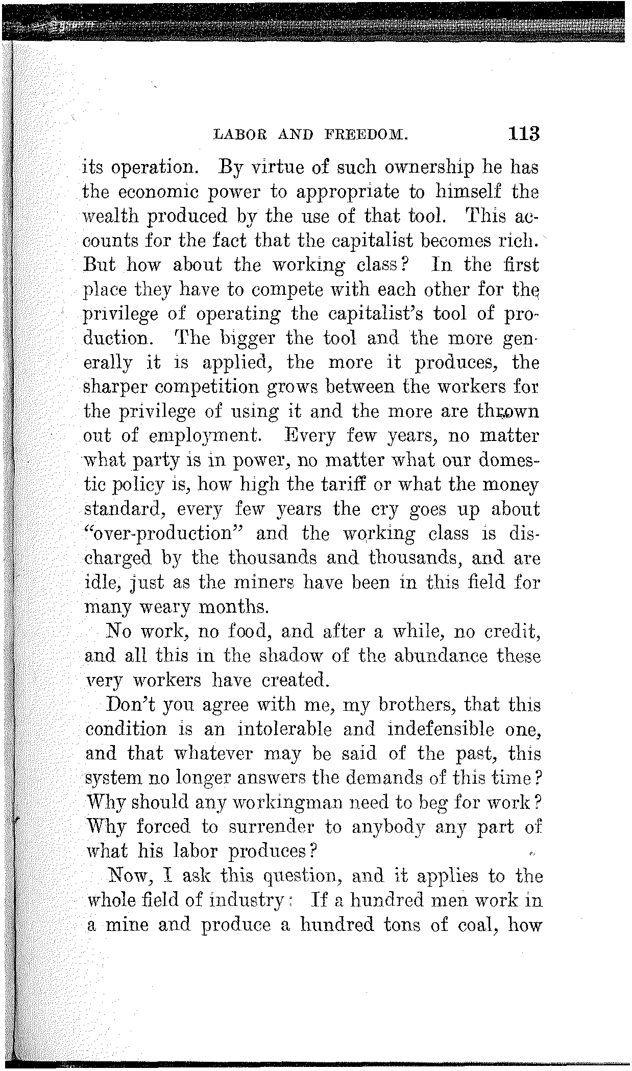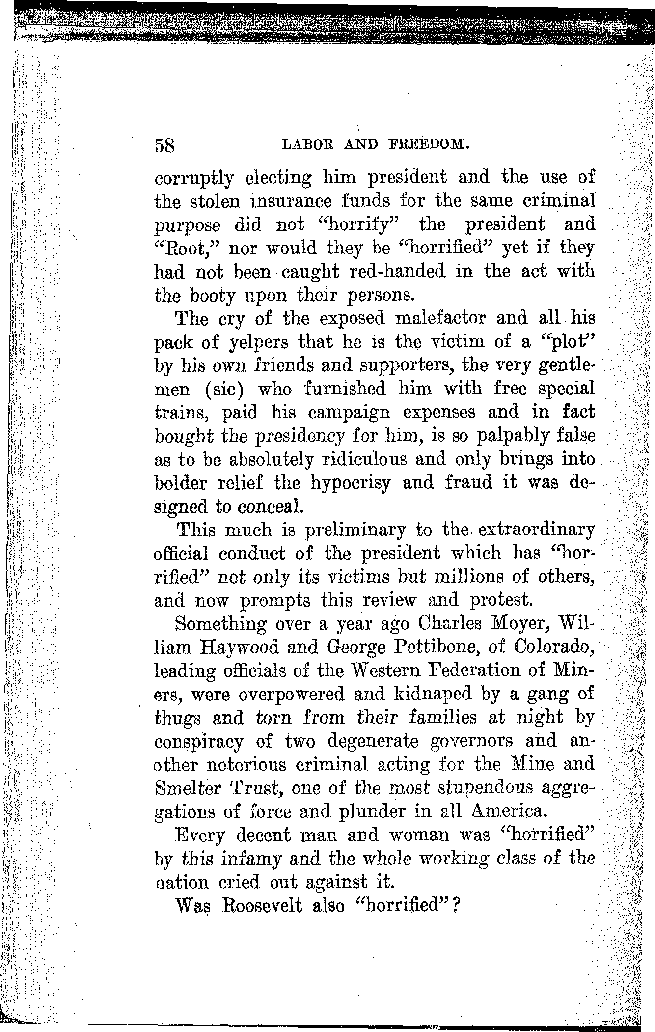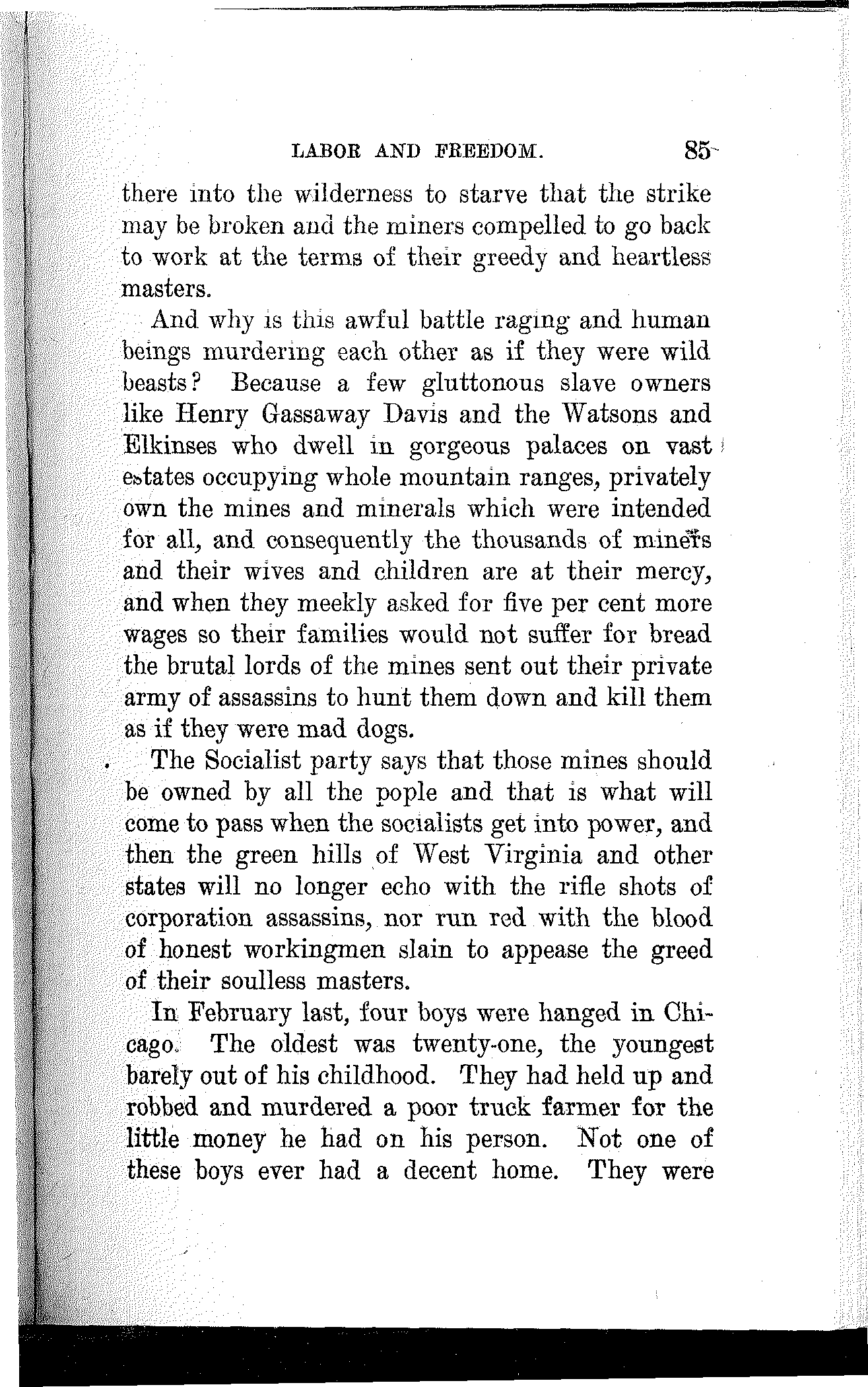 What have the Republican, Democratic and Progressive parties to offer to the wage-slaves of Lawrence, to the wage-slaves of the steel trust, to the wage-slaves of the mines, to the wage-slaves of the lumber and turpentine camps of the South, the wage-slaves of the railroads, the millions of them, male and female, black and white and yellow and brown, who produce all this nation's wealth, support its government and conserve its civilization, and without whom industry would be paralyzed and the nation helpless? What, I ask, has any of these capitalist parties, or all of them combined, for the working and producing class in this campaign? Nothing. Absolutely nothing.