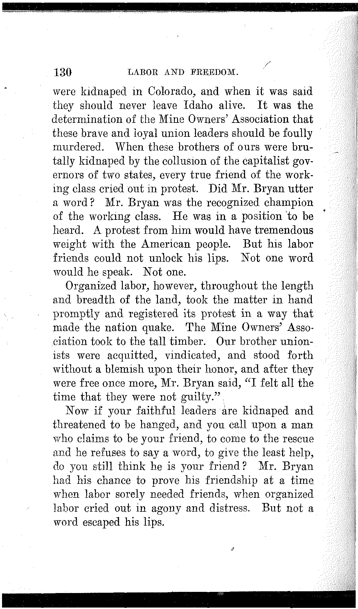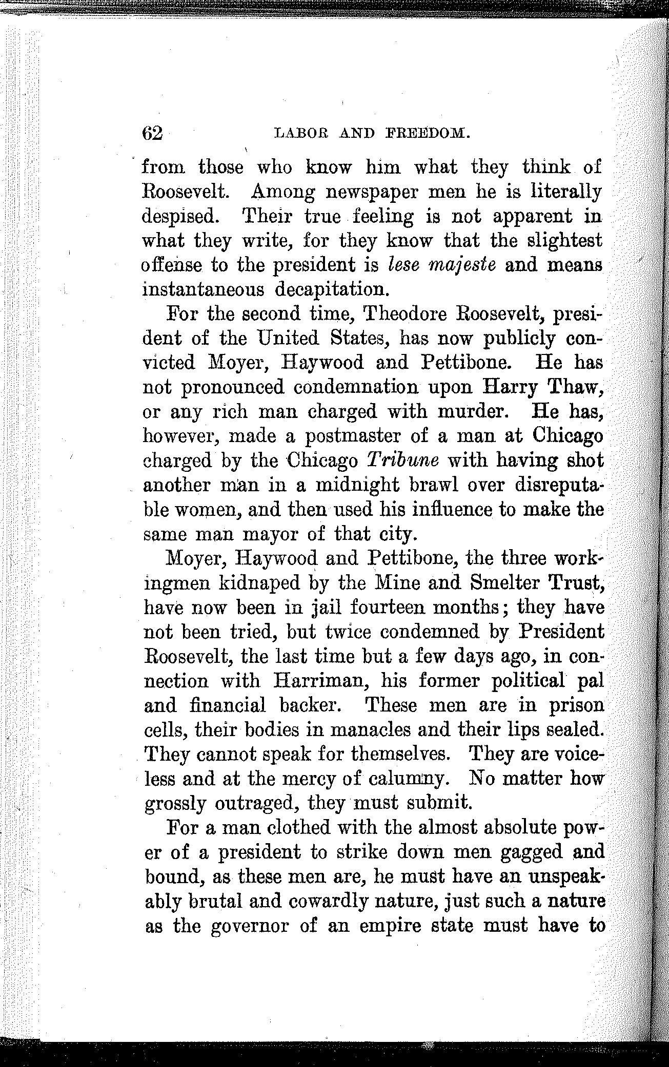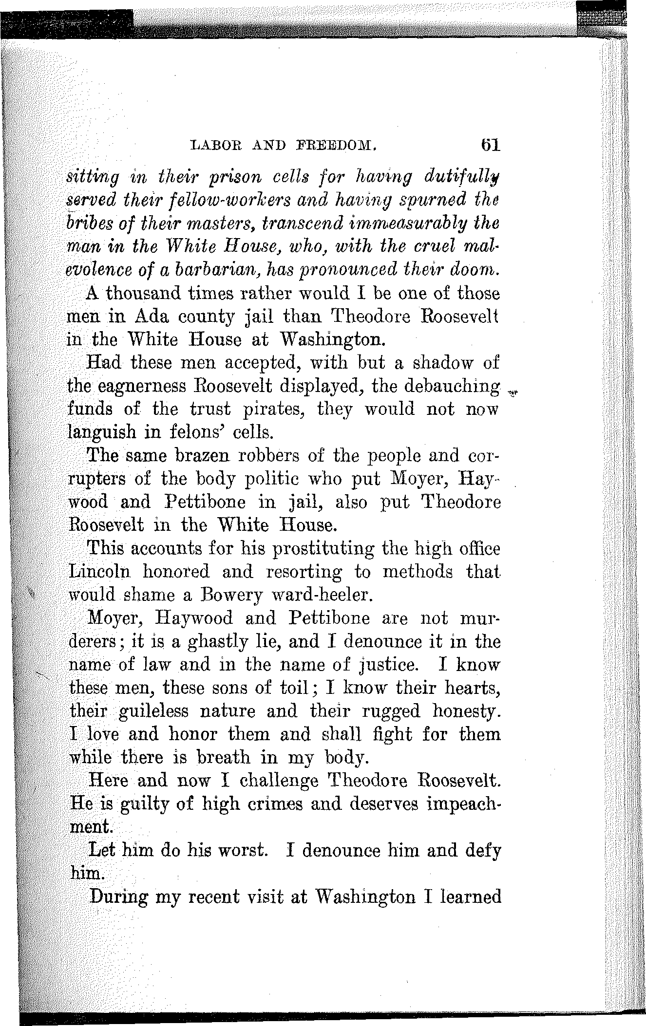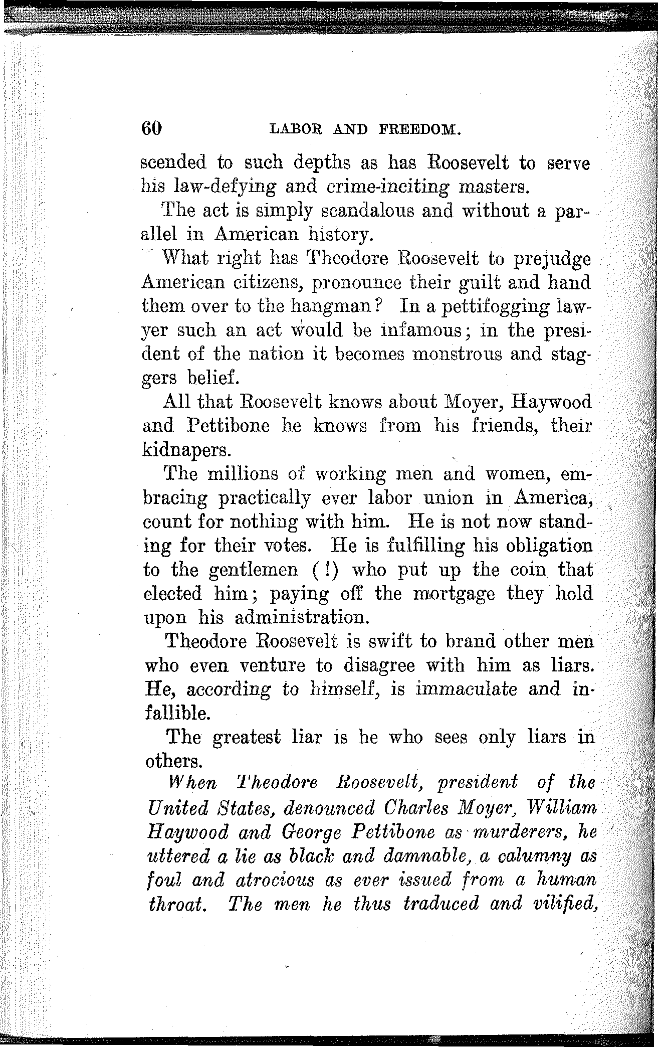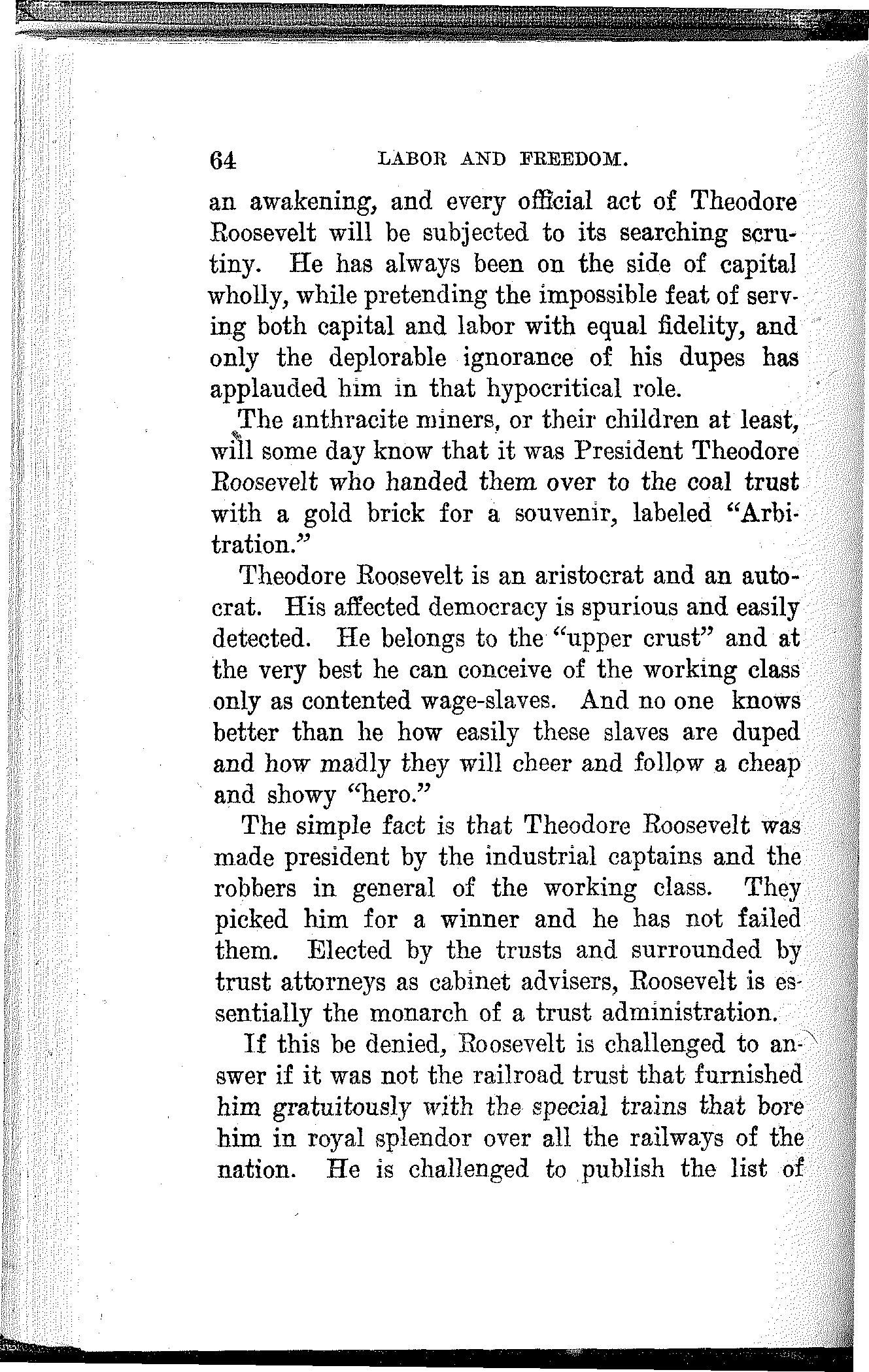 What have the Republican, Democratic and Progressive parties to offer to the wage-slaves of Lawrence, to the wage-slaves of the steel trust, to the wage-slaves of the mines, to the wage-slaves of the lumber and turpentine camps of the South, the wage-slaves of the railroads, the millions of them, male and female, black and white and yellow and brown, who produce all this nation's wealth, support its government and conserve its civilization, and without whom industry would be paralyzed and the nation helpless? What, I ask, has any of these capitalist parties, or all of them combined, for the working and producing class in this campaign? Nothing. Absolutely nothing.