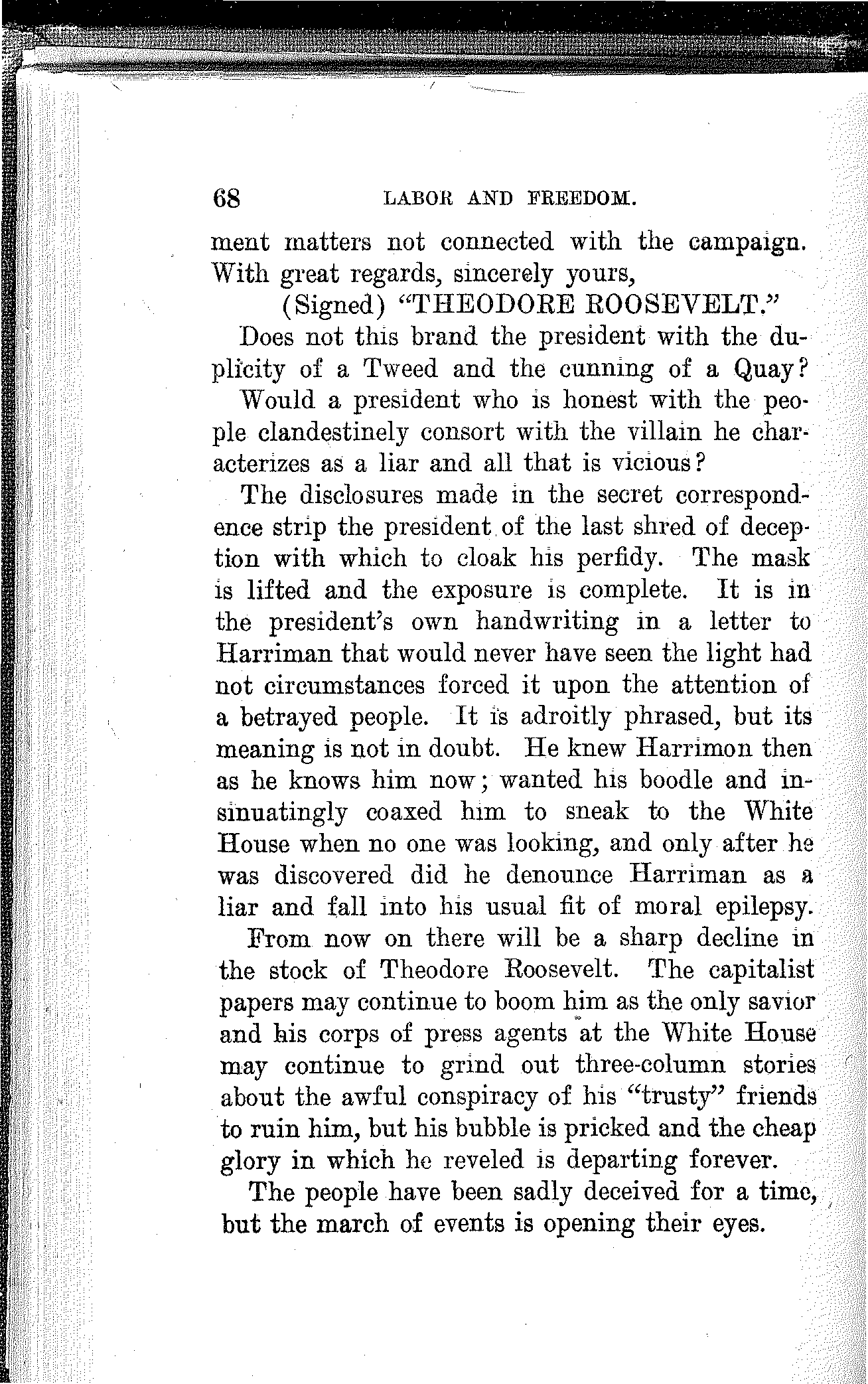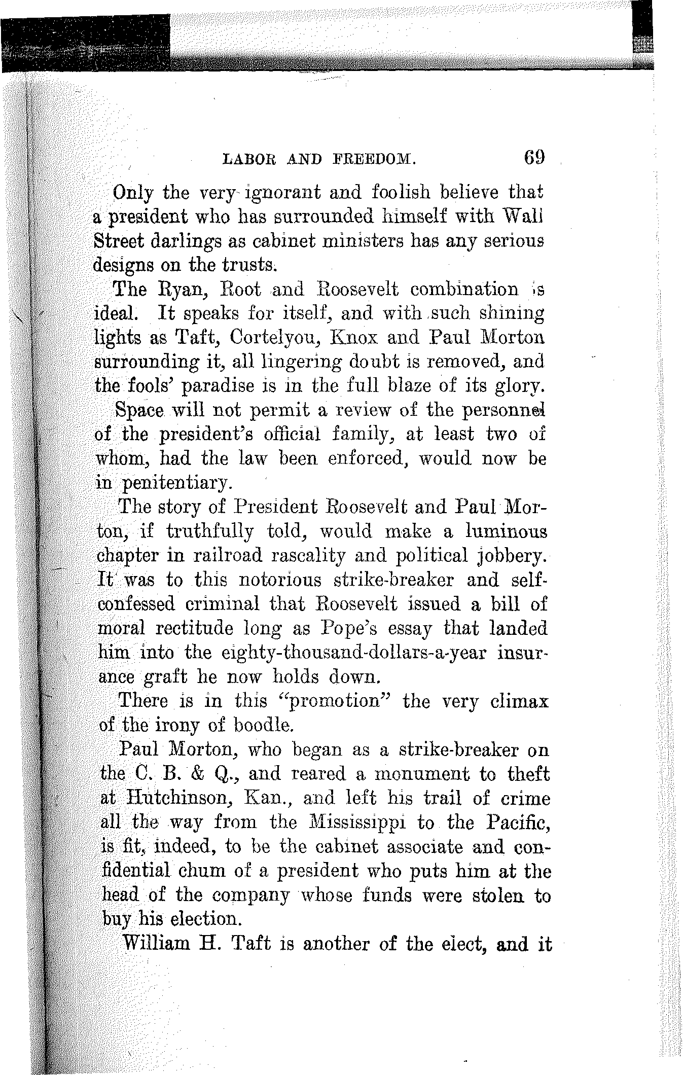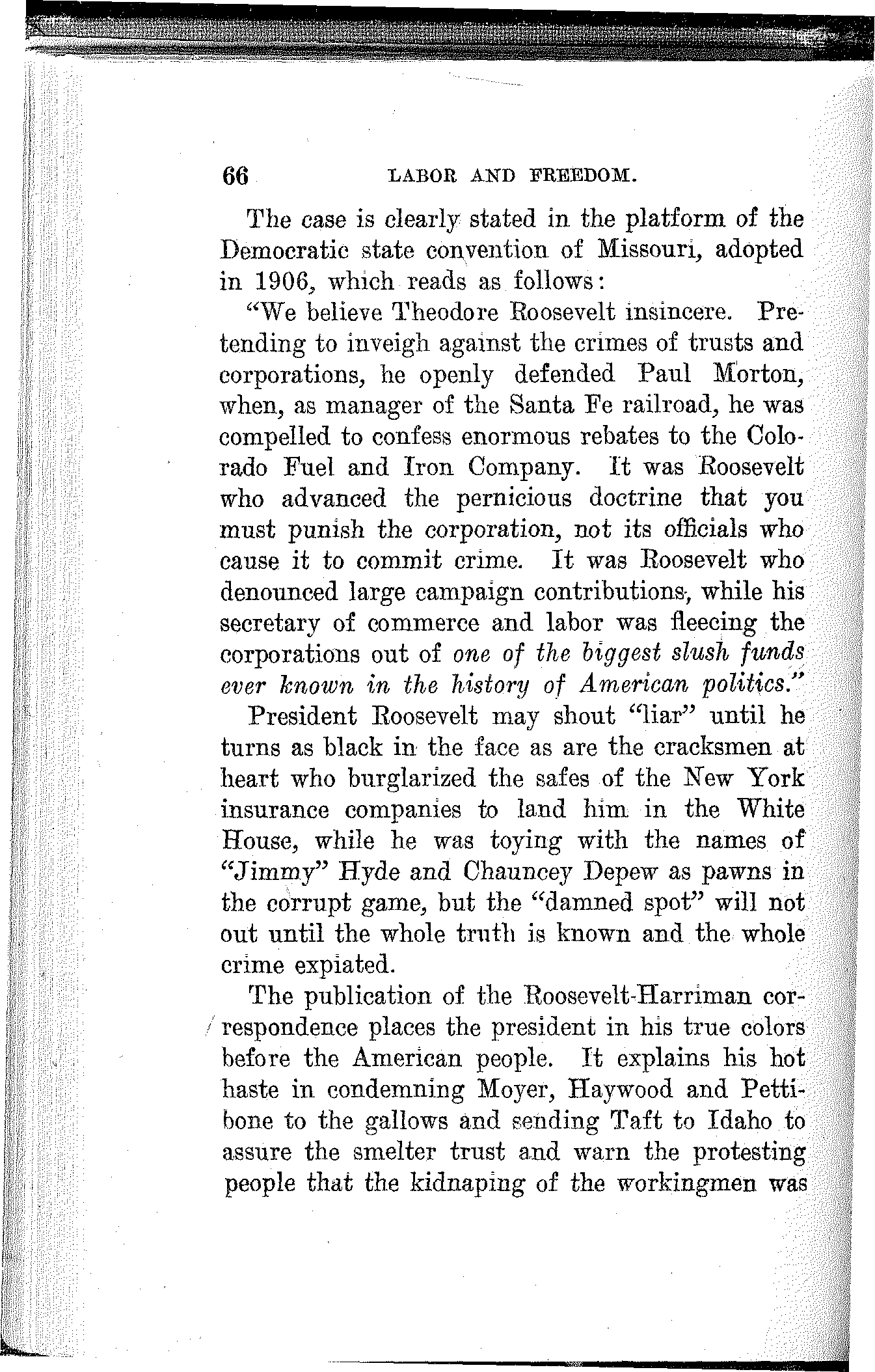 In this struggle which has appealed to the basest and not to the best in man the cunning few have triumphed and now have the masses at their mercy. These few are closely allied in, their economic mastery as they are also in their control of the political machinery. Their money and their mercenaries controlled the Republican convention at Chicago, wrote its platform and dictated its nominees, and the same is true of the Democratic convention at Baltimore.