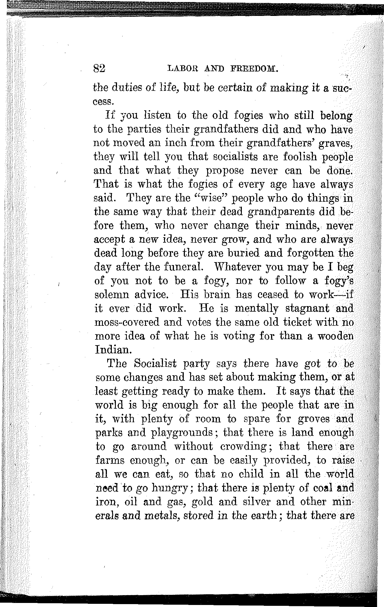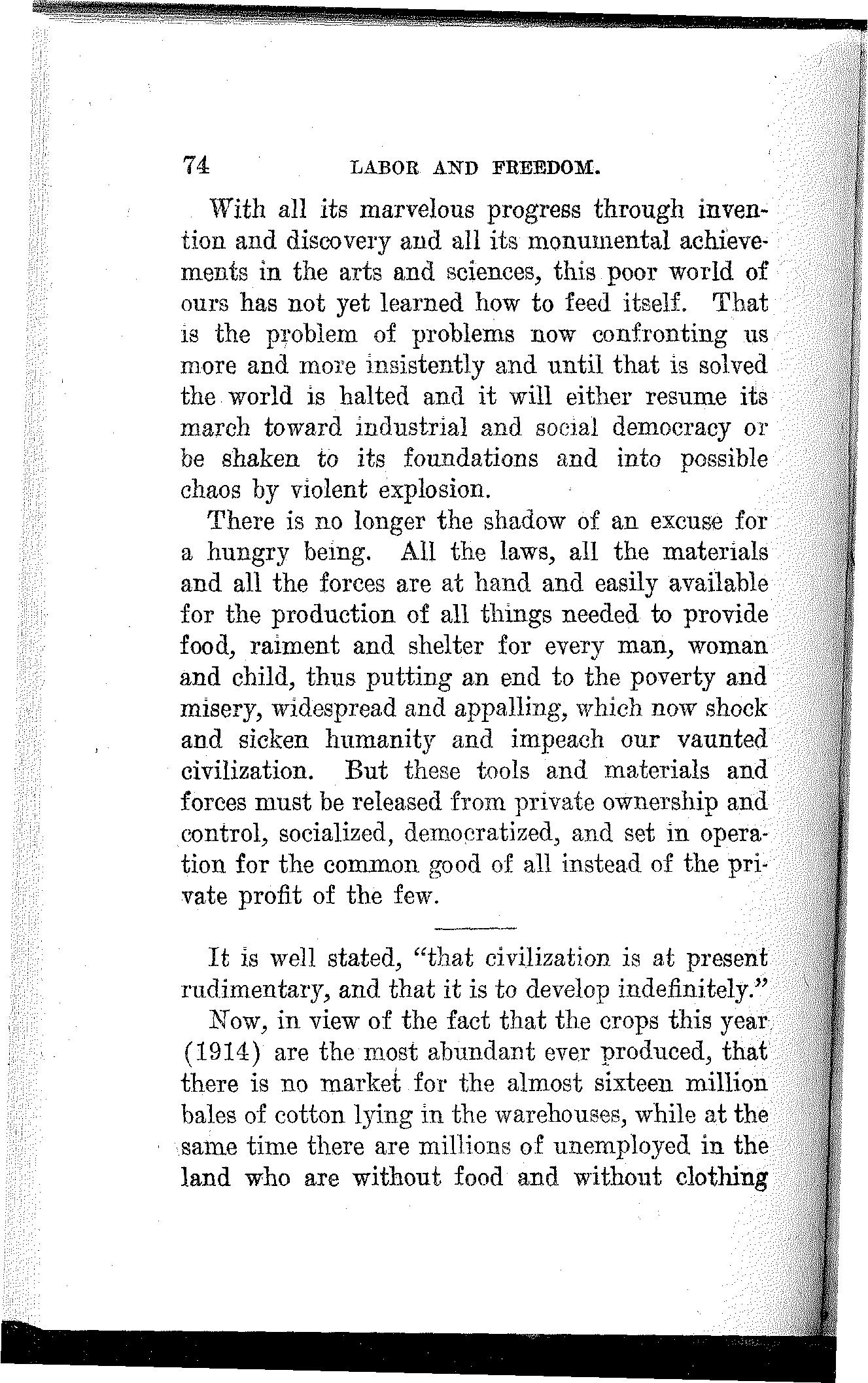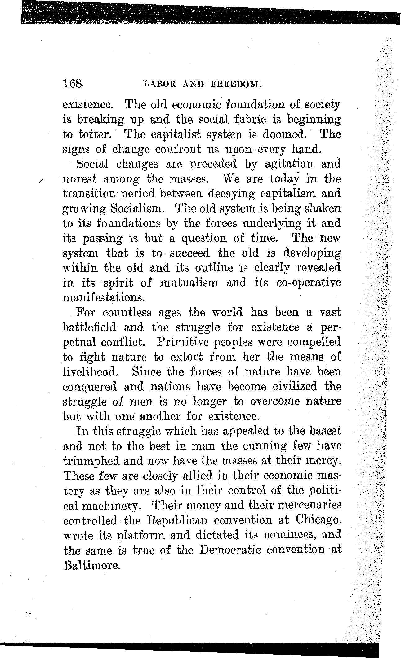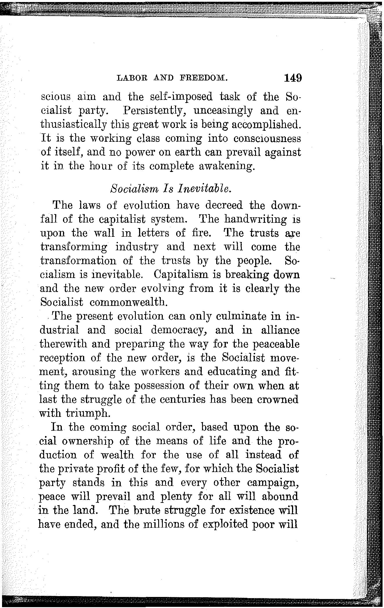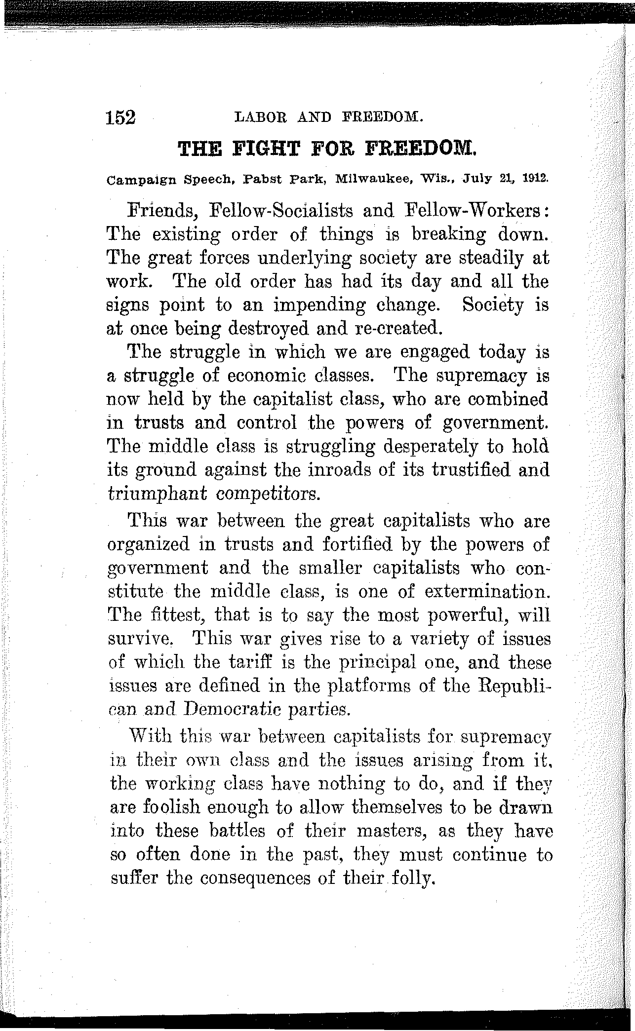 Friends and Fellow-Workers: The spirit of our time is revolutionary and growing, more so every day. A new social order is struggling into[168] existence. The old economic foundation of society is breaking up and the social fabric is beginning to totter. The capitalist system is doomed. The signs of change confront us upon every hand.