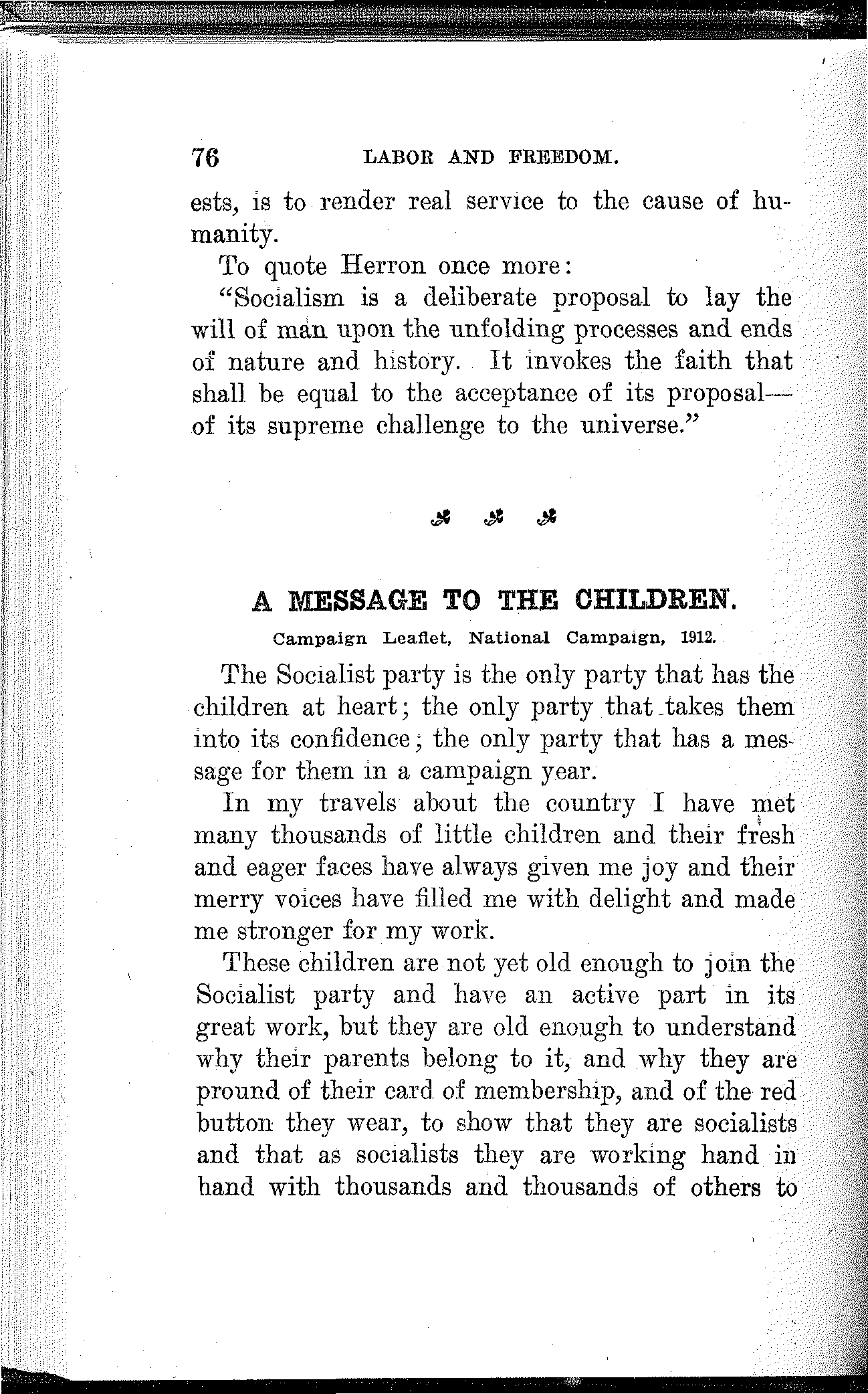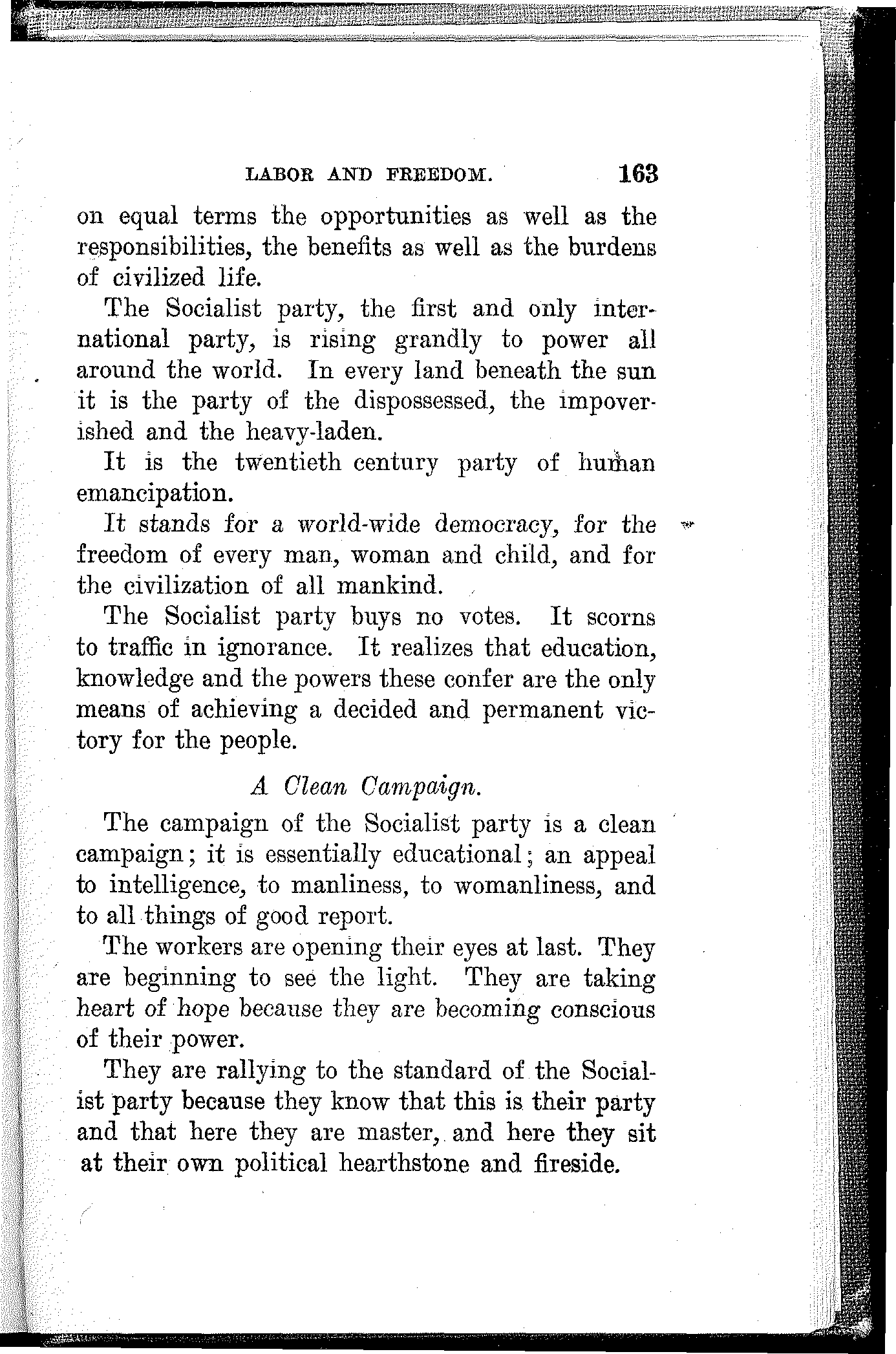 The campaign of the Socialist party is a clean campaign; it is essentially educational; an appeal to intelligence, to manliness, to womanliness, and to all things of good report.