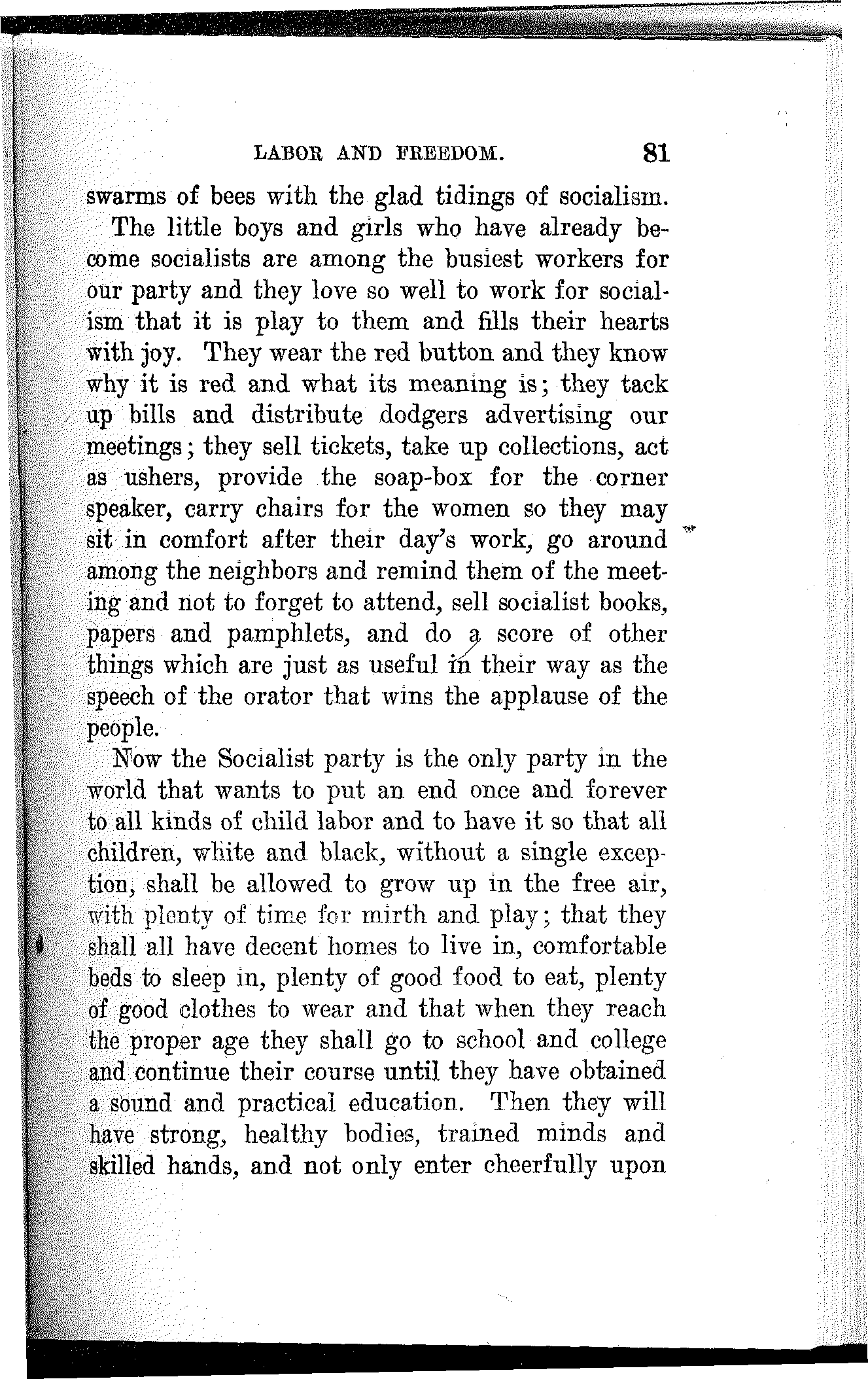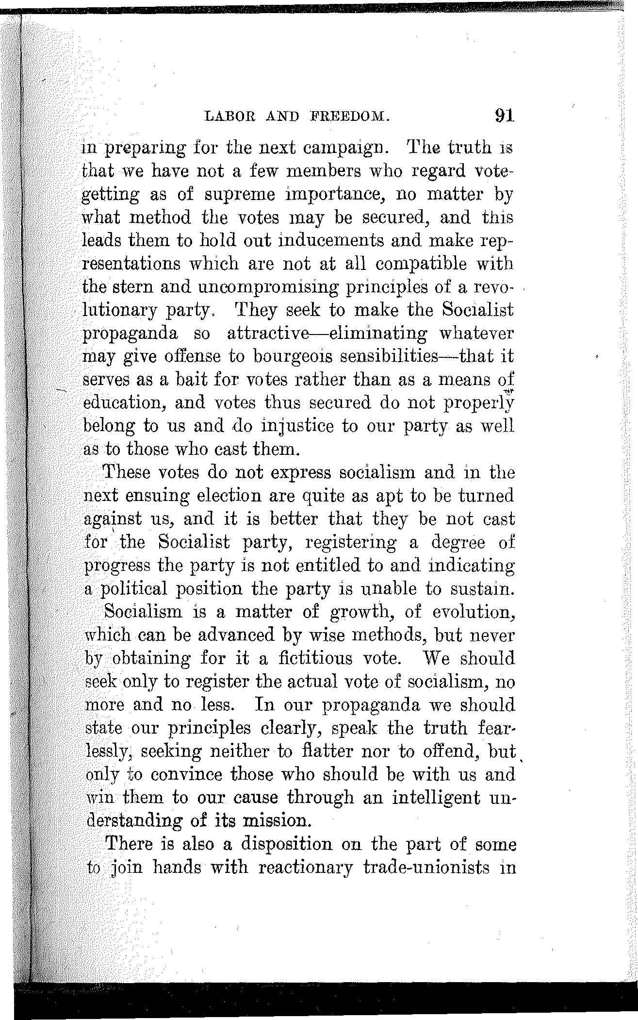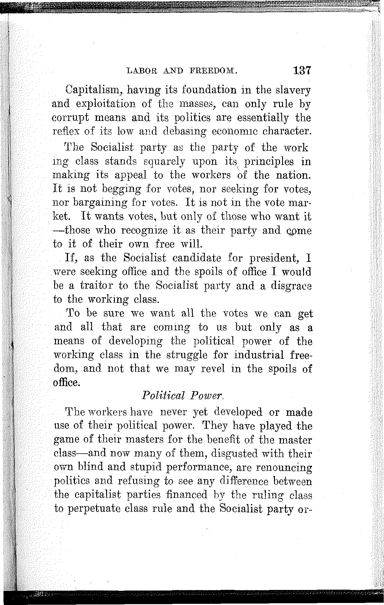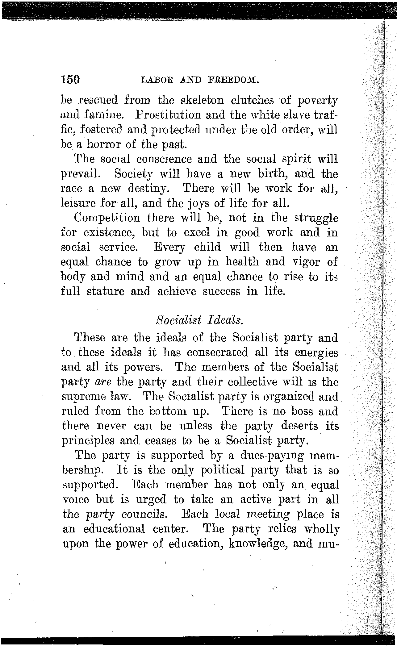 The Socialist party buys no votes. It scorns to traffic in ignorance. It realizes that education, knowledge and the powers these confer are the only means of achieving a decided and permanent victory for the people.