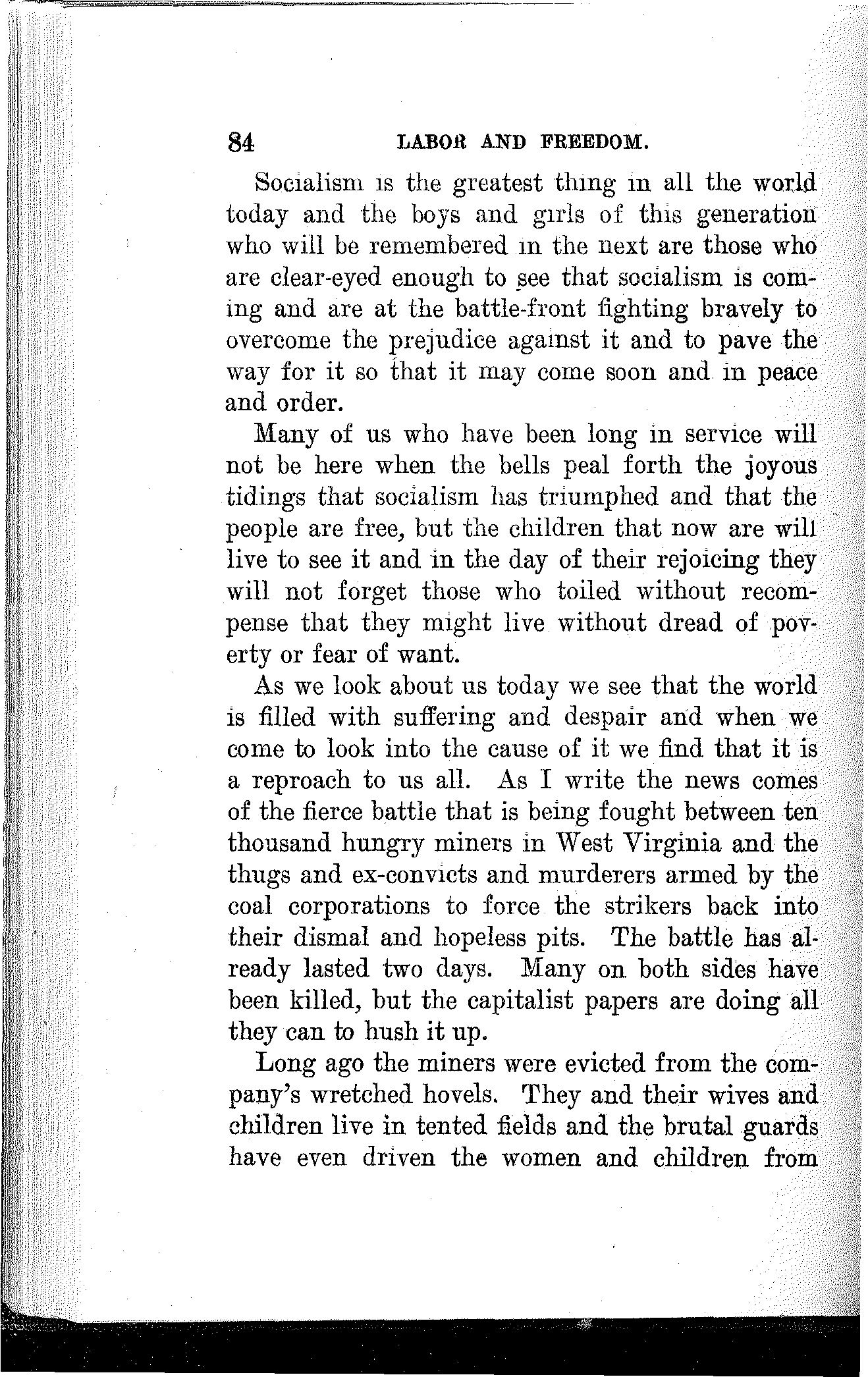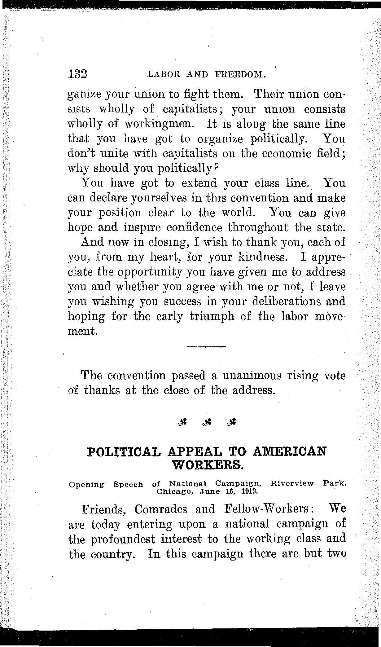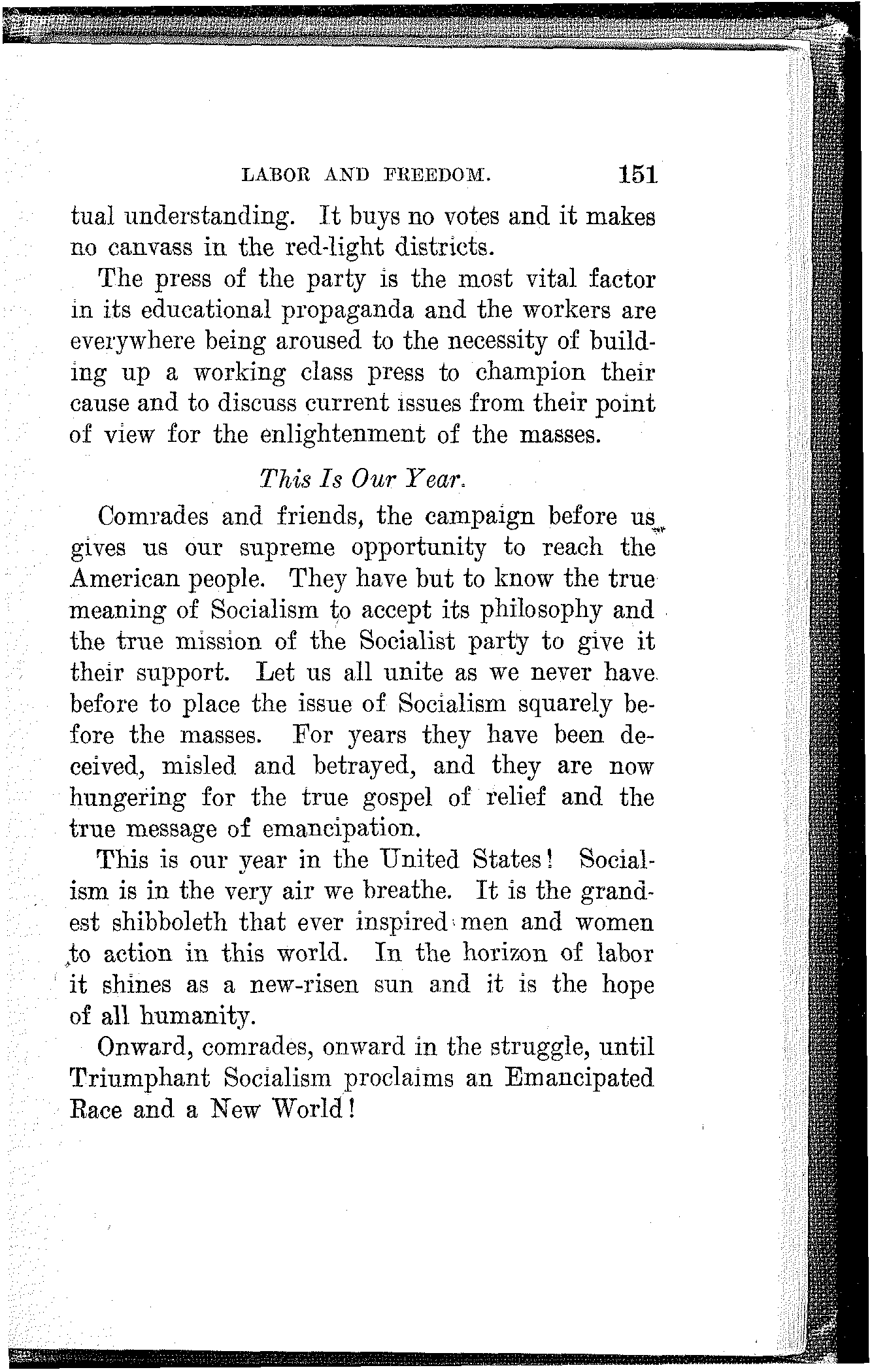 Comrades, you are face to face with the greatest struggle you have ever had since the Socialist party was organized. You are now to be tested in every fiber as to your fitness to hold the ground you have gained and to press on to greater victories. May you be permeated to the core with the spirit of the Socialist movement and enter the fray resolved that victory shall be inscribed upon your banners.