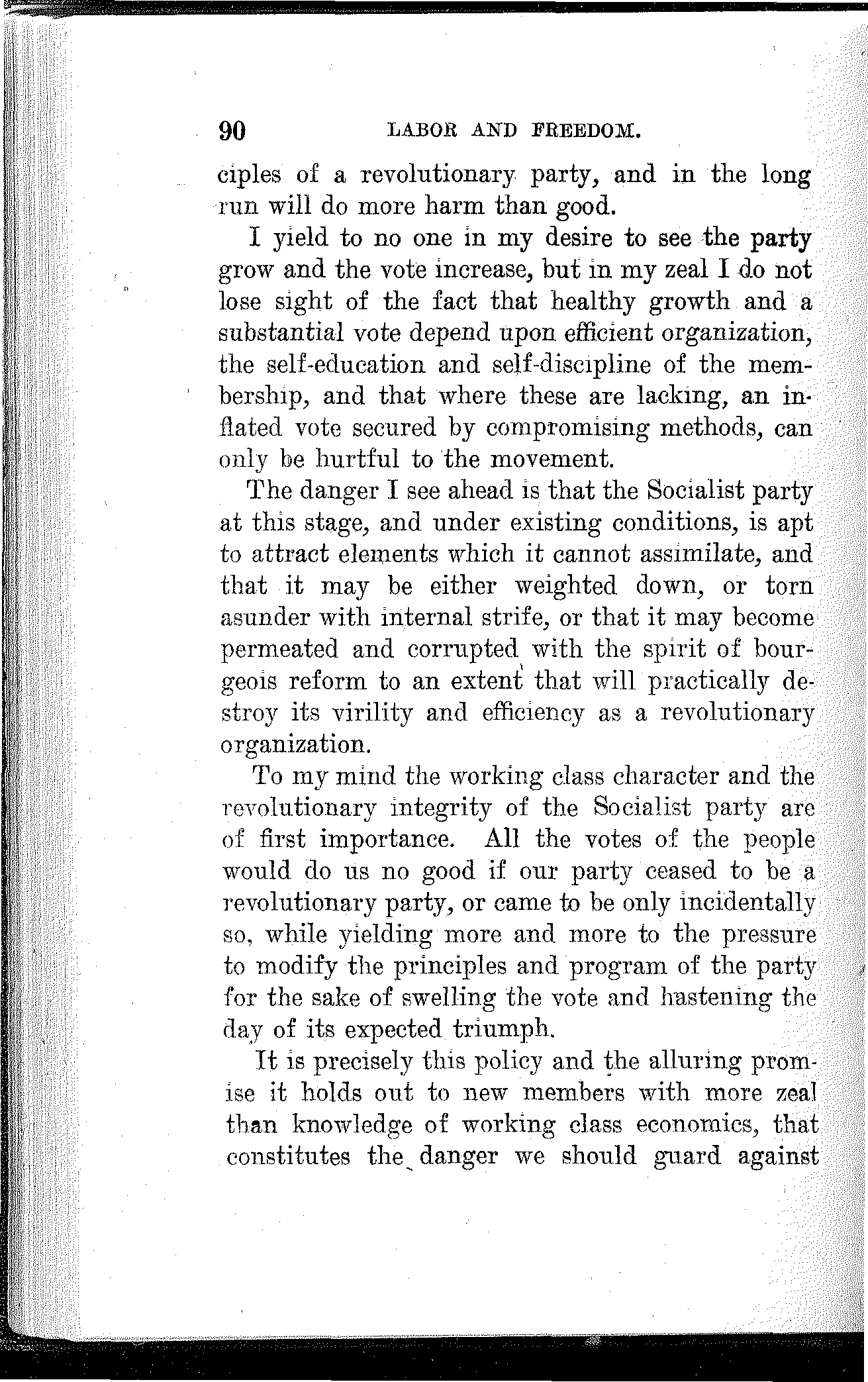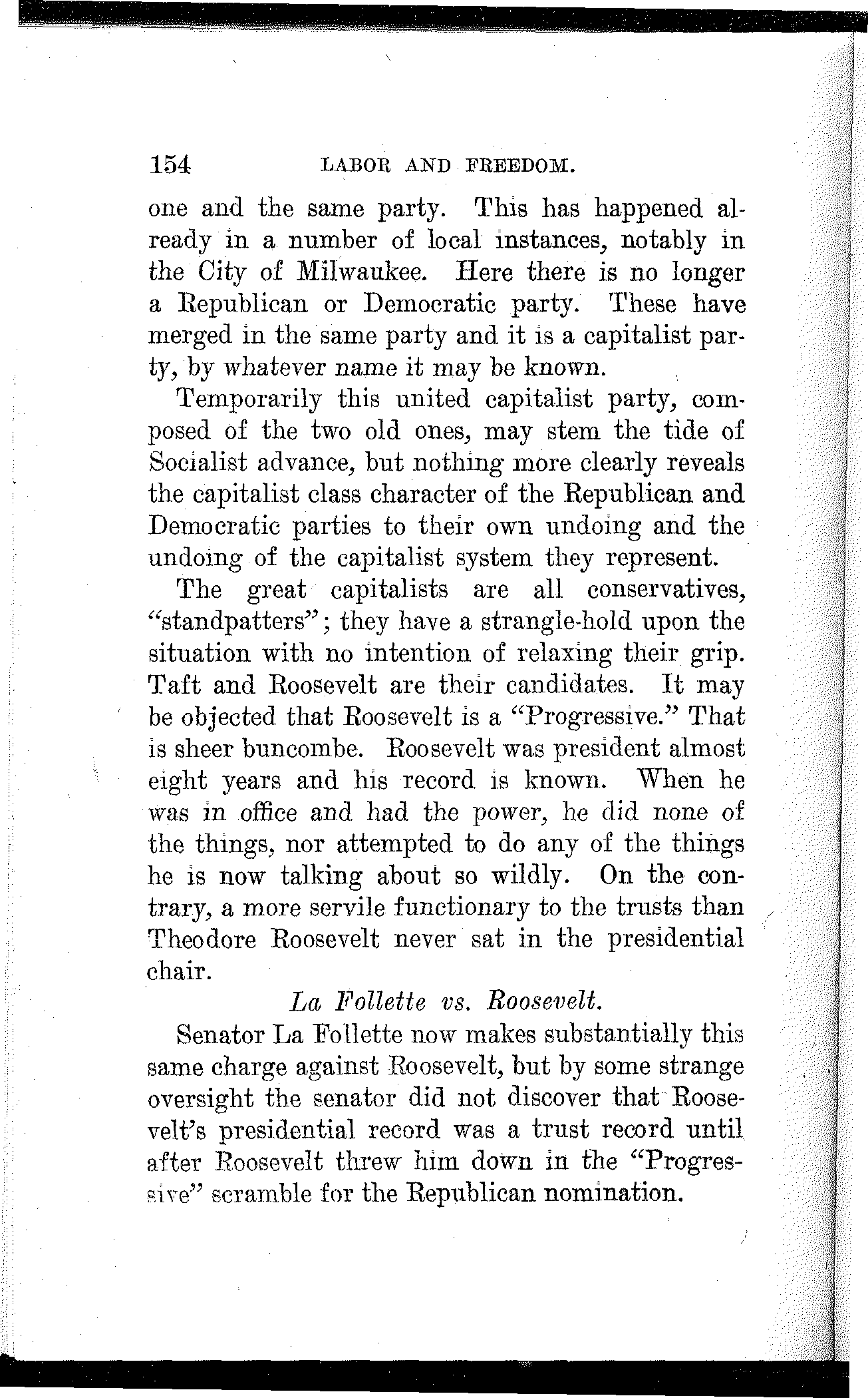 The Socialist party of Milwaukee has marched steadily to the front since it first began its career. Its latest defeat was its greatest victory. It forced the Republicans and Democrats to unmask and to fly into each other's arms. There is no Republican or Democratic party in Milwaukee. They are dead, and in the coming election their remains, masquerading as a party of the people, will be buried by the Socialist party.