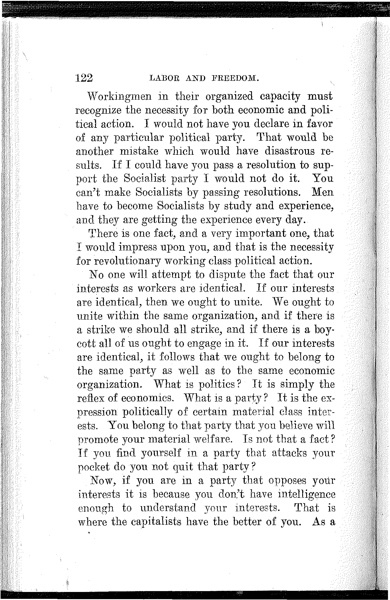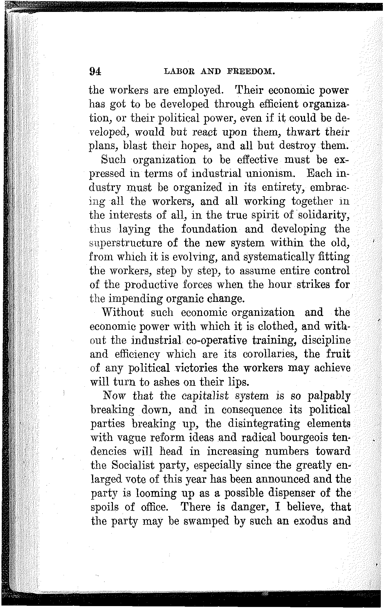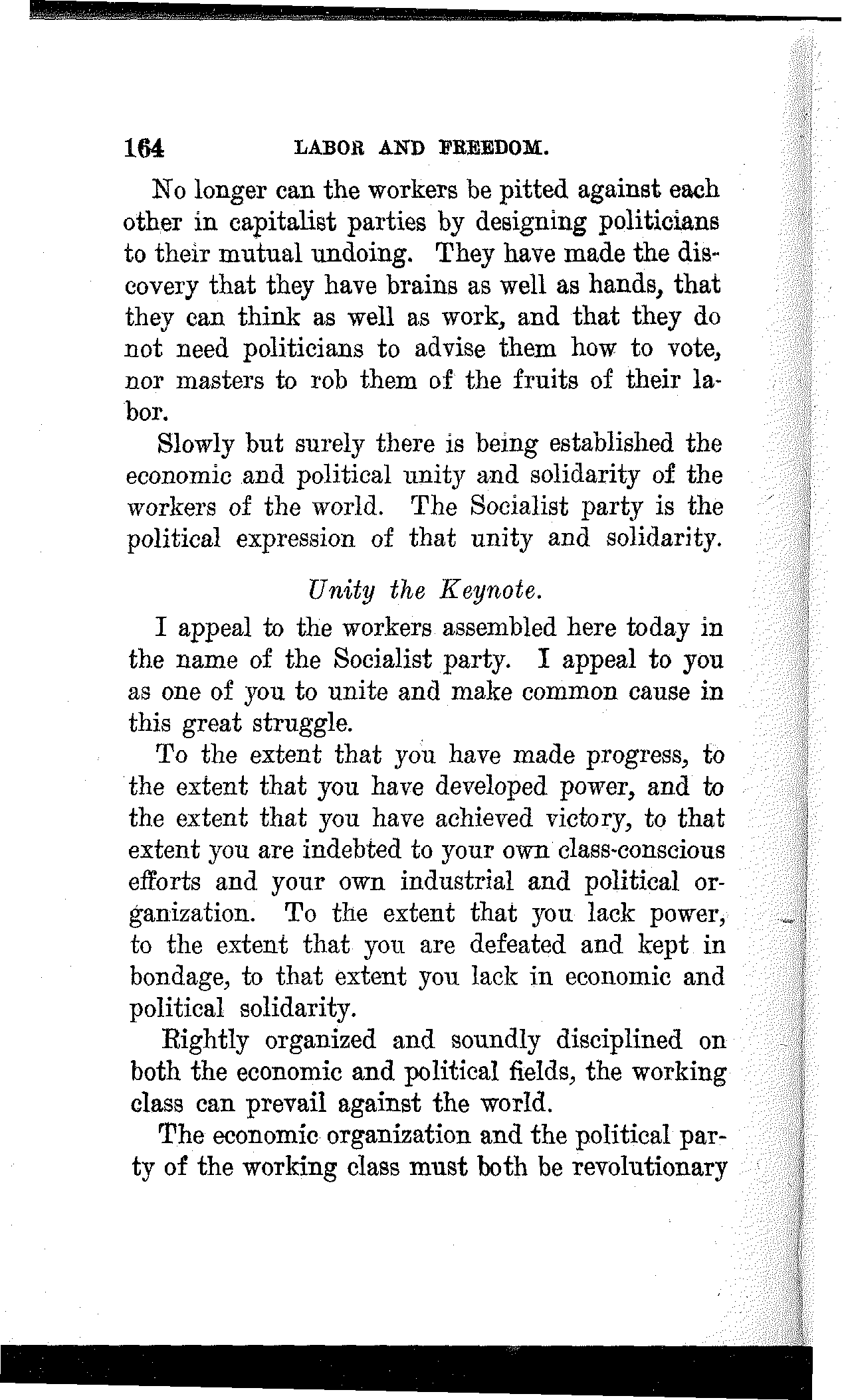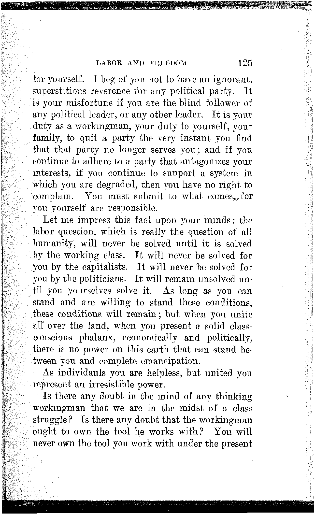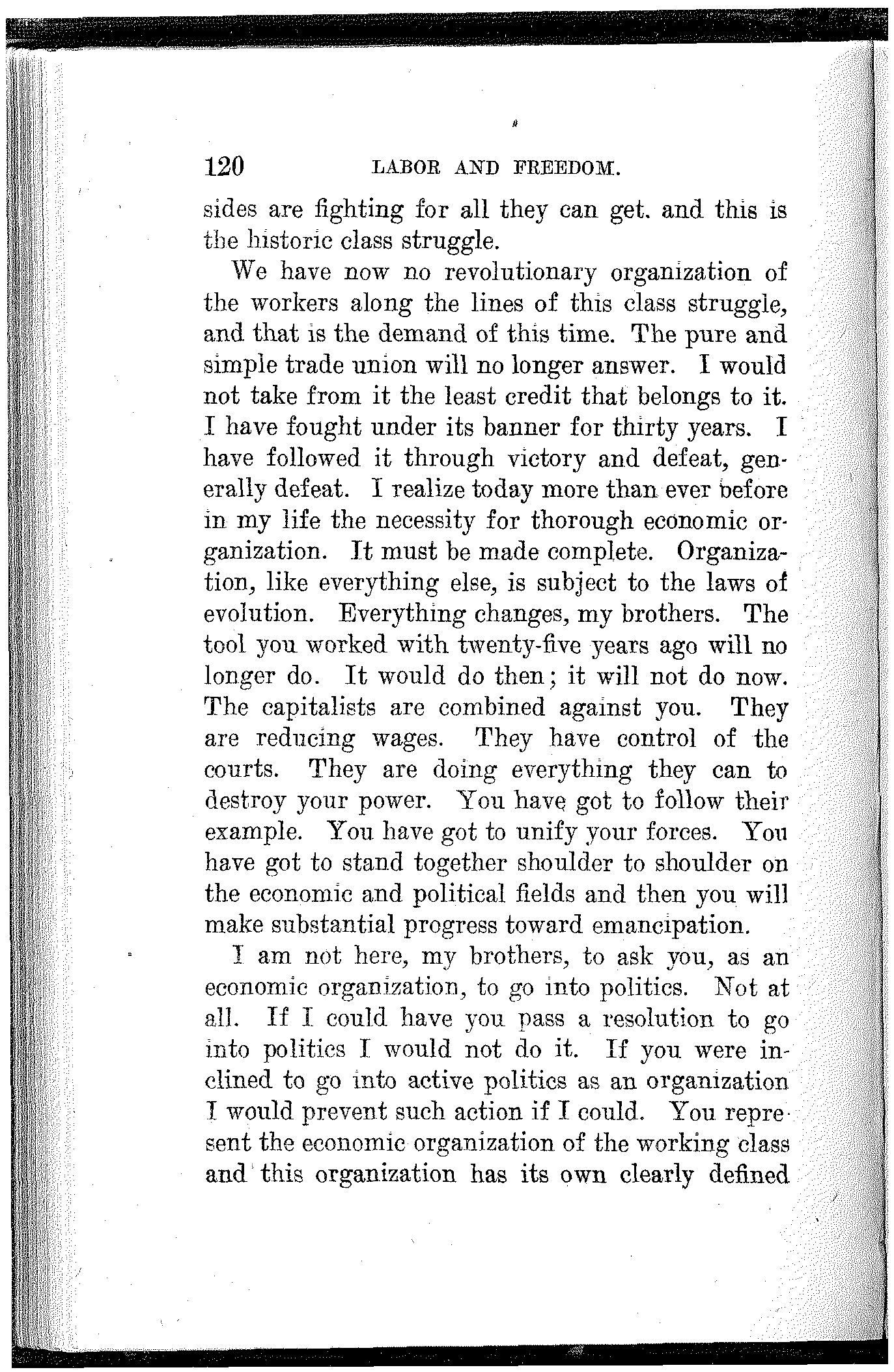 To the extent that you have made progress, to the extent that you have developed power, and to the extent that you have achieved victory, to that extent you are indebted to your own class-conscious efforts and your own industrial and political organization. To the extent that you lack power, to the extent that you are defeated and kept in bondage, to that extent you lack in economic and political solidarity.