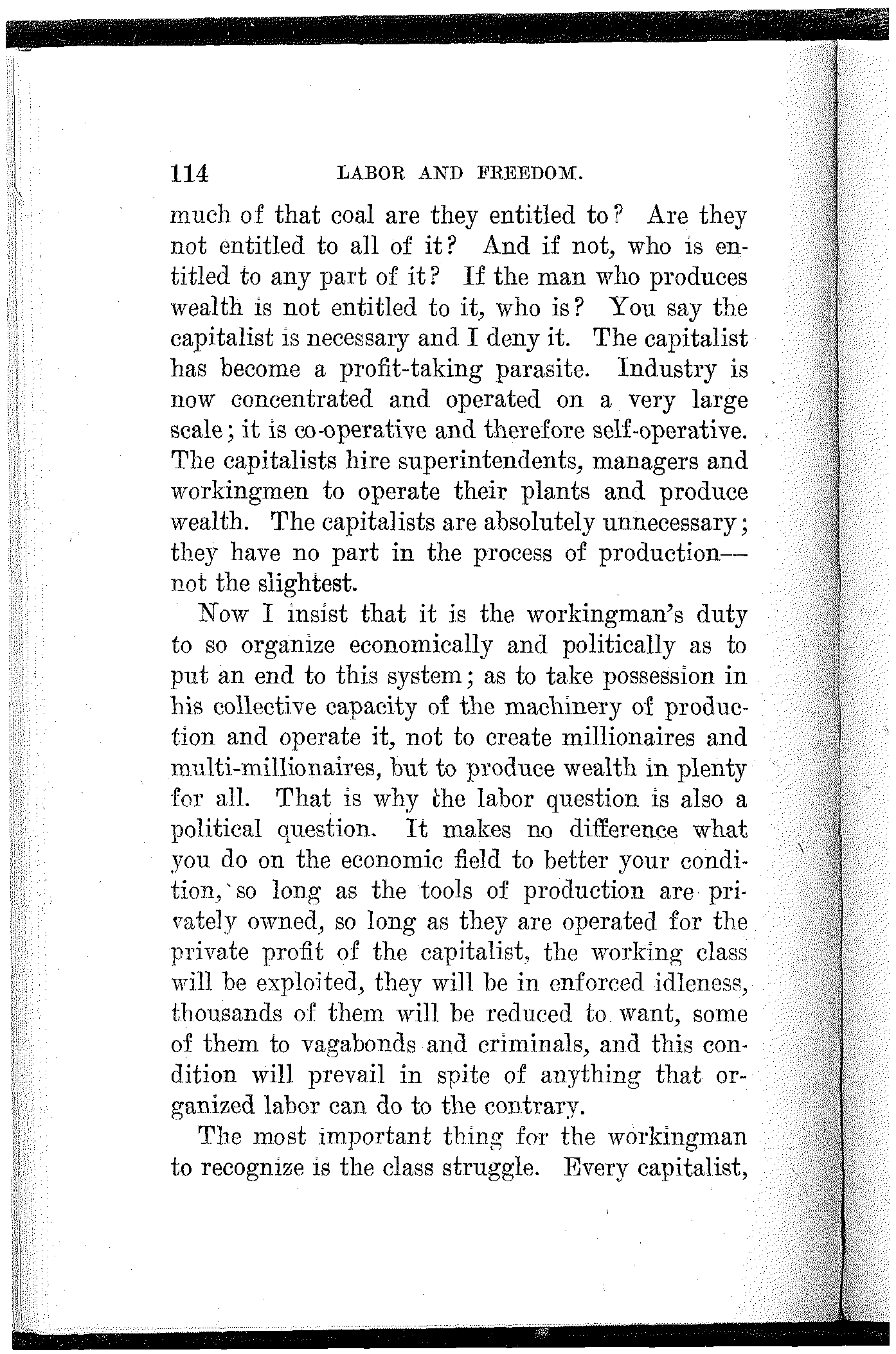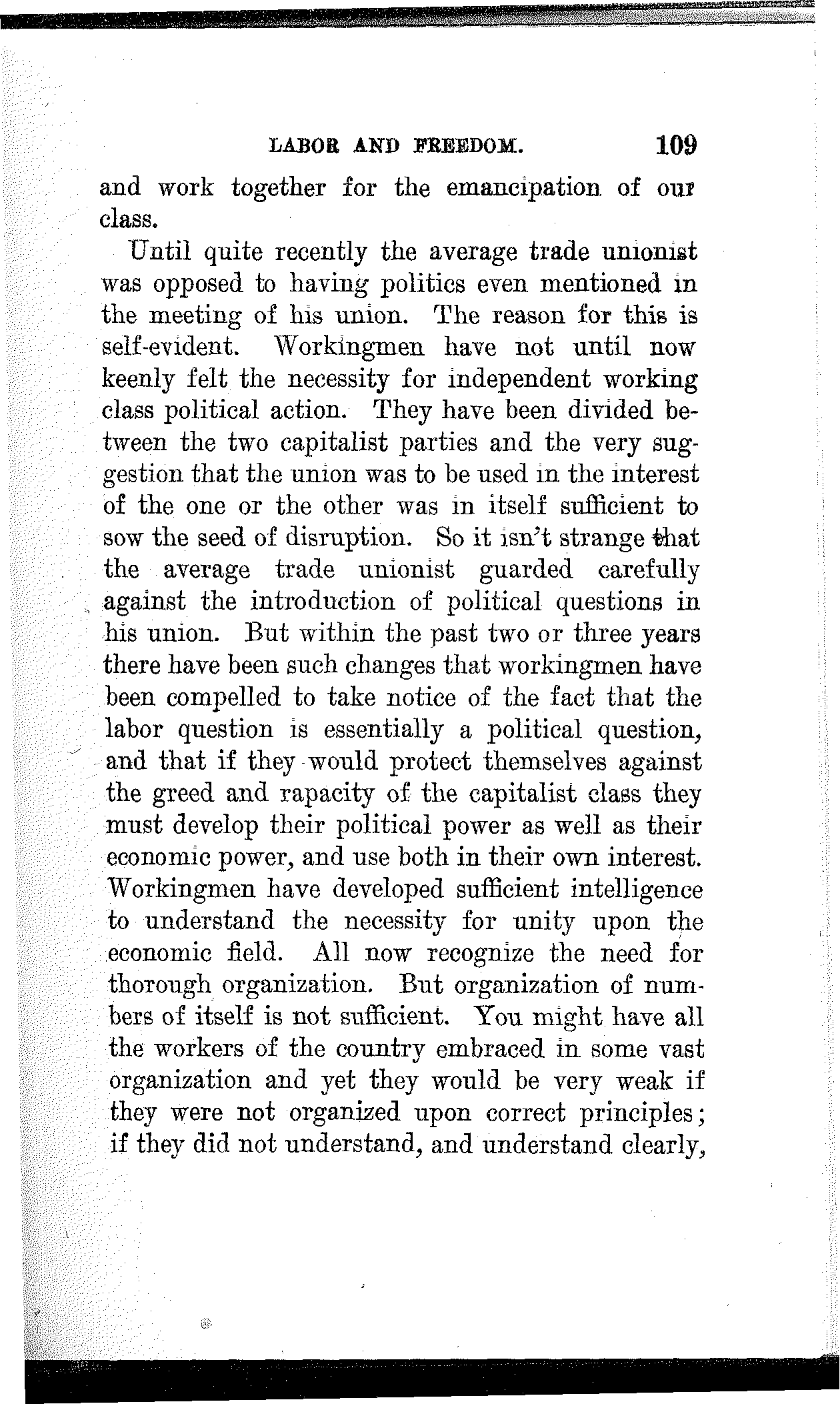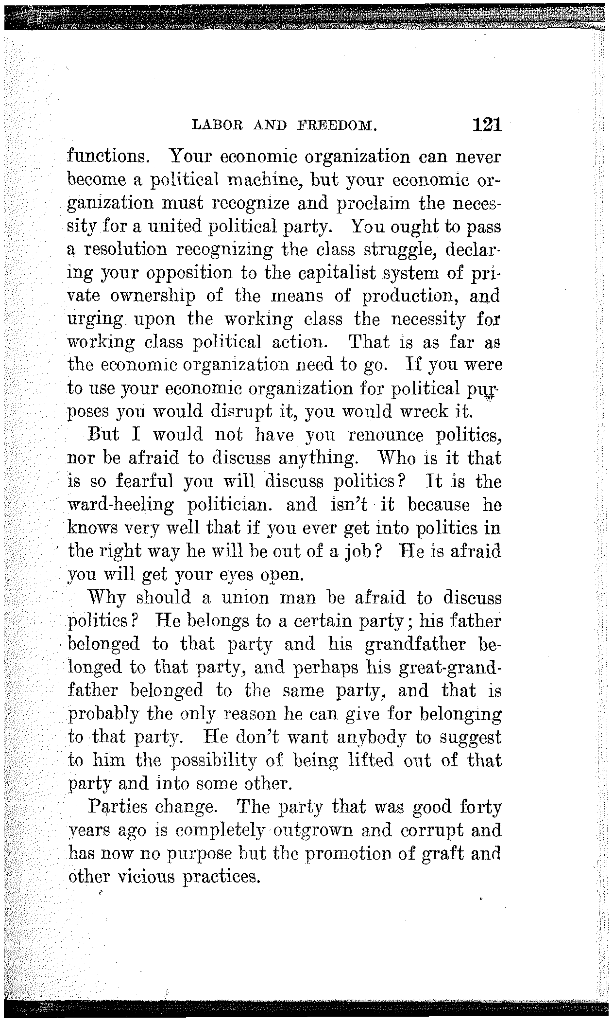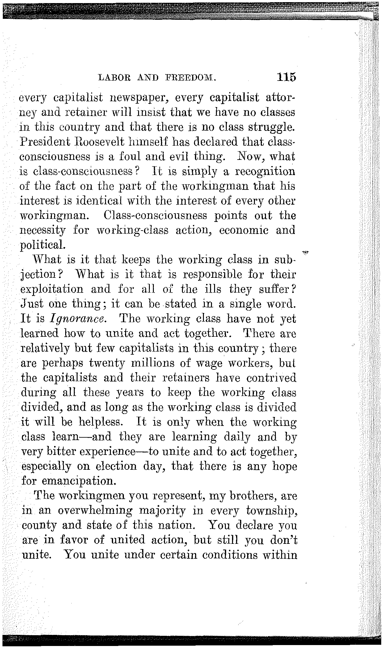 To the extent that you have made progress, to the extent that you have developed power, and to the extent that you have achieved victory, to that extent you are indebted to your own class-conscious efforts and your own industrial and political organization. To the extent that you lack power, to the extent that you are defeated and kept in bondage, to that extent you lack in economic and political solidarity.
