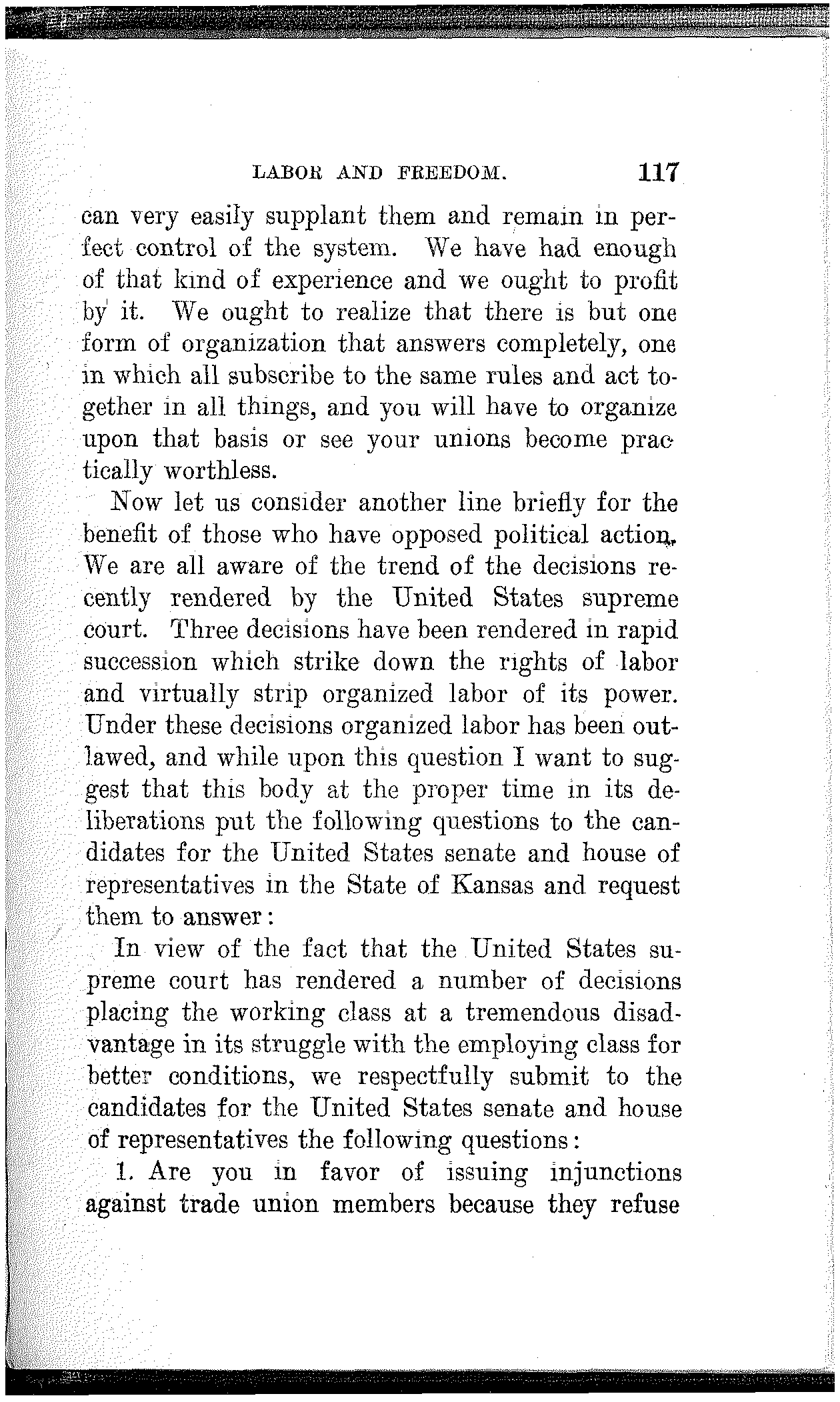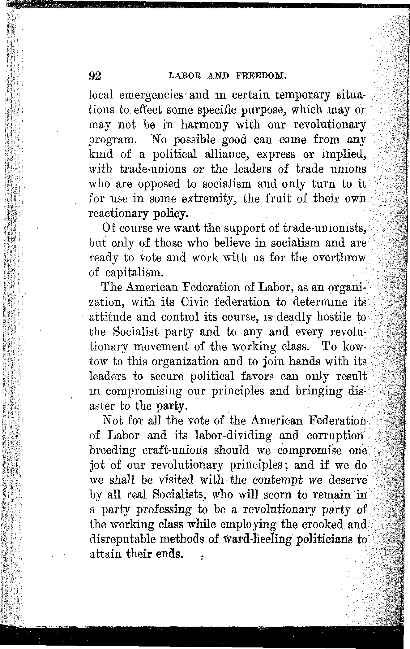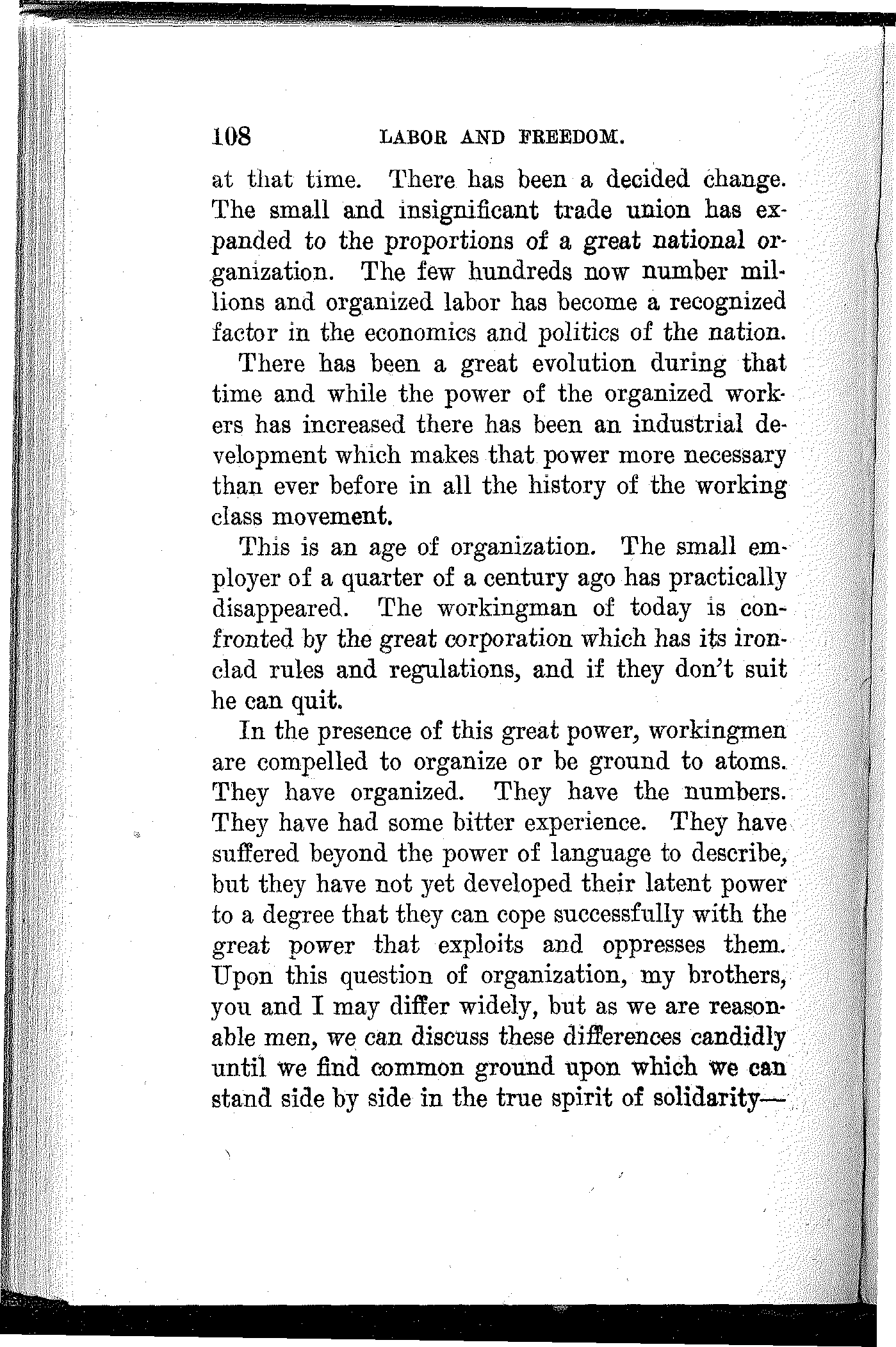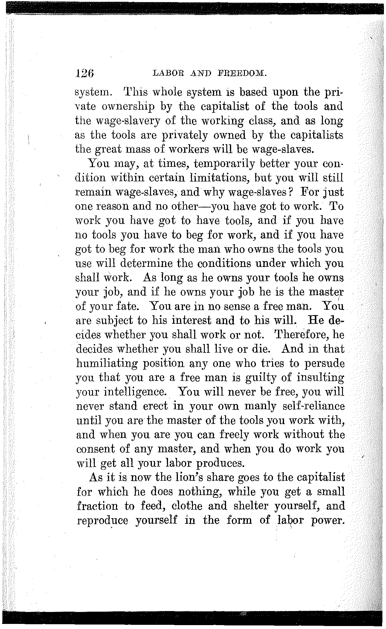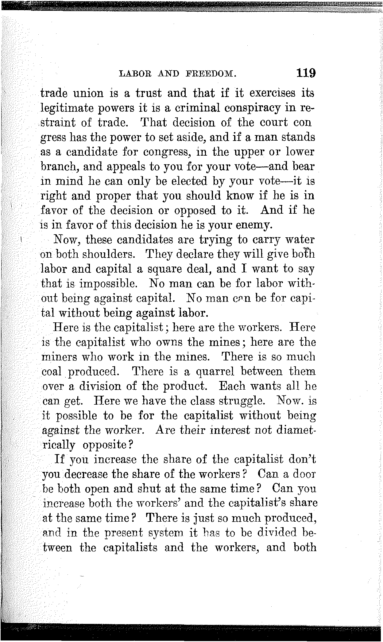To the extent that you have made progress, to the extent that you have developed power, and to the extent that you have achieved victory, to that extent you are indebted to your own class-conscious efforts and your own industrial and political organization. To the extent that you lack power, to the extent that you are defeated and kept in bondage, to that extent you lack in economic and political solidarity.