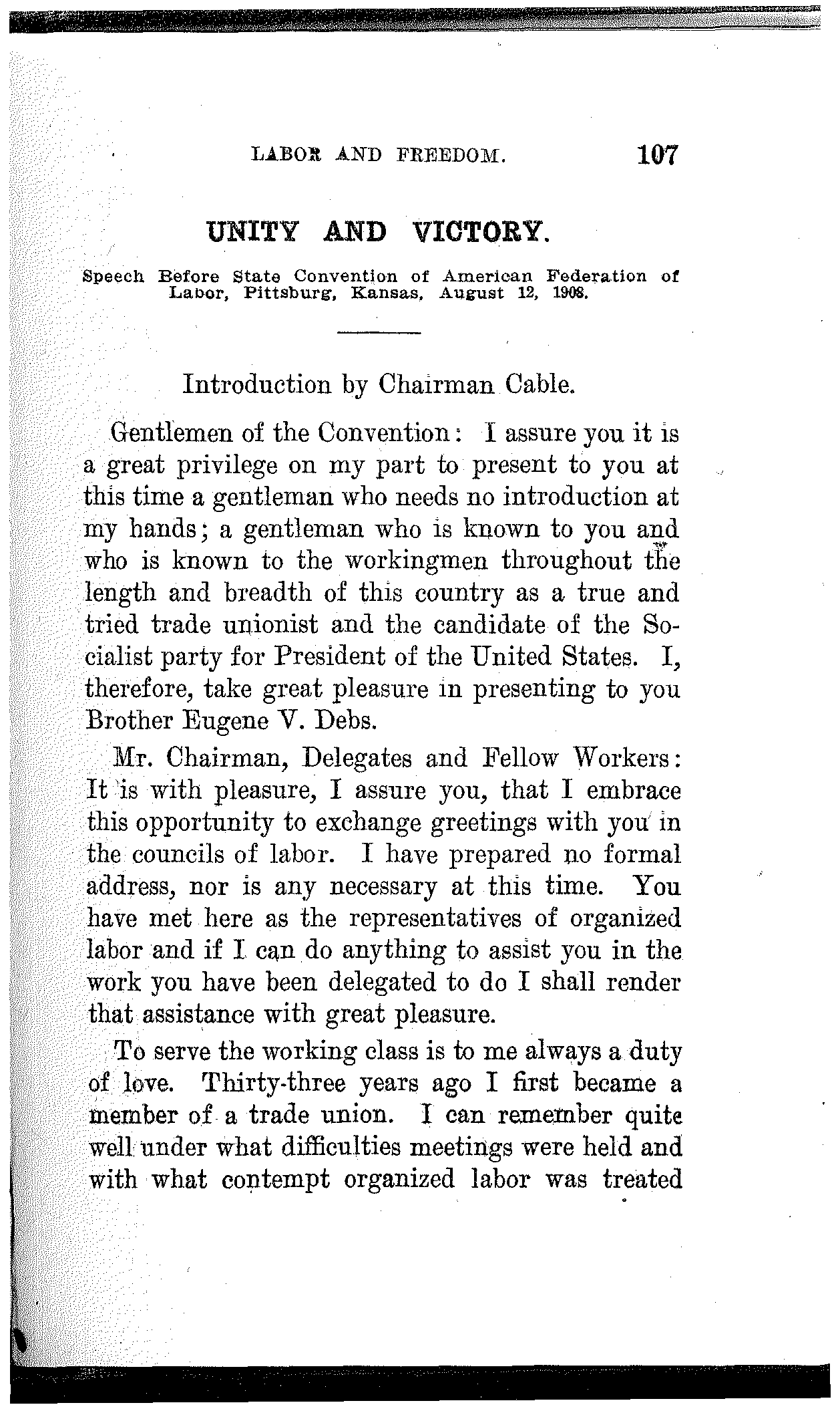 I appeal to the workers assembled here today in the name of the Socialist party. I appeal to you as one of you to unite and make common cause in this great struggle.