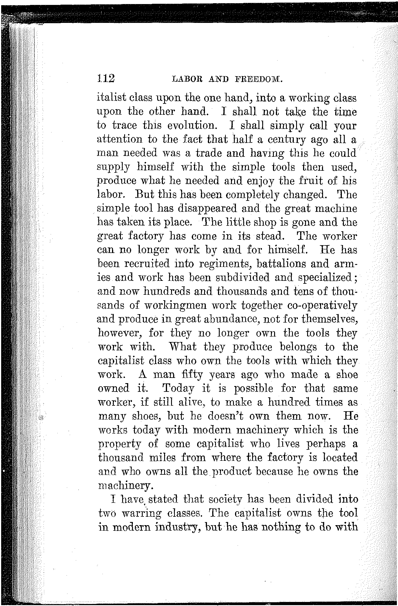 Private ownership and competition have had their day. The Socialist party stands for social ownership and co-operation. The one is Capitalism; the other Socialism. The one industrial despotism, the other industrial democracy.
