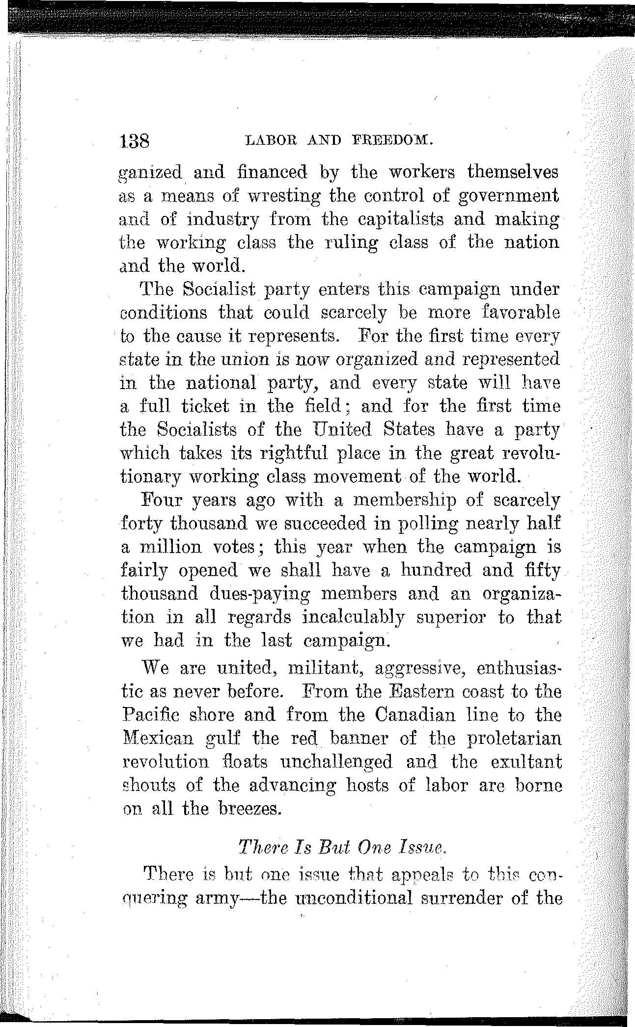 The Socialist party is the only party in this campaign that stands against the present system and for the rule of the people; the only party that boldly avows itself the party of the working class and its purpose the overthrow of wage-slavery.