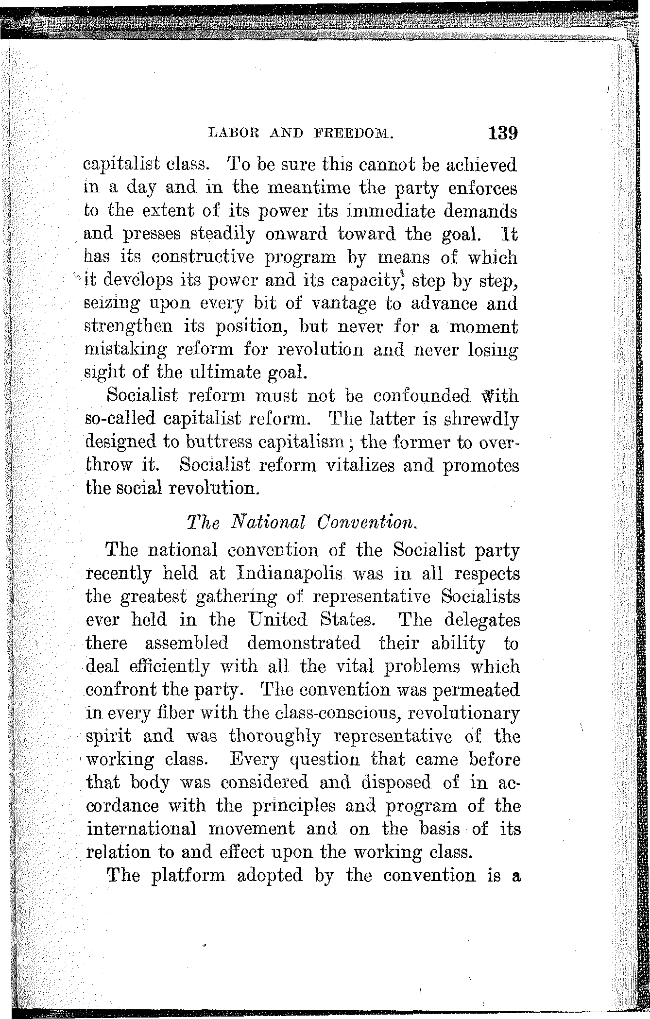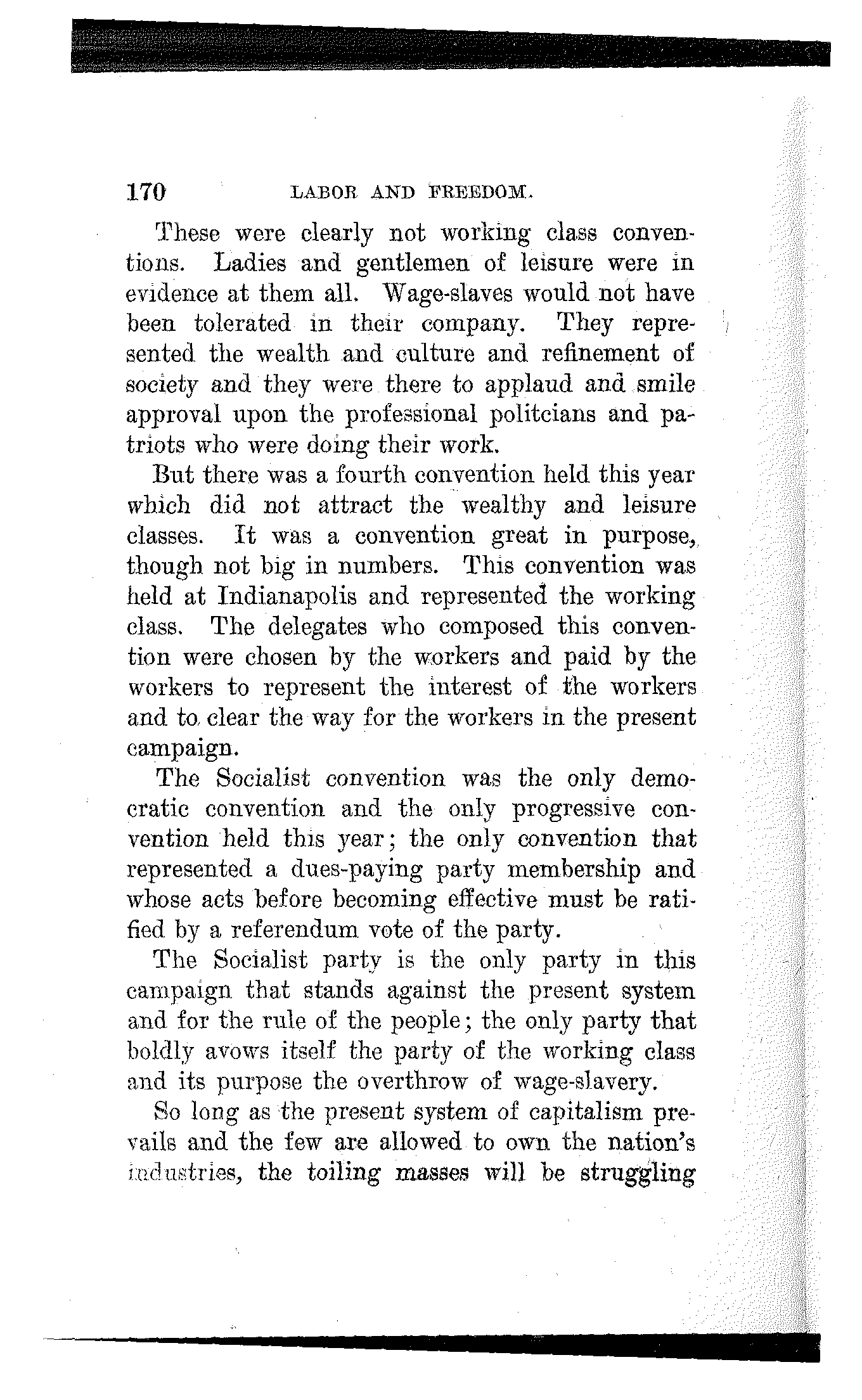 But there was a fourth convention held this year which did not attract the wealthy and leisure classes. It was a convention great in purpose, though not big in numbers. This convention was held at Indianapolis and represented the working class. The delegates who composed this convention were chosen by the workers and paid by the workers to represent the interest of the workers and to clear the way for the workers in the present campaign.