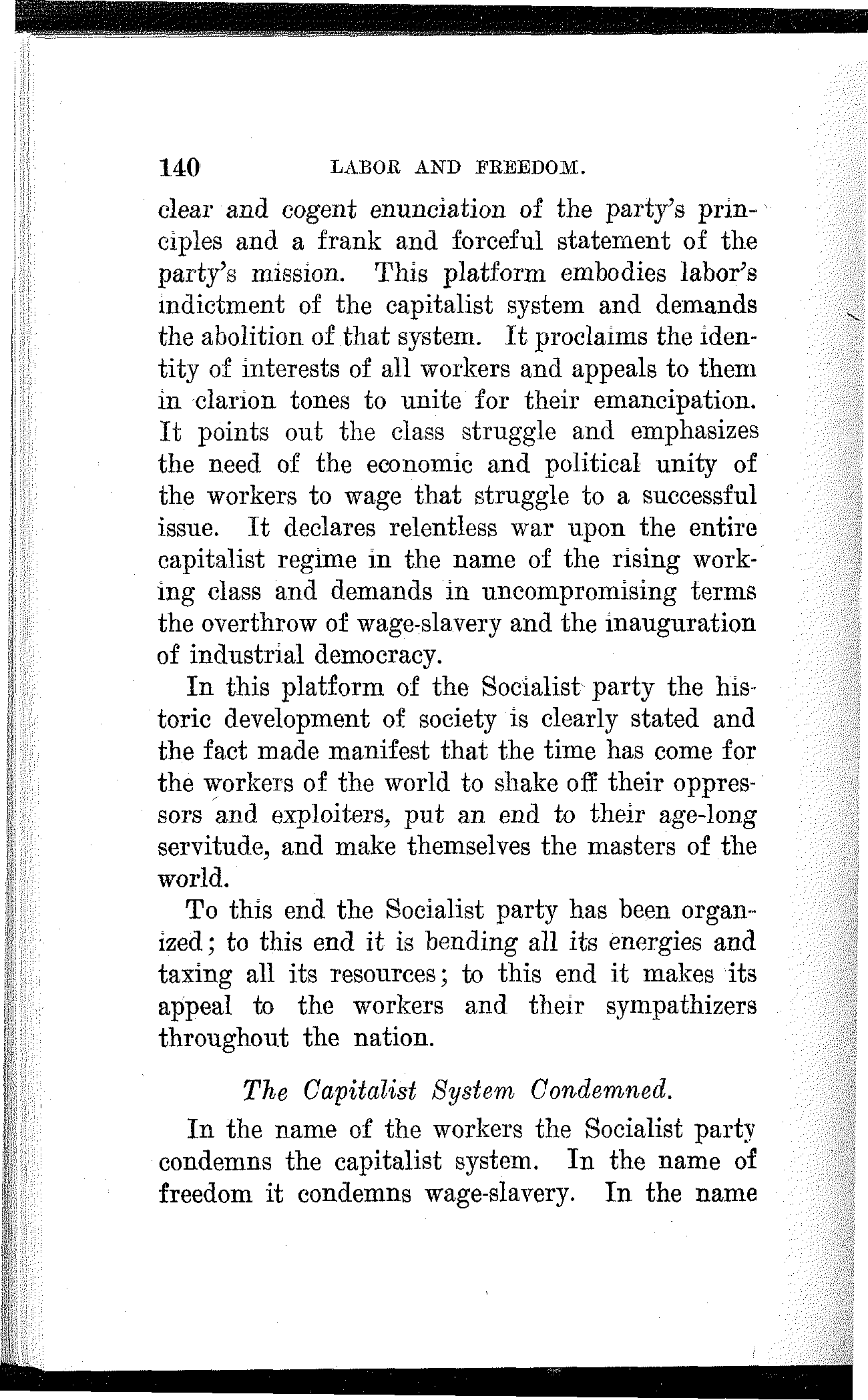 The Socialist party being the political expression of the rising working class stands for the absolute overthrow of the existing capitalist system and for the reorganization of society into an industrial and social democracy.