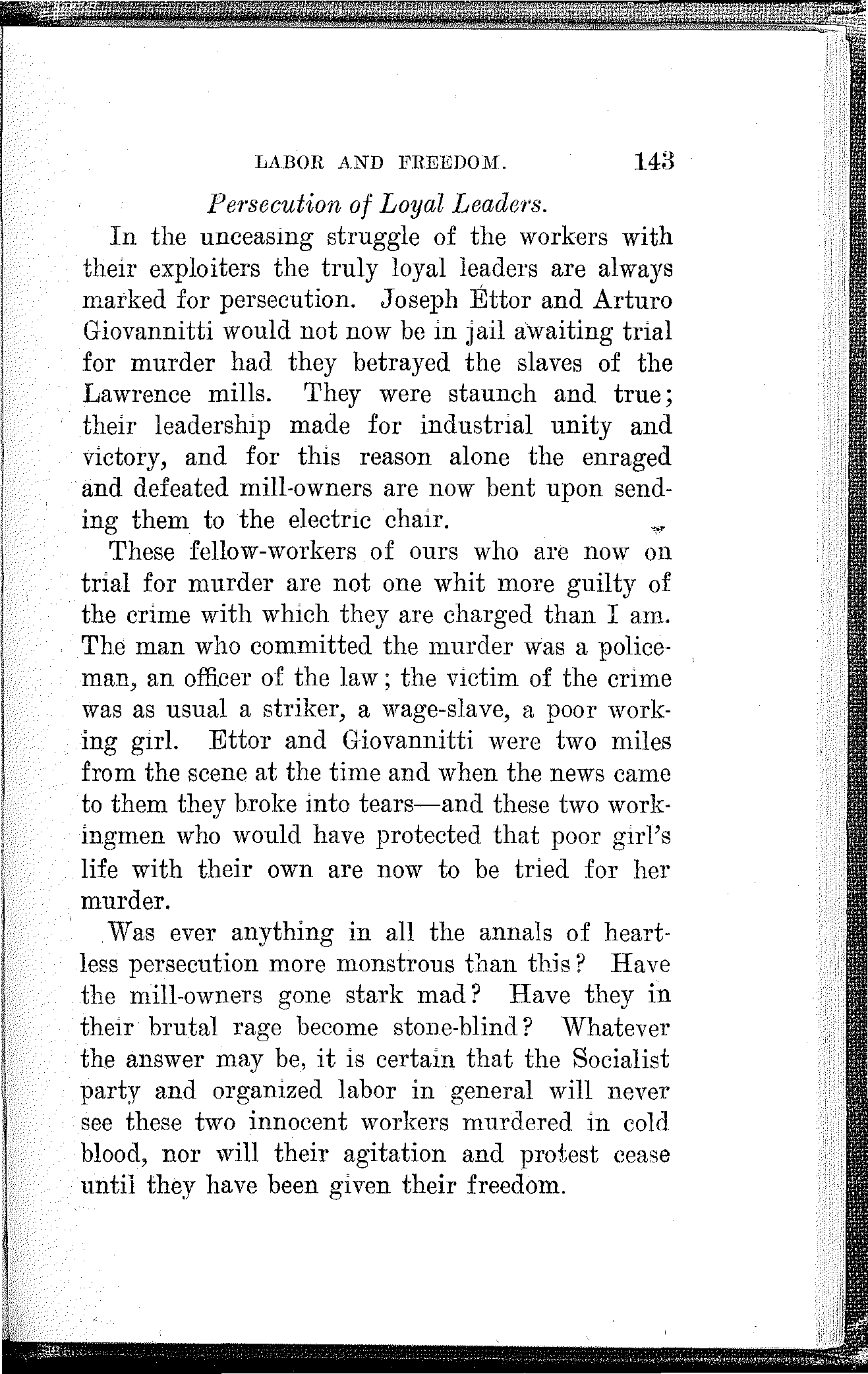 This infamous charge has been trumped up against them by the defeated mill owners for no other reason than that they stood up bravely and fought successfully against great odds, the battles of the wage-slaves of the mills. Unless the workers unite in support of these two leaders they may be sent to the electric chair. Should we suffer these brave comrades to fall victims to such a monstrous crime, it would be a foul and indelible blot upon the whole labor movement. Let us arouse the workers of the nation in their behalf and prove to them when their trial takes place that we are as true to them as they were to the wage-slaves in the industrial battle at Lawrence.
