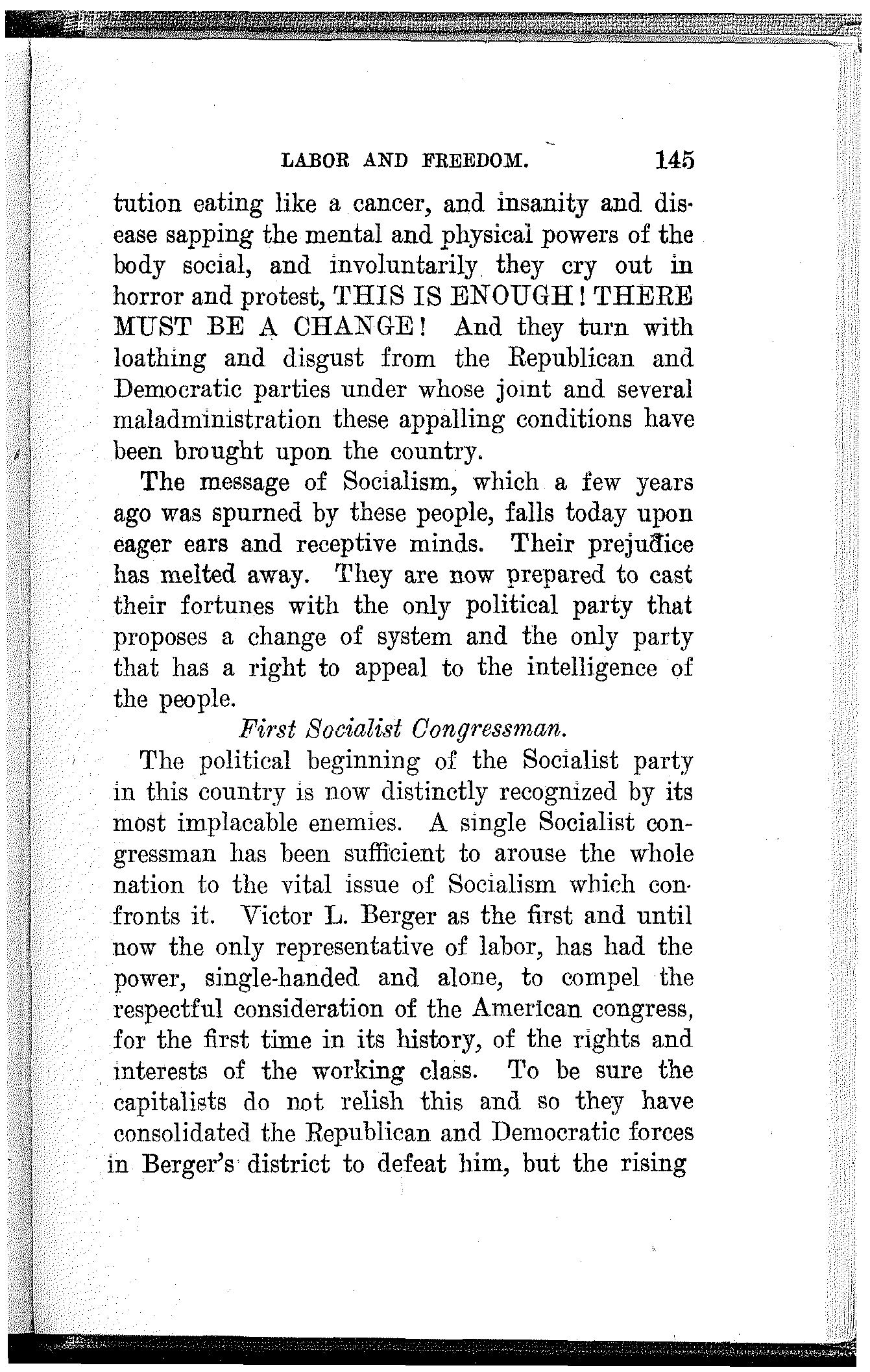 The Socialists of Milwaukee will always have the distinction of having elected the first representative of the working class to the congress of the United States. Victor L. Berger has made[166] good at Washington. For the first time since he is a member the voice of labor has been distinctly heard on the floors of congress, and in every emergency when the working class needed a champion at the seat of power, they found him ready and eager to espouse their cause and defend their interests.