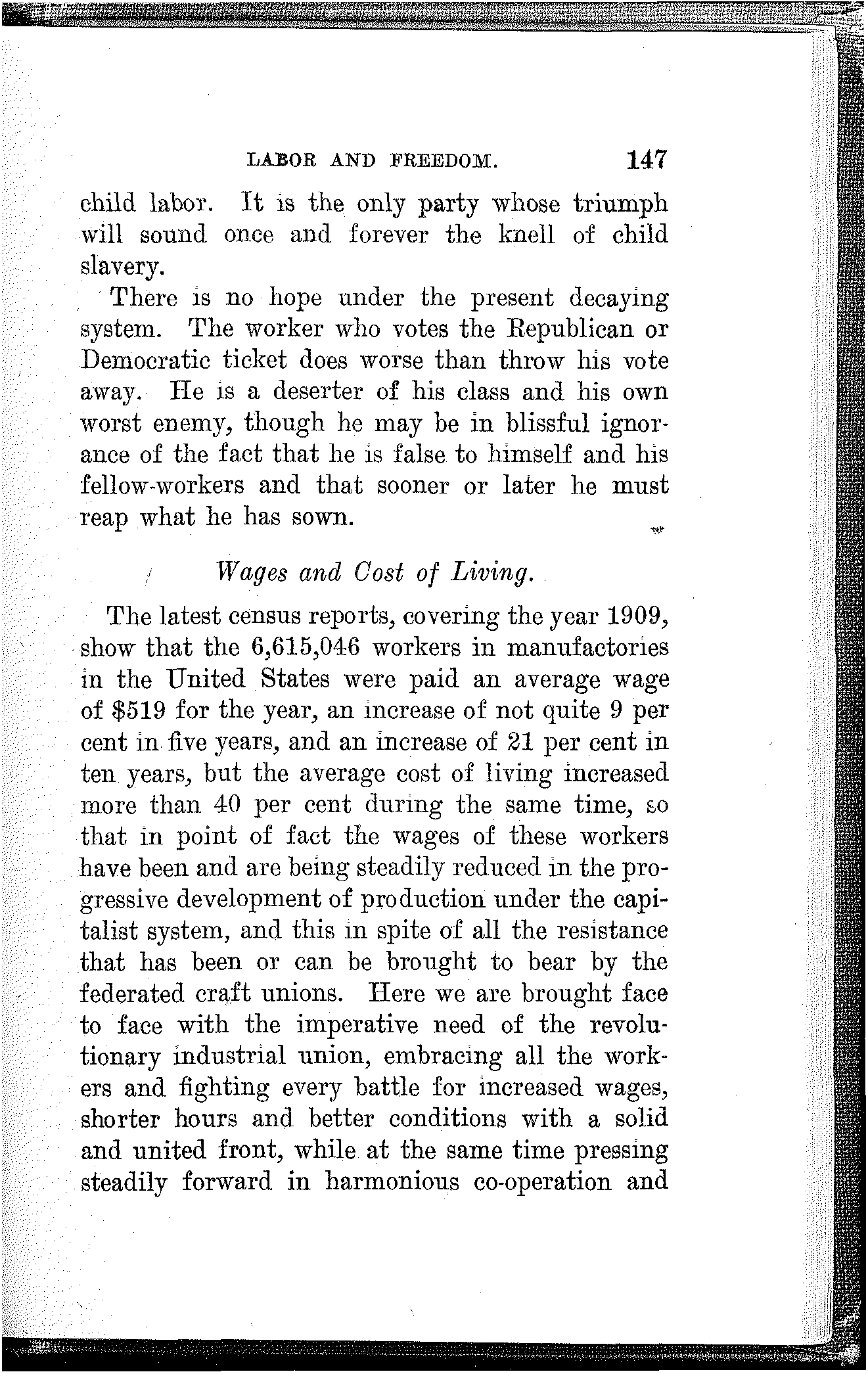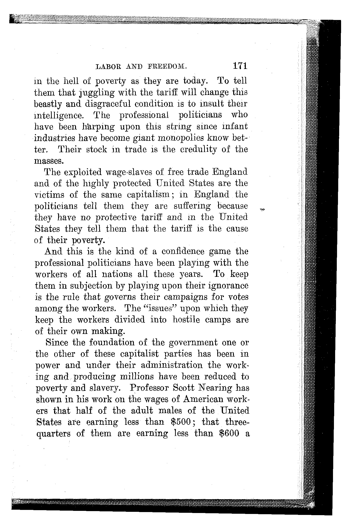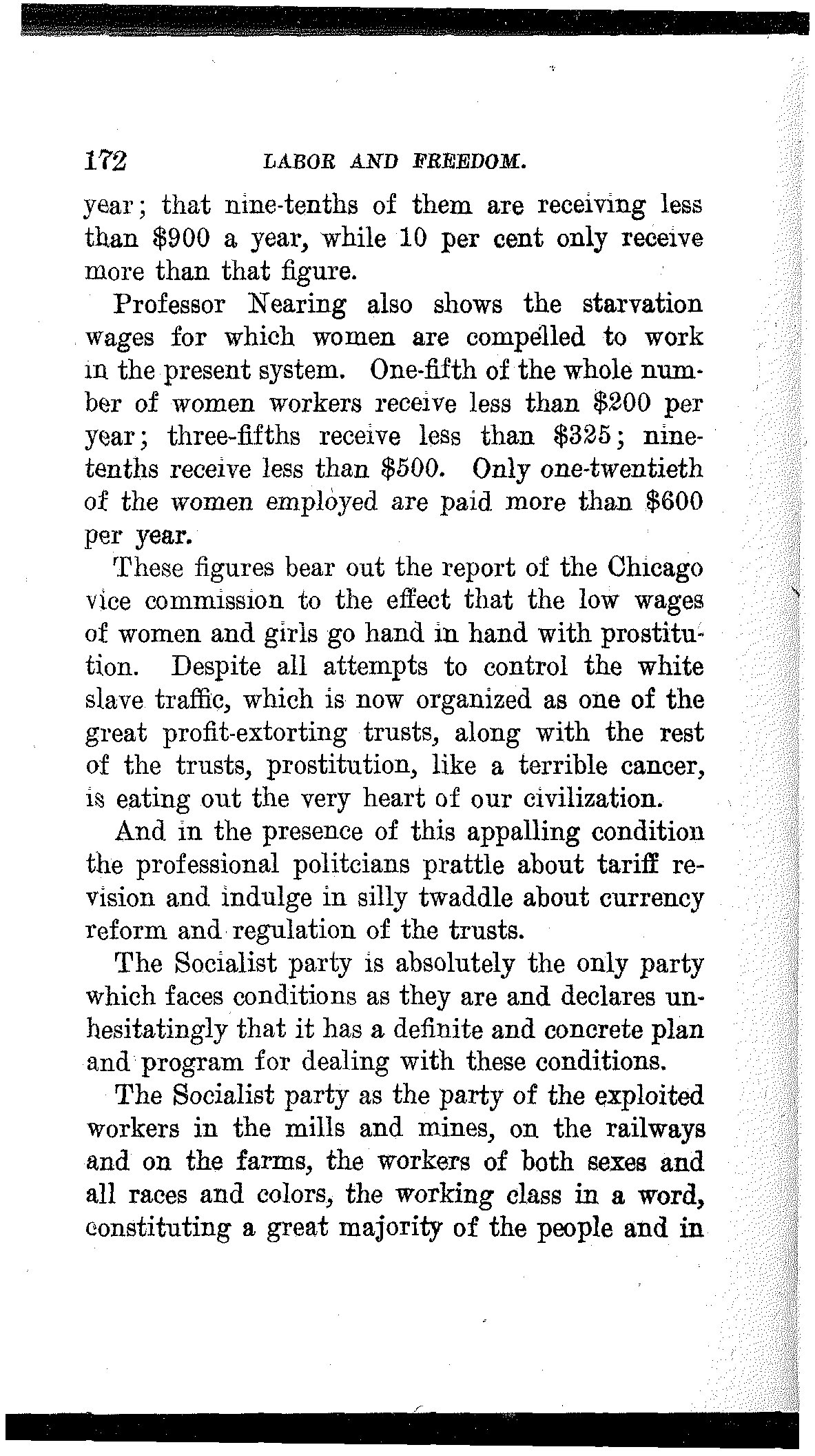 Since the foundation of the government one or the other of these capitalist parties has been in power and under their administration the working and producing millions have been reduced to poverty and slavery. Professor Scott Nearing has shown in his work on the wages of American workers that half of the adult males of the United States are earning less than $500; that three-quarters of them are earning less than $600 a[172] year; that nine-tenths of them are receiving less than $900 a year, while 10 per cent only receive more than that figure.