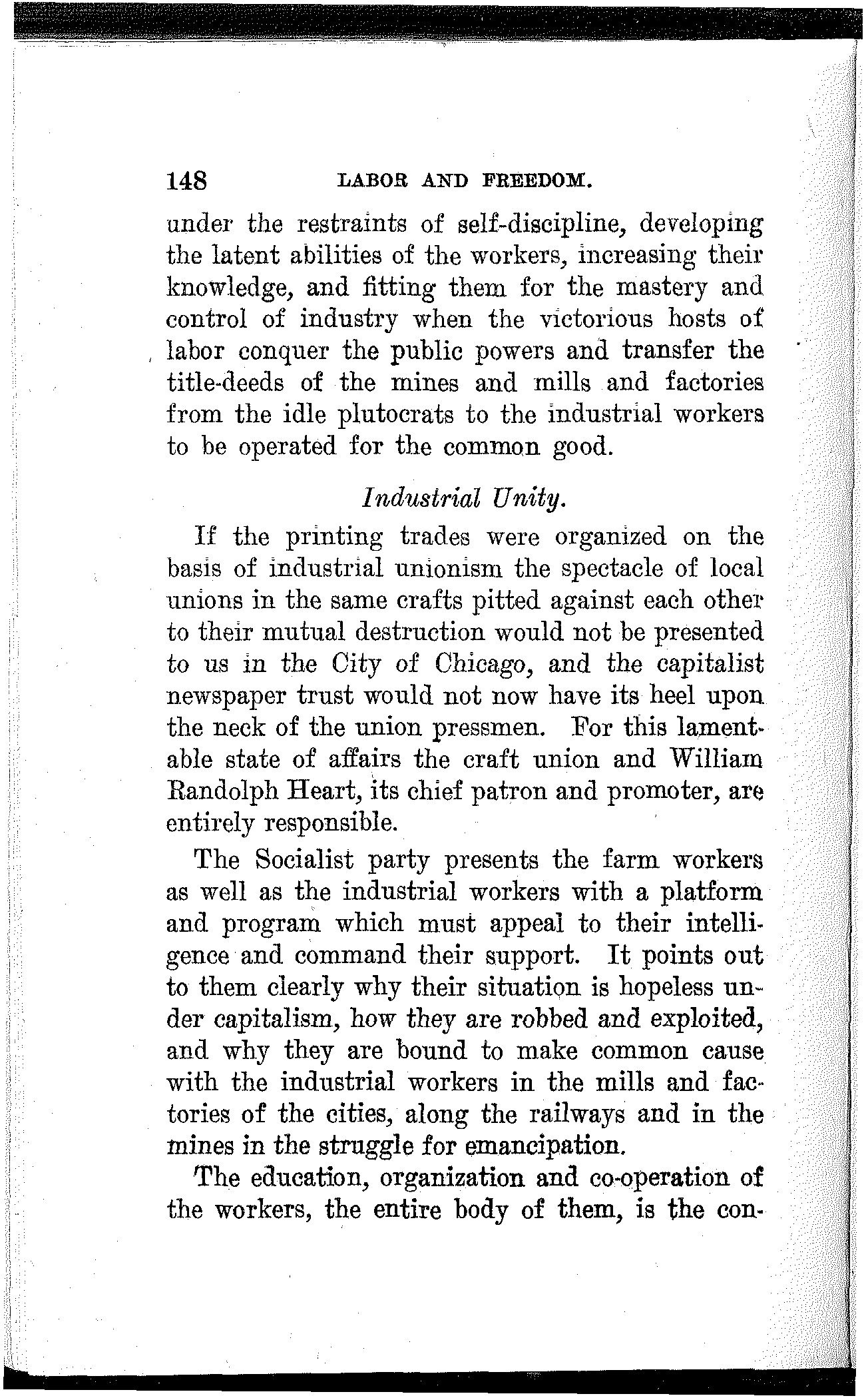 The economic organization and the political party of the working class must both be revolutionary[165] and they must work together hand in hand. Industrial unionism means industrial solidarity, but craft unionism means division and disaster. The printing trades pitted against each other in Chicago in their struggle with the newspaper trust furnish a fatal illustration of the weakness and treachery of craft division in the present industrial conflict.
