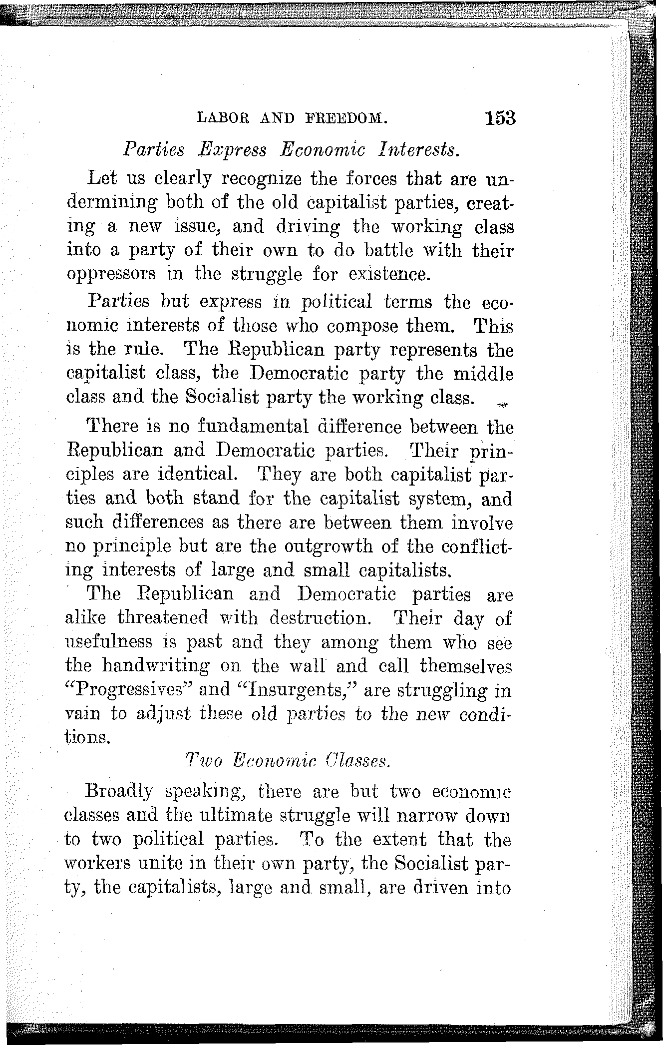 The Republican, Democratic and Progressive parties uphold the wage system; the Socialist party demands its overthrow.