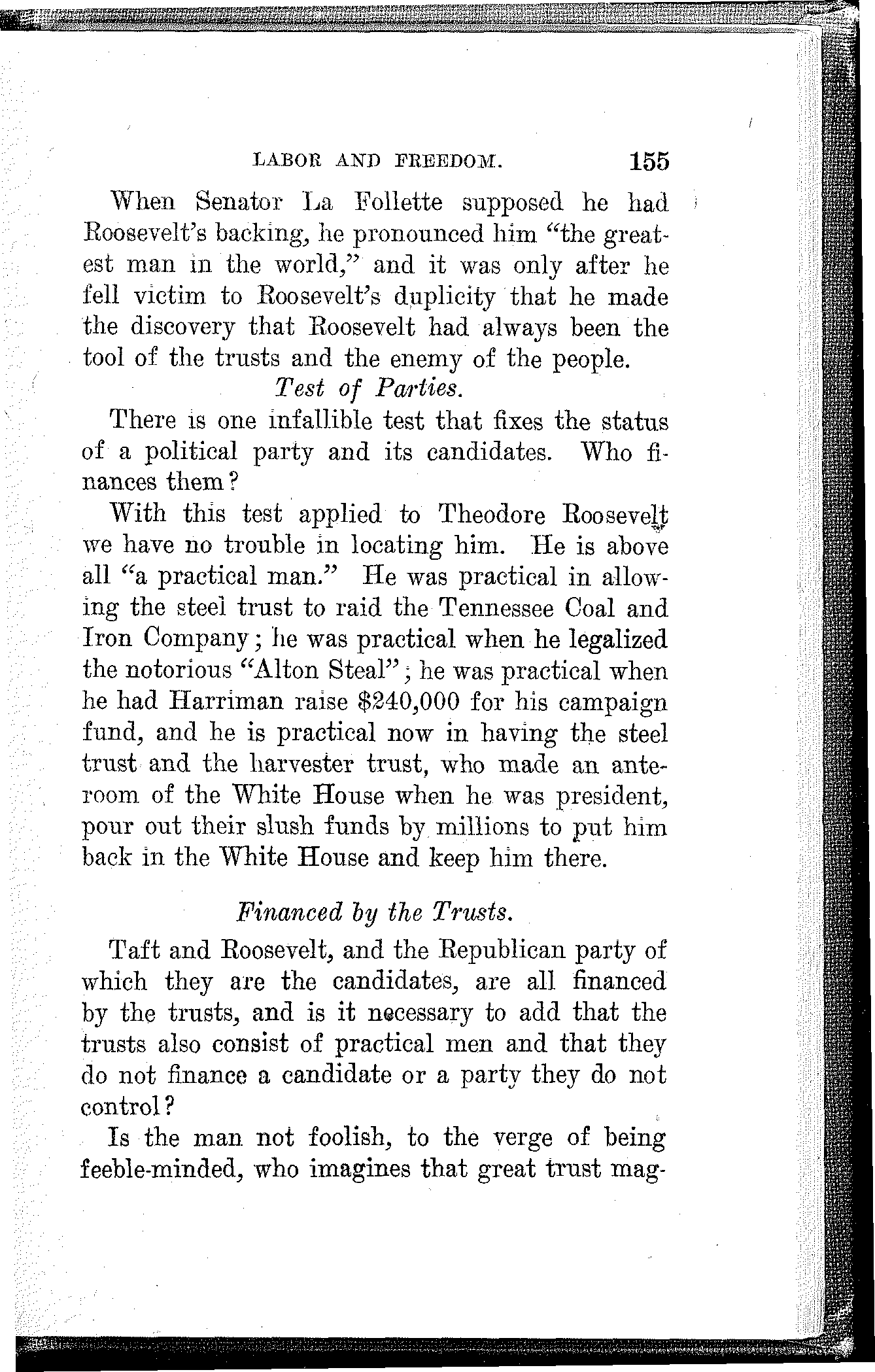 As for the so-called Progressive convention, it is sufficient to say that there is no attempt to conceal the fact that it was financed and controlled by three conspicuous representatives of the plutocracy which largely owns and rules the land.