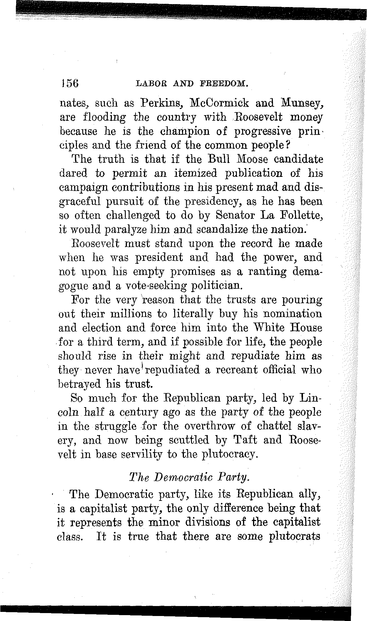 Political parties are responsive to the interests of those who finance them. This is the infallible test of their character and applied to the Republican, Democratic and Progressive parties, these parties stand forth as the several political expressions of the several divisions of the capitalist class. The funds of all these parties are furnished by the capitalist class for the reason, and only for the reason, that they represent the interests of that class.