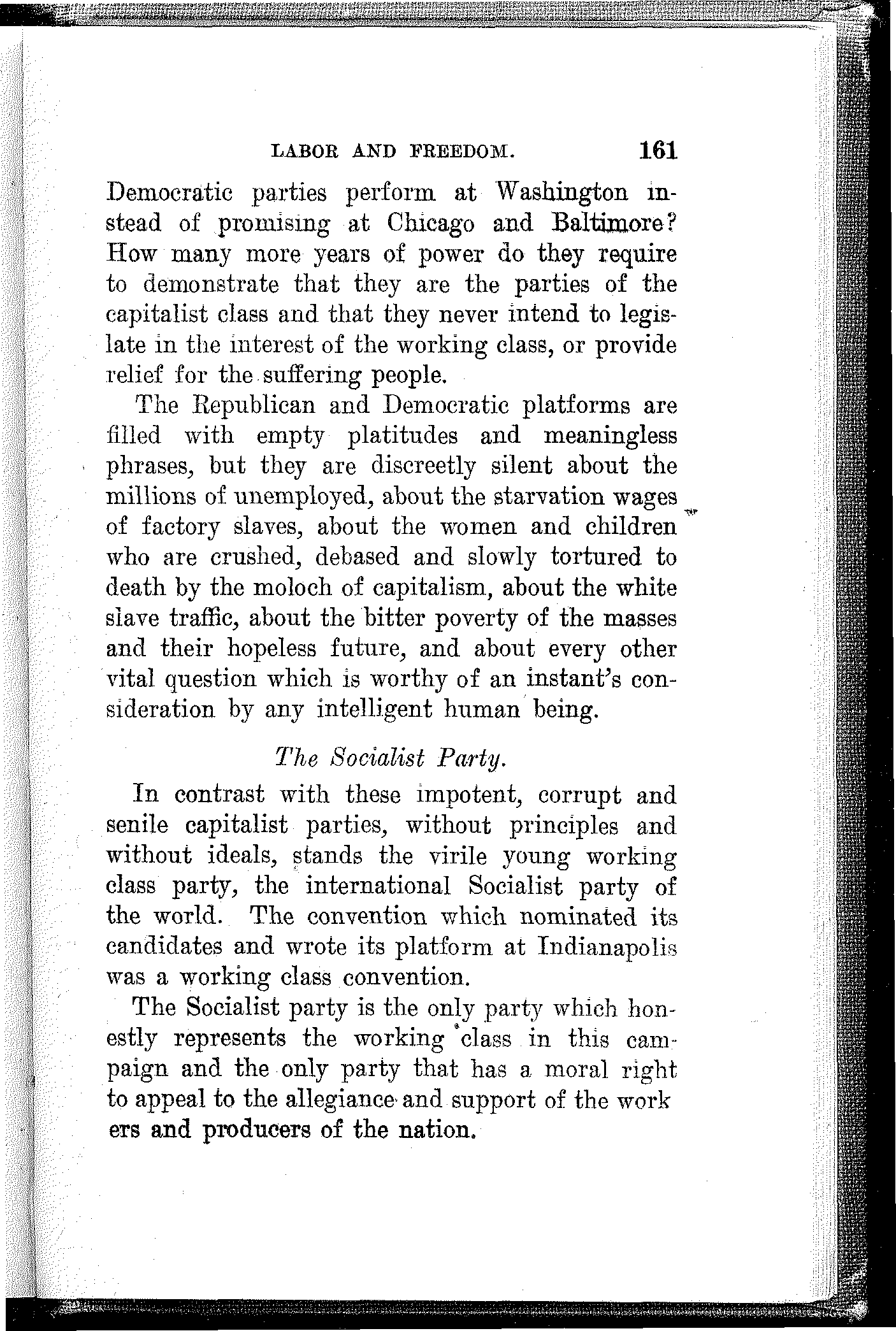 The Socialist party is the only party which honestly represents the working class in this campaign and the only party that has a moral right to appeal to the allegiance and support of the workers and producers of the nation.
