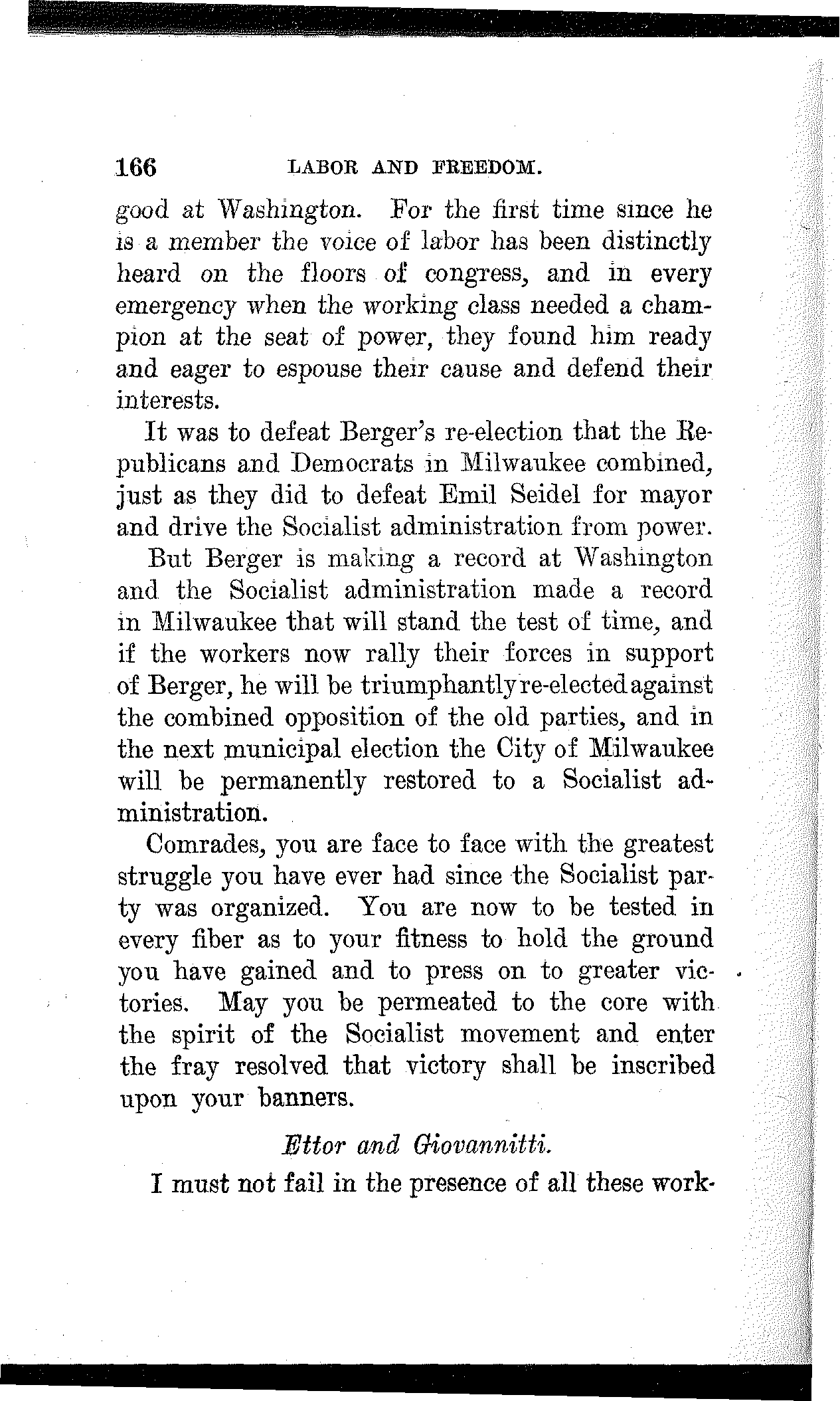 The workers of Milwaukee have to an exceptional extent overcome the obstacles to unity and have worked together with signal success on both the economic and political fields. I appeal to them in the name of the future to get closer and closer together in the bonds of economic and political solidarity. If they do this their complete and final victory is assured.