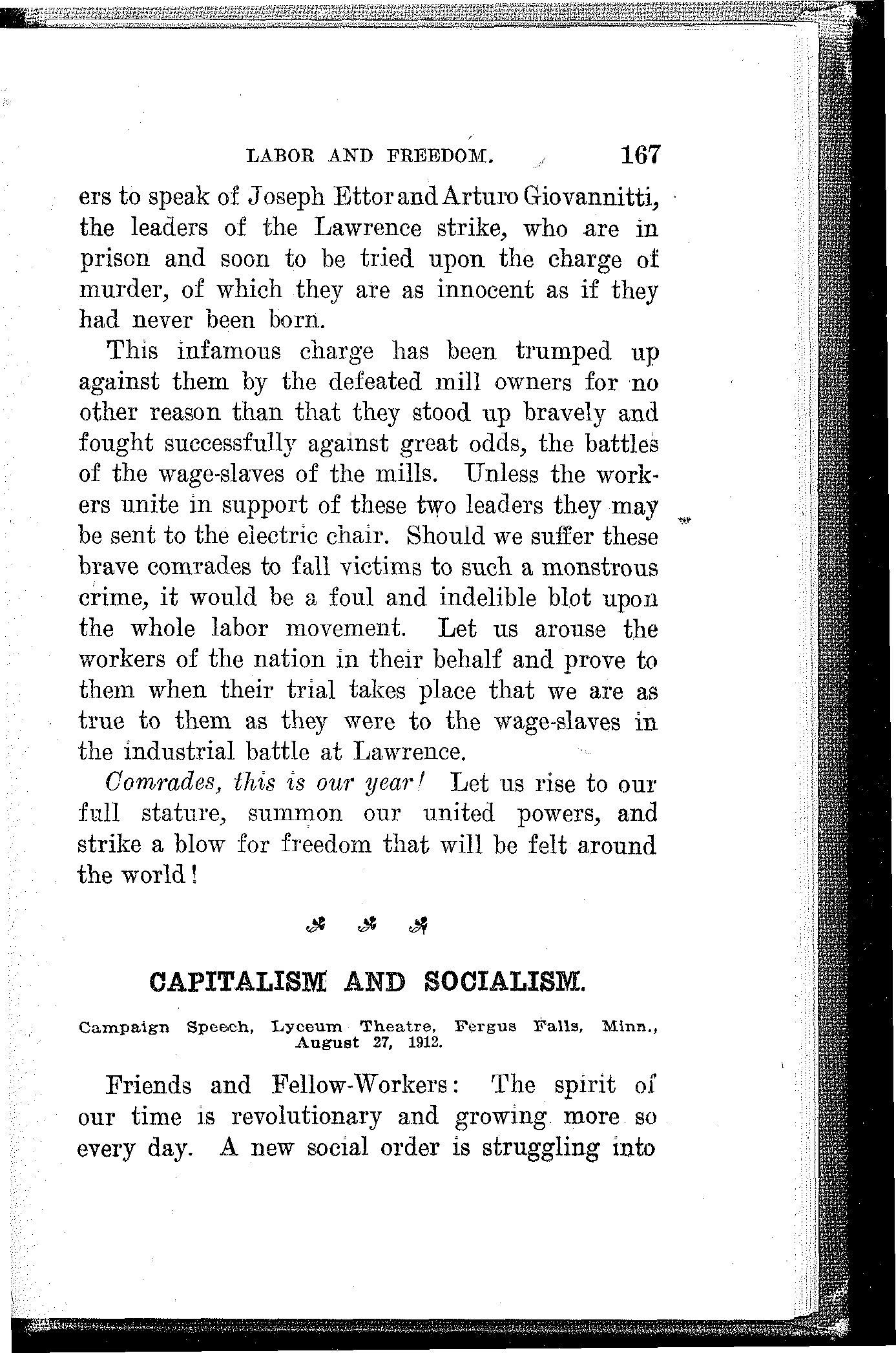 I must not fail in the presence of all these [167]workers to speak of Joseph Ettor and Arturo Giovannitti, the leaders of the Lawrence strike, who are in prison and soon to be tried upon the charge of murder, of which they are as innocent as if they had never been born.