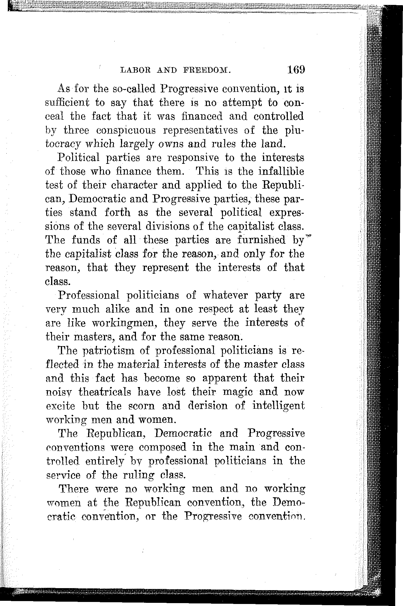 The Republican, Democratic and Progressive conventions were composed in the main and controlled entirely by professional politicians in the service of the ruling class.