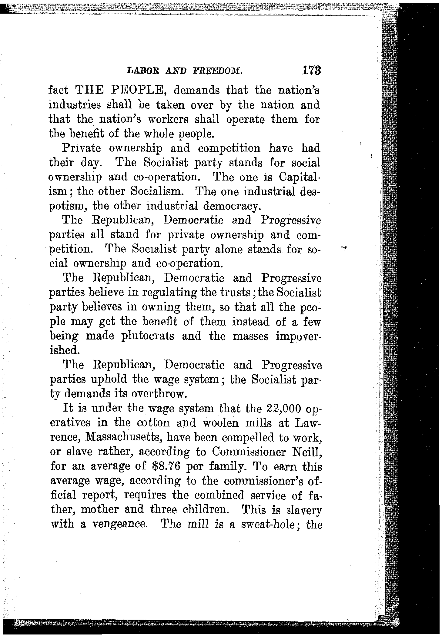 It is under the wage system that the 22,000 operatives in the cotton and woolen mills at Lawrence, Massachusetts, have been compelled to work, or slave rather, according to Commissioner Neill, for an average of $8.76 per family. To earn this average wage, according to the commissioner's official report, requires the combined service of father, mother and three children. This is slavery with a vengeance. The mill is a sweat-hole; the[174] hovel a breeding-pen. Home there is none. And there never will be under the wage system.