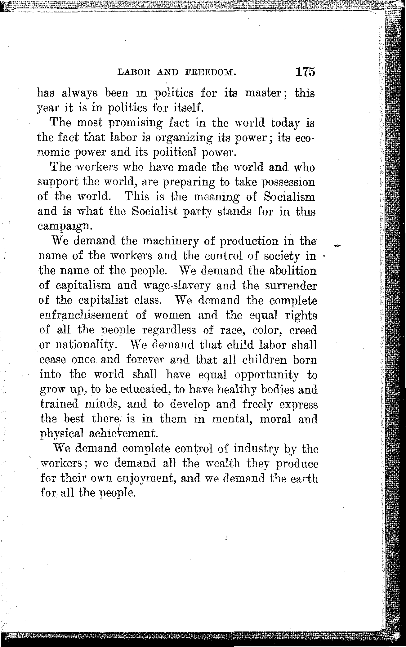 We demand the machinery of production in the name of the workers and the control of society in the name of the people. We demand the abolition of capitalism and wage-slavery and the surrender of the capitalist class. We demand the complete enfranchisement of women and the equal rights of all the people regardless of race, color, creed or nationality. We demand that child labor shall cease once and forever and that all children born into the world shall have equal opportunity to grow up, to be educated, to have healthy bodies and trained minds, and to develop and freely express the best there is in them in mental, moral and physical achievement.